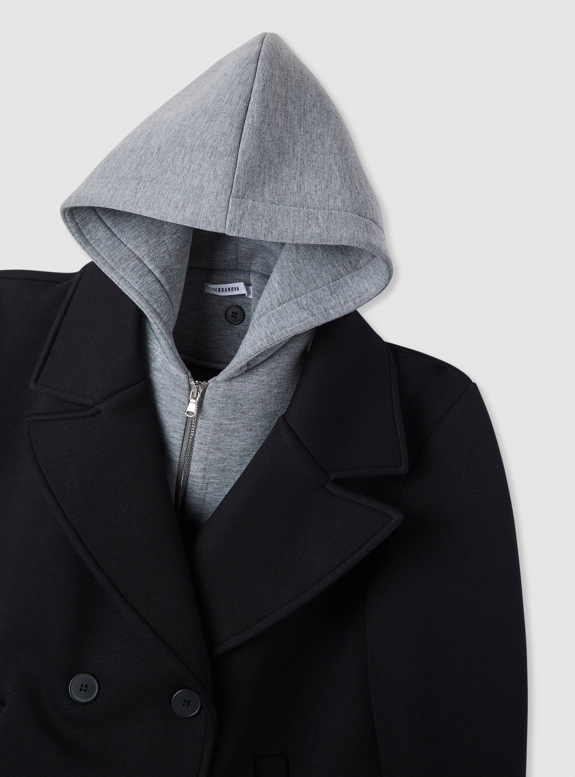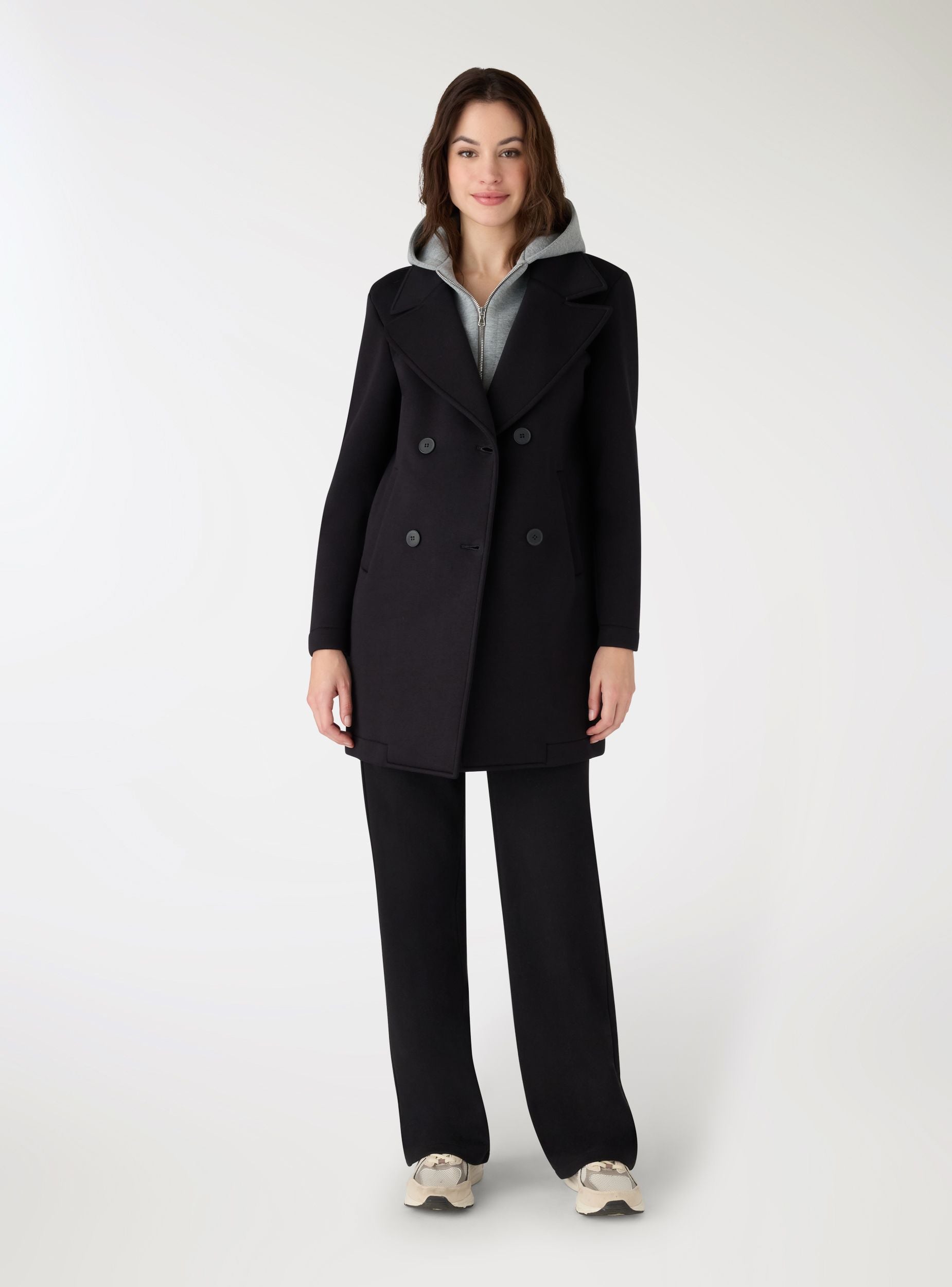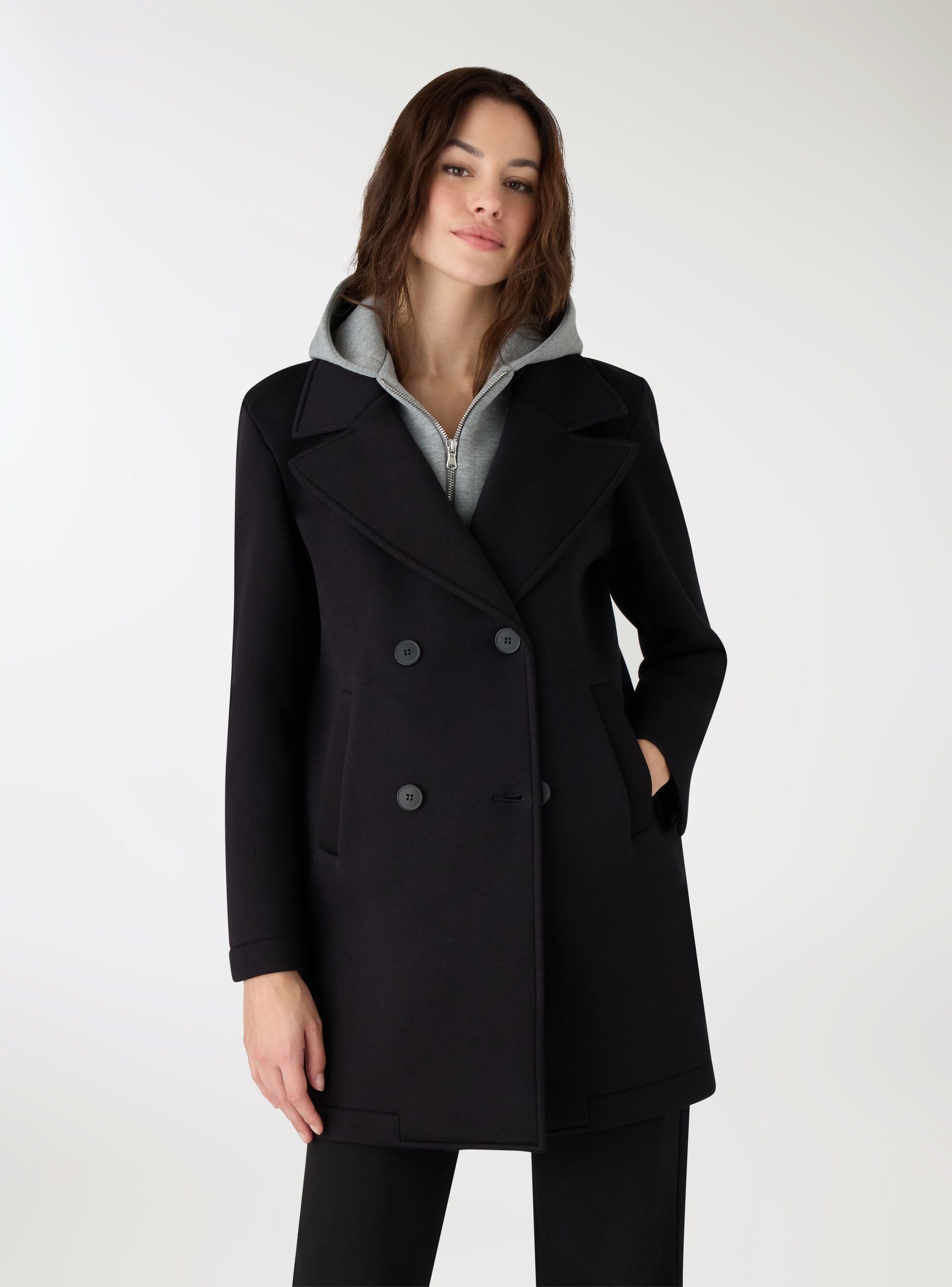 Trench da donna a tinta unita con design doppiopetto e cappuccio felpa. Linea regolare, revers ampi e chiusura a bottoni sul davanti. Tasche laterali a filetto per tenere l’essenziale. Perfetto per look urbani su maglietta e jeans o per l’ufficio con camicia e pantaloni. Ideale nelle mezze stagioni grazie allo stile versatile.Dettagli
