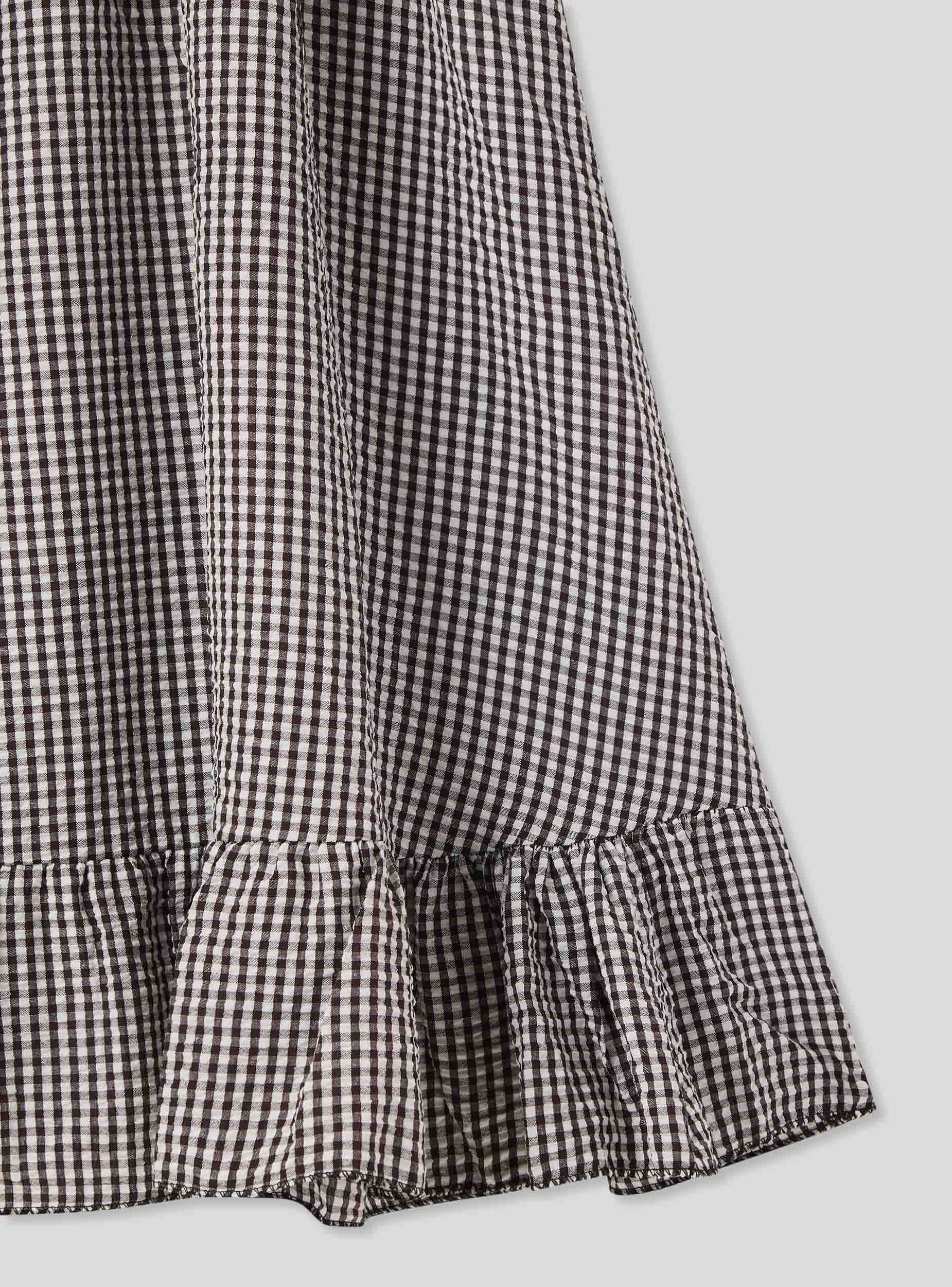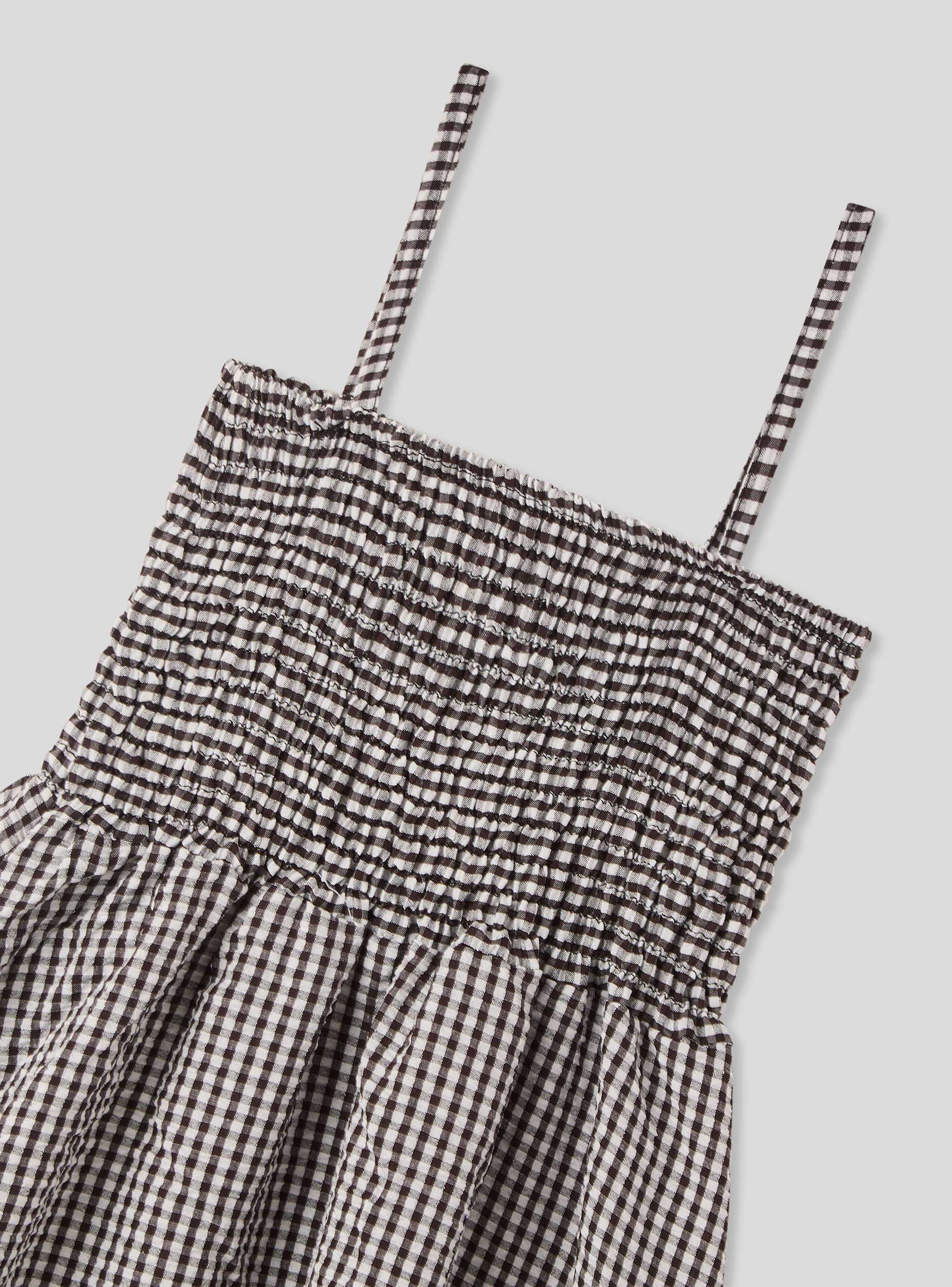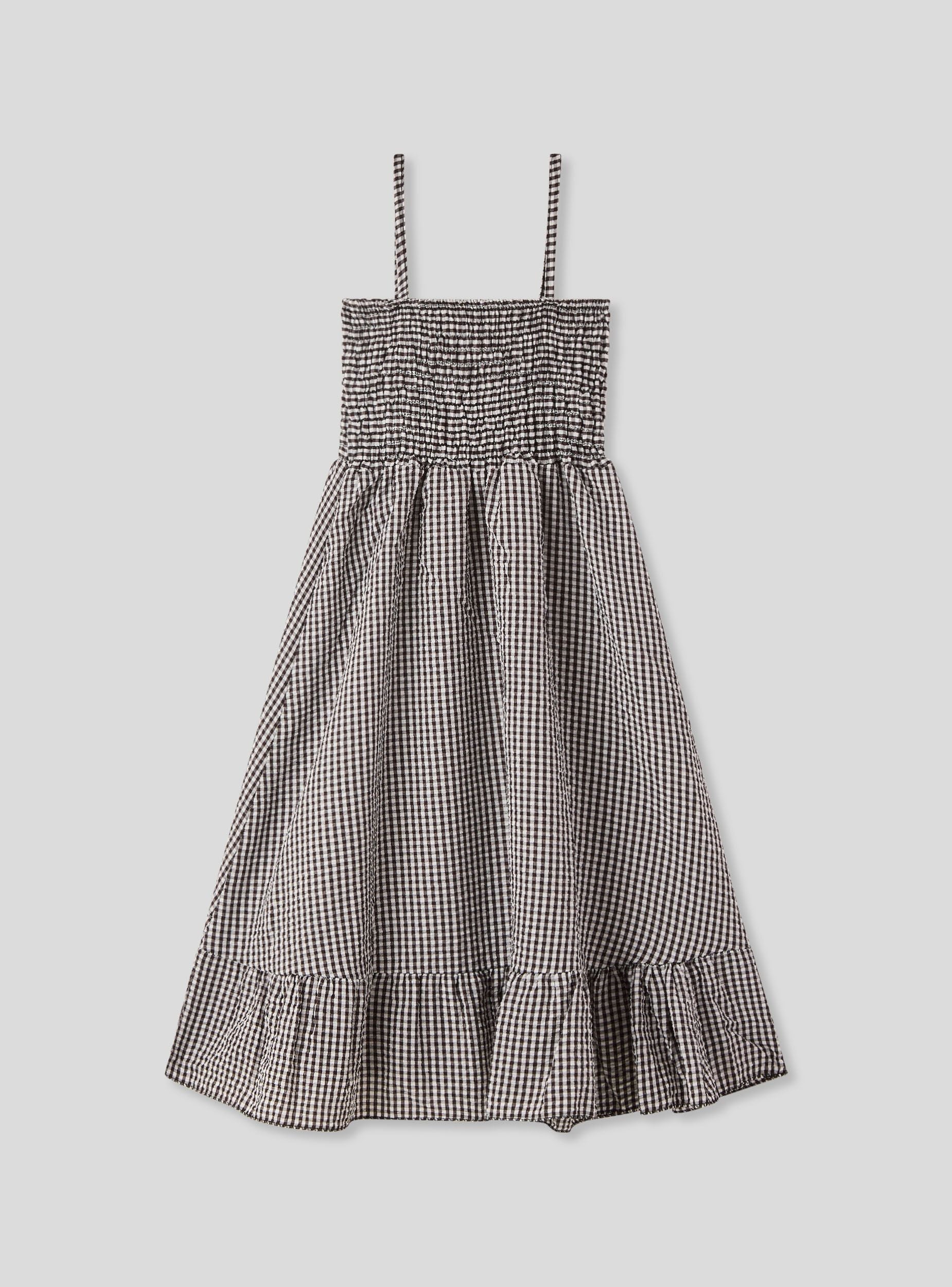Abito da bambina con fantasia a quadri, ideale per giornate casual e rilassate. Presenta spalline sottili e una vestibilitá comoda, con dettagli arricciati sul corpetto che aggiungono un tocco di stile. La gonna è ampia e arricciata, perfetta per garantire libertà di movimento. Un capo versatile che si abbina facilmente a sandali o scarpe sportive per un look fresco e giocoso.Dettagli