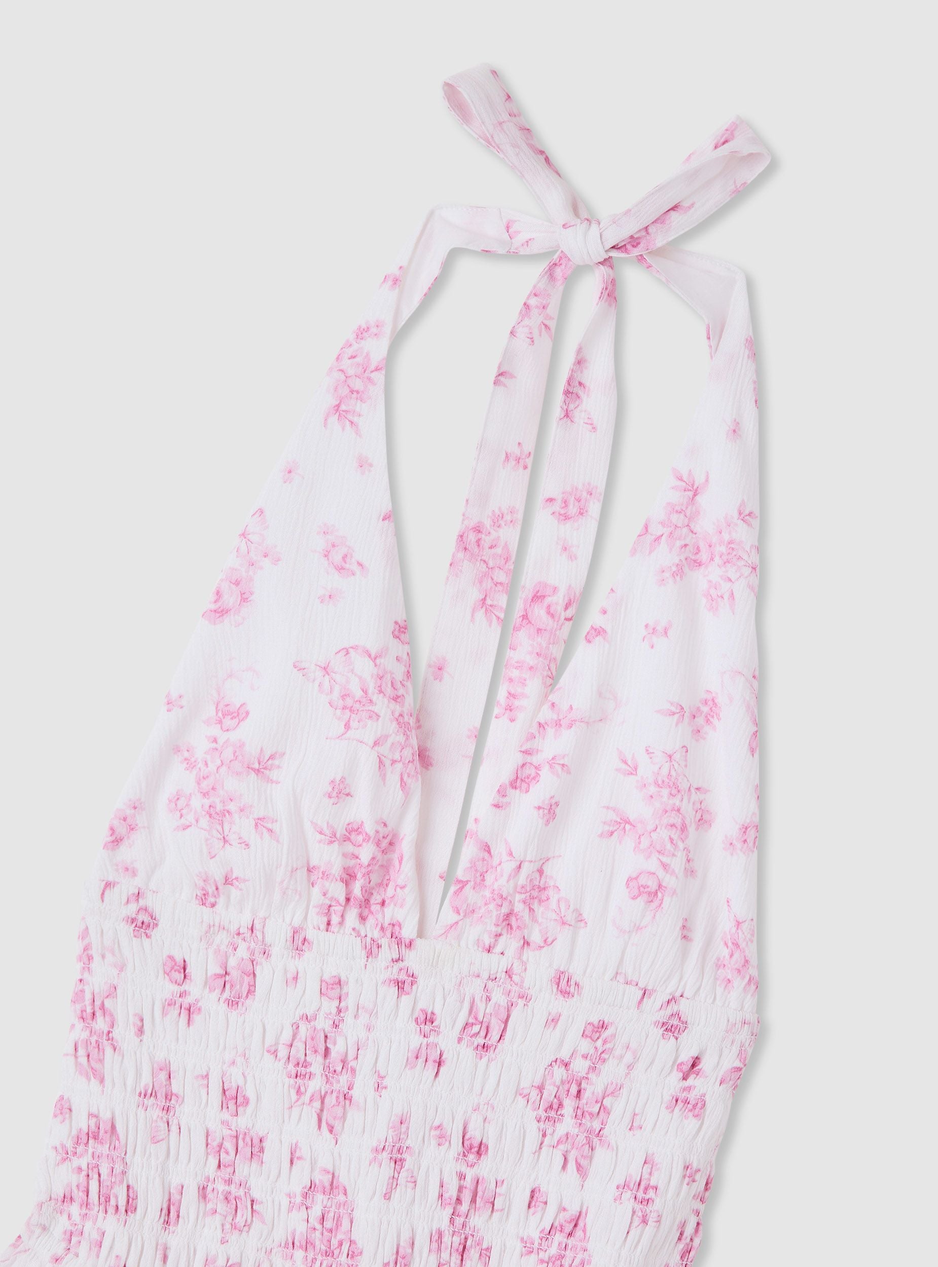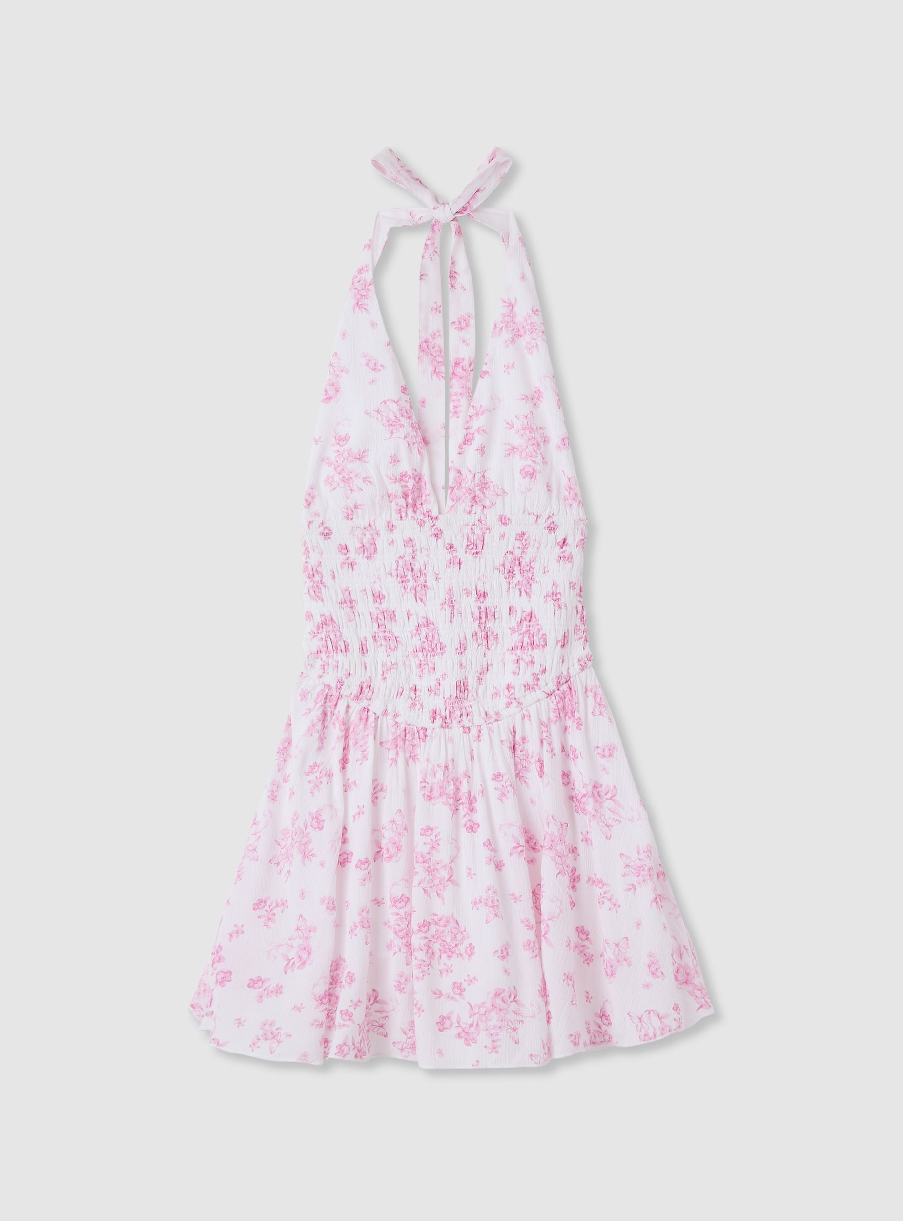 Abito da donna con stampa fiori e scollo halterneck con laccetti da annodare al collo. Corpetto con arricciatura elasticizzata che valorizza la silhouette e gonna svasata dal movimento leggero in lunghezza mini. Ideale con sandali e borsa a mano per giornate estive, aperitivi o vacanze.Dettagli