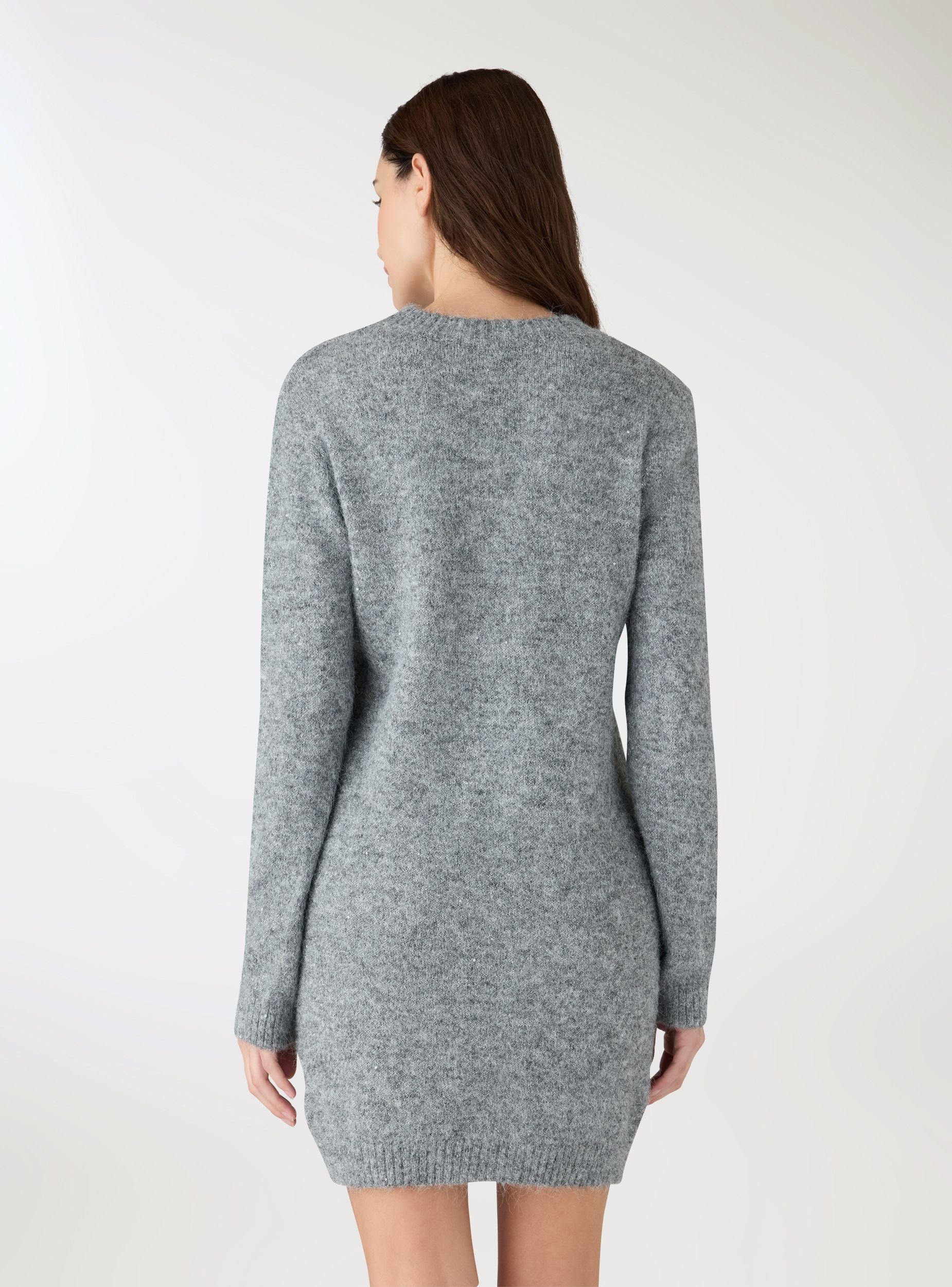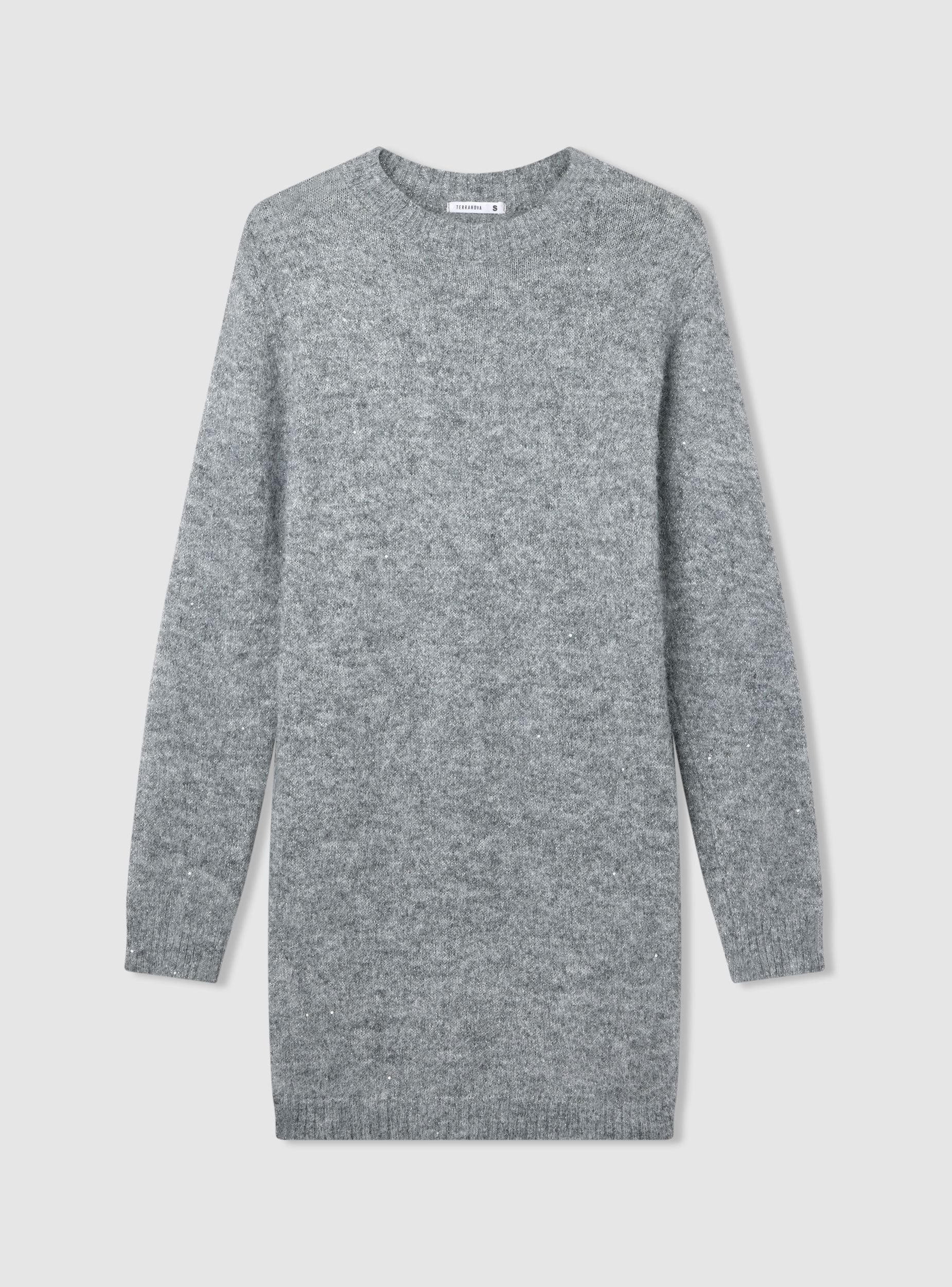 Abito da donna in maglia a tinta unita con effetto luccicante. Modello a maniche lunghe e collo tondo, dal taglio regolare perfetto per serate e uscite informali. Facile da abbinare a stivali alti o anfibi e a un cappotto lungo. Polsini e fondo lavorati a costine che definiscono la linea e offrono comfort. Indosso versatile per look trendy e femminili.Dettagli