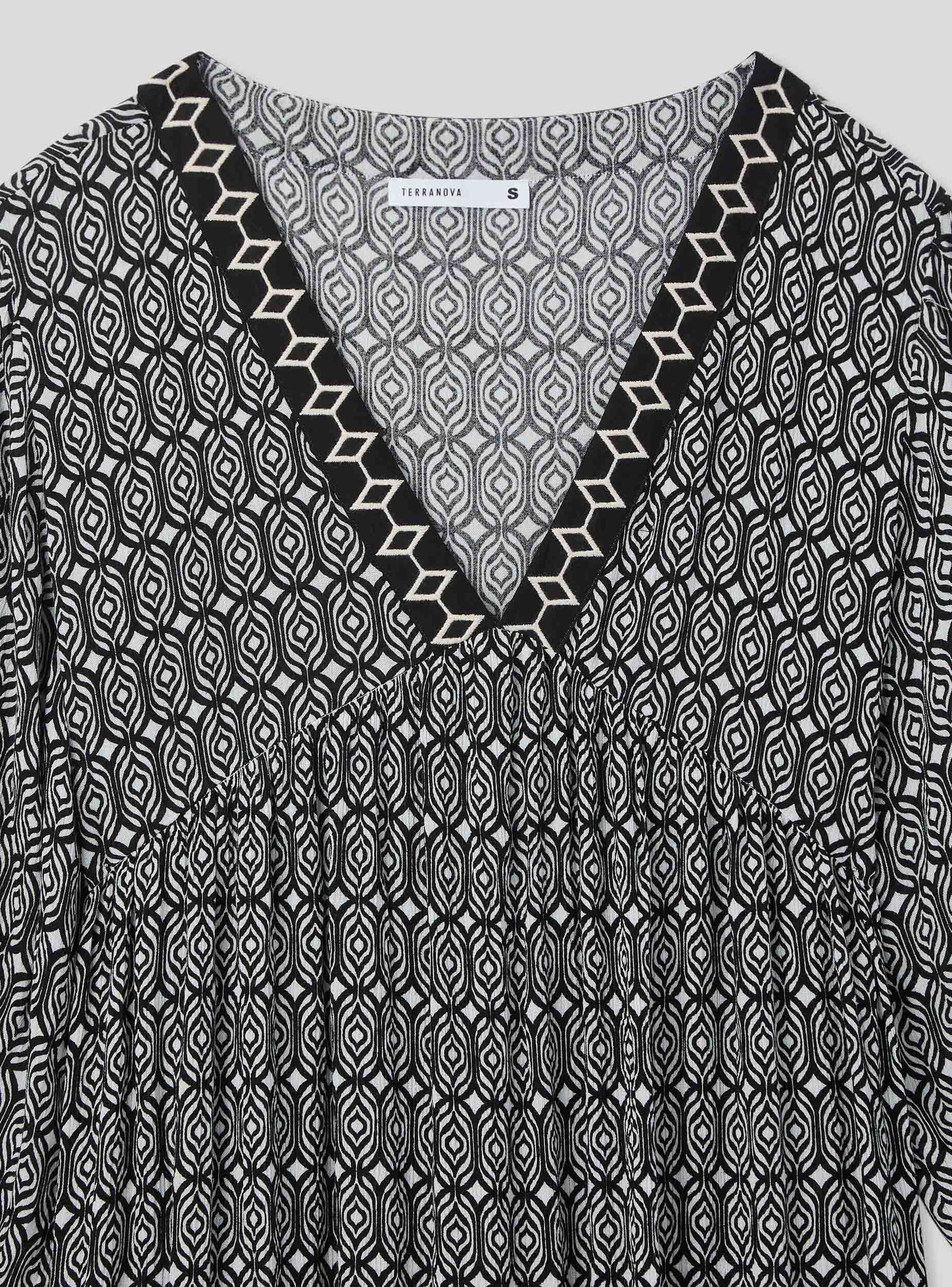 Abito da donna con fantasia geometrica all-over, caratterizzato da uno scollo a V con dettagli decorativi. Le maniche sono lunghe e presentano una leggera arricciatura ai polsi, mentre la parte inferiore dell'abito è ampia e fluente, grazie ai diversi livelli di arricciature, che donano movimento e leggerezza. Perfetto per un look casual ma raffinato, adatto a diverse occasioni, abbinabile sia con sandali che con stivaletti per un outfit versatile e ricercato.Dettagli