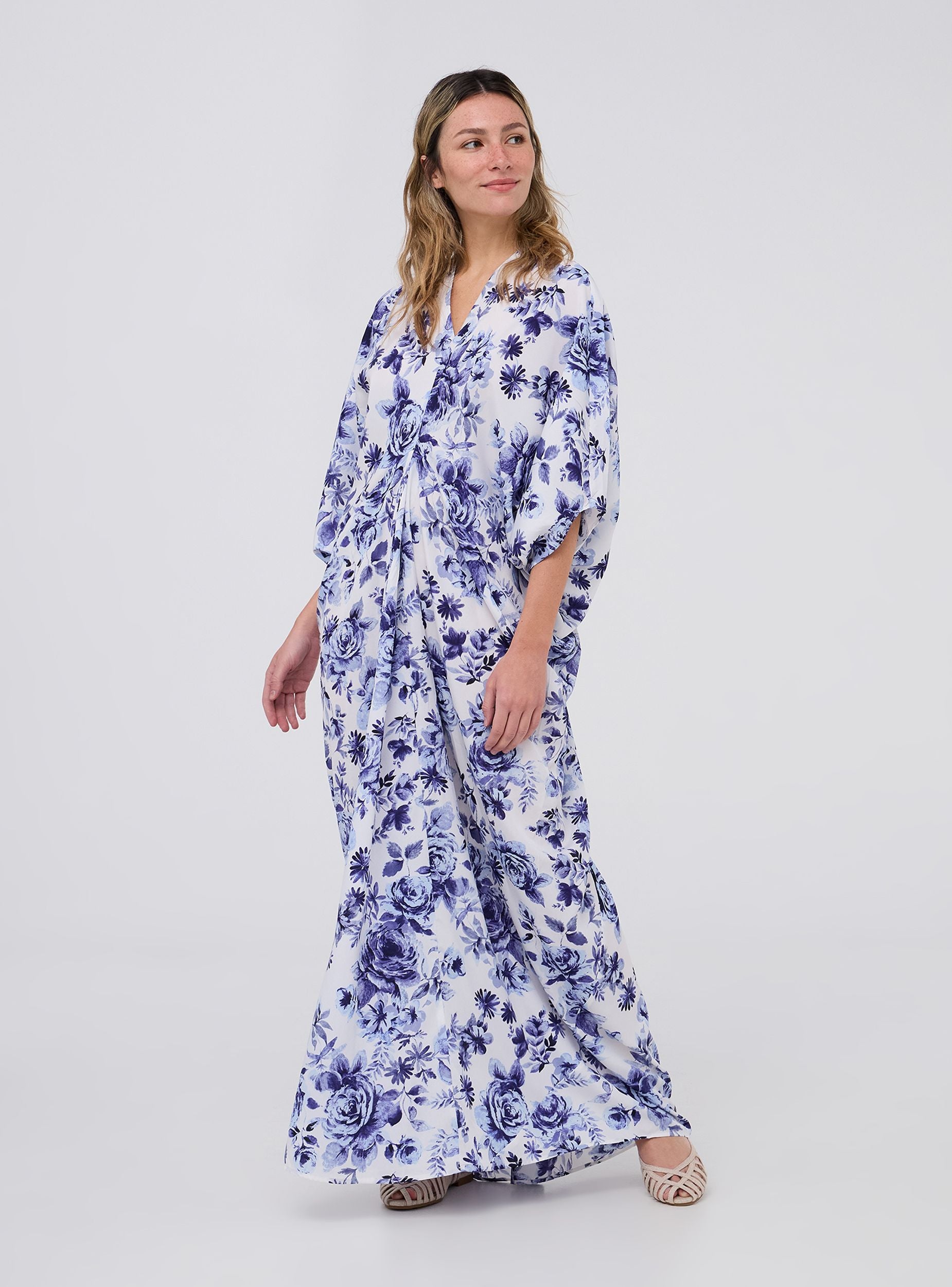 Abito da donna lungo con una fantasia floreale elegante, caratterizzato da un taglio morbido che avvolge delicatamente la silhouette. Le maniche ampie e fluide donano una sensazione di leggerezza e un tocco di femminilità sofisticata. L'abito è disegnato per garantire comodità senza rinunciare allo stile, ideale per essere indossato sia in occasioni casual che in eventi più formali.Dettagli