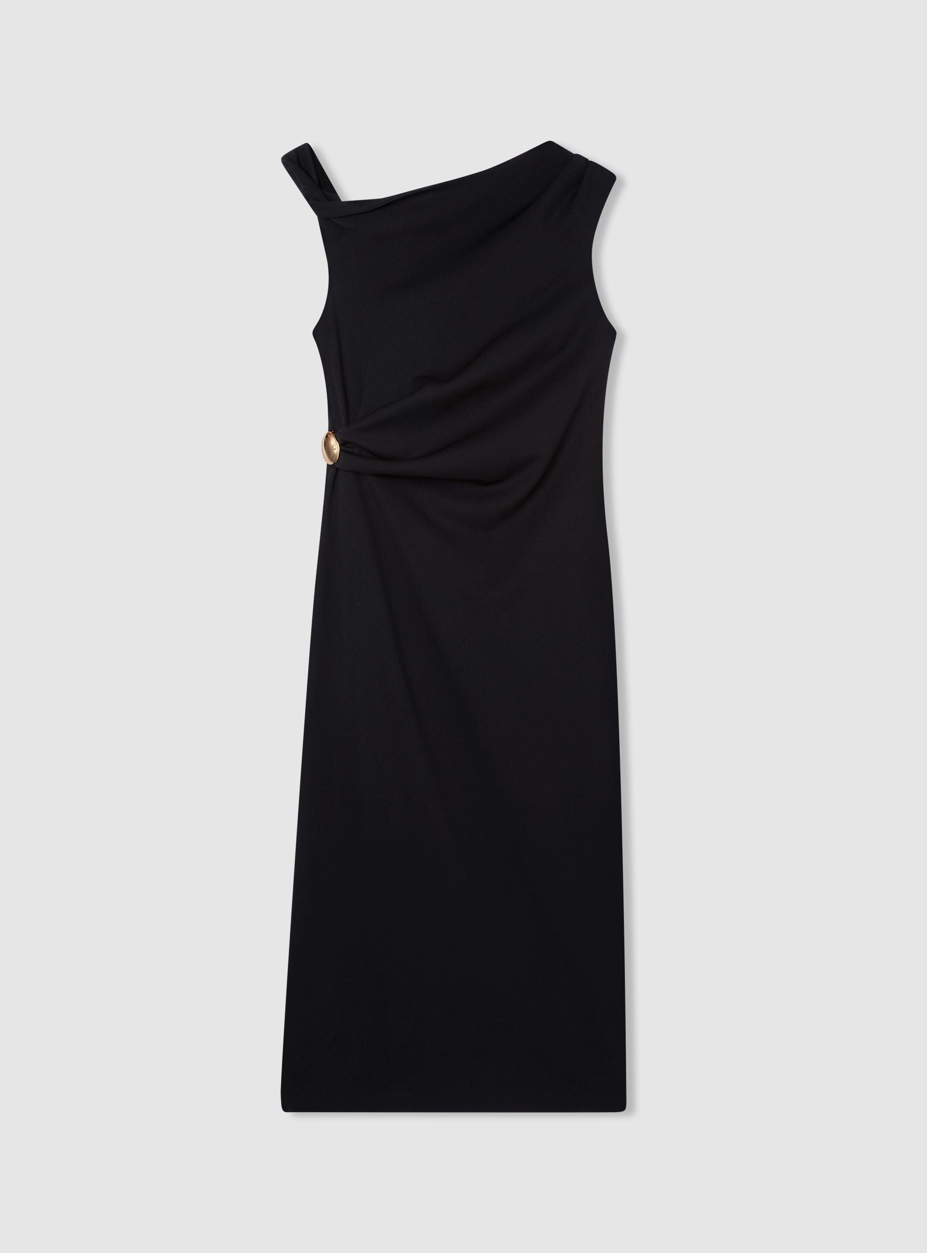 Abito da donna monospalla a tinta unita, dal design pulito con dettaglio arricciato fermato da elemento gioiello sul fianco. Linea morbida e lunghezza midi, ideale per cerimonie, serate ed eventi speciali. Lo scollo asimmetrico valorizza le spalle, mentre la silhouette morbida dona comfort e femminilità. Da abbinare a stivali alti e mini clutch per un look raffinato.Dettagli