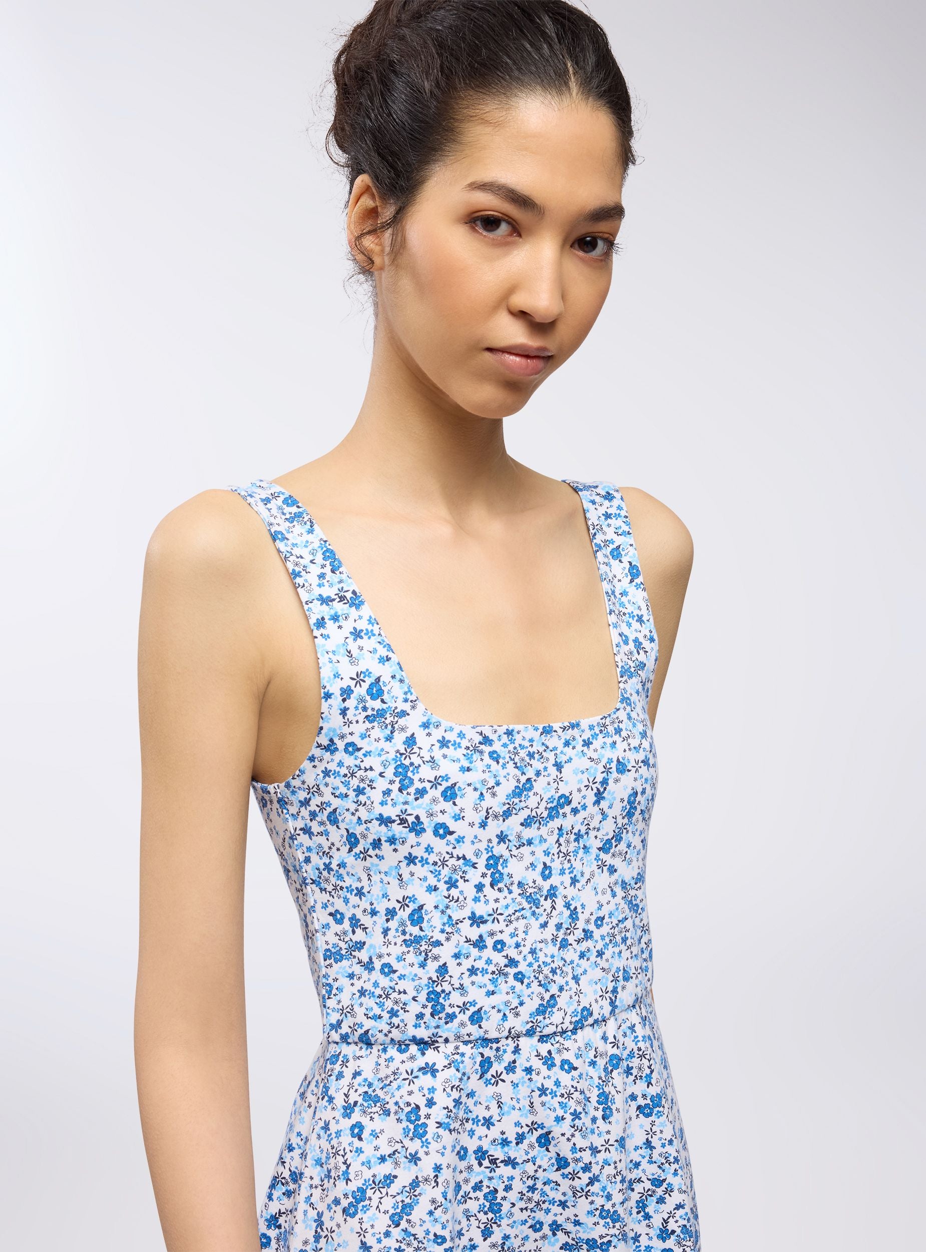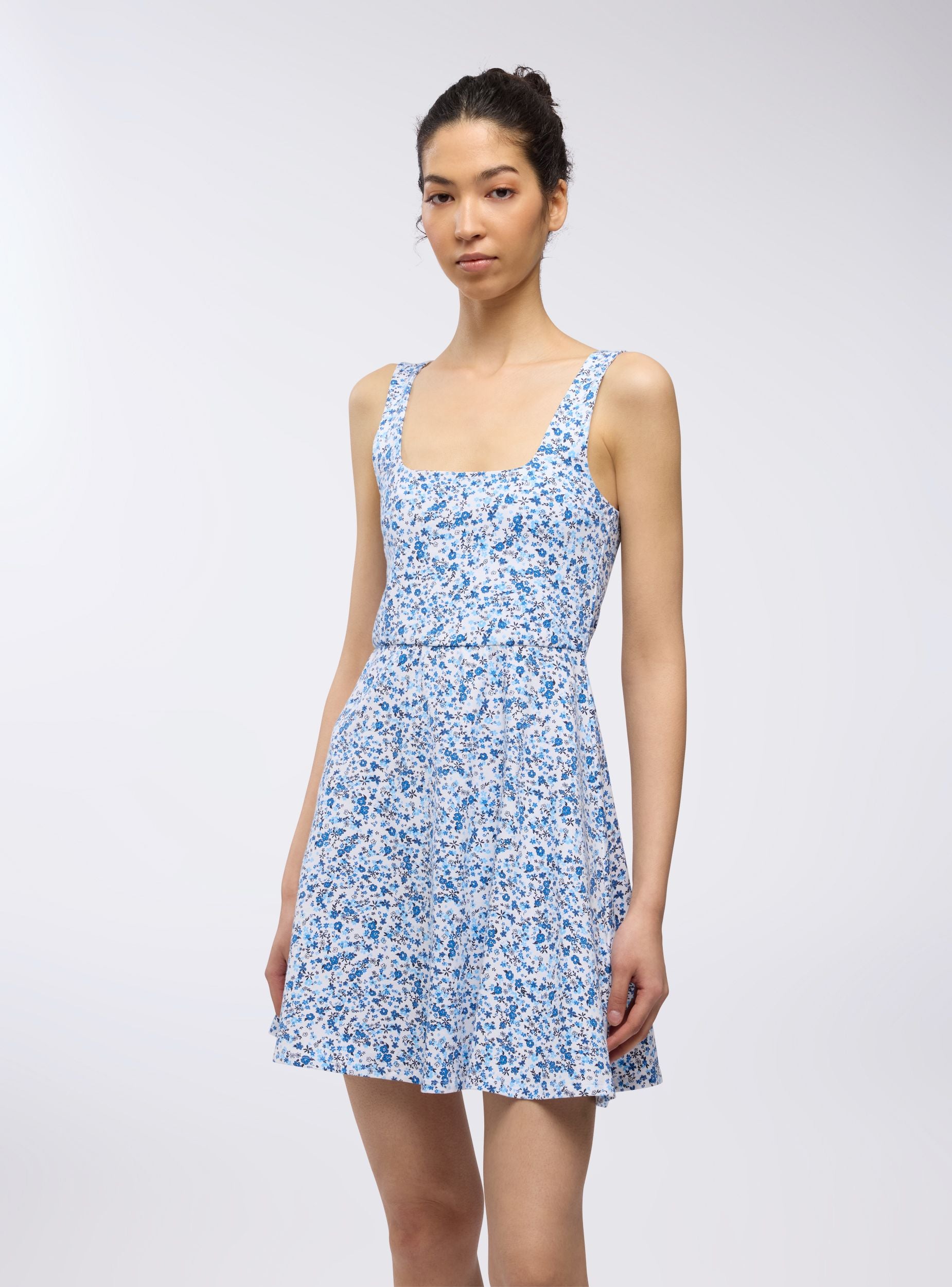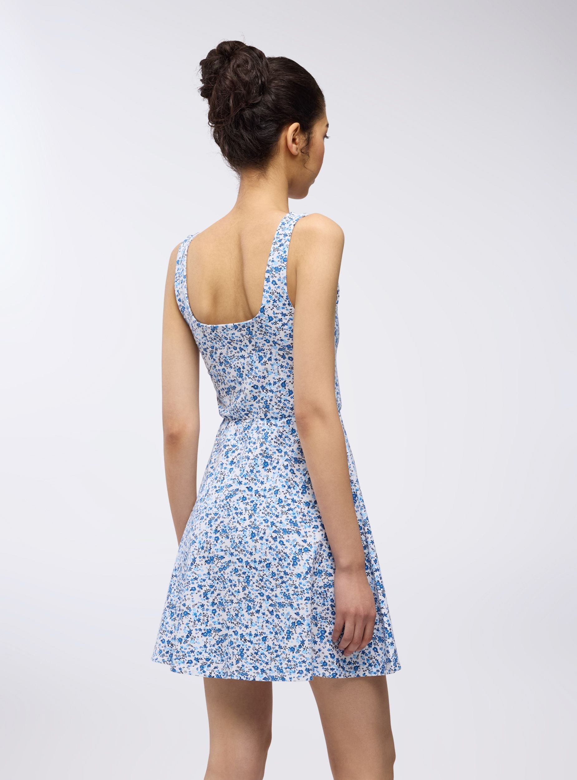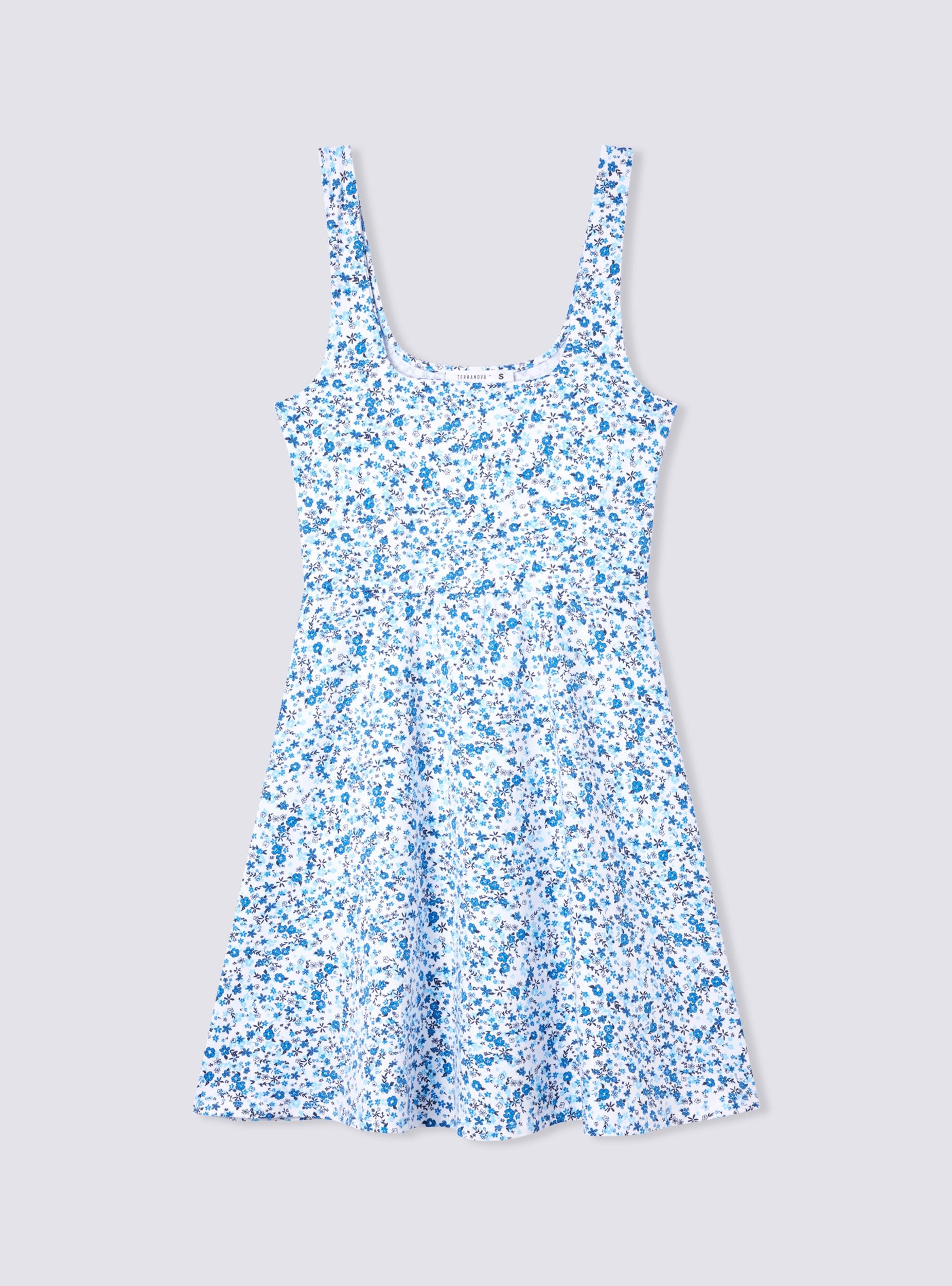 Abito da donna con stampa floreale, caratterizzato da un design corto e fresco in stile skater. Le spalline sottili aggiungono un tocco di leggerezza al capo, mentre la silhouette svasata valorizza la figura, creando movimento e un look giovanile e spensierato. La stampa floreale all-over dona un aspetto romantico, perfetto per un outfit estivo o casual. Questo abito è ideale per chi cerca un look femminile e versatile, facilmente abbinabile sia a sandali che a sneakers per diverse occasioni.Dettagli