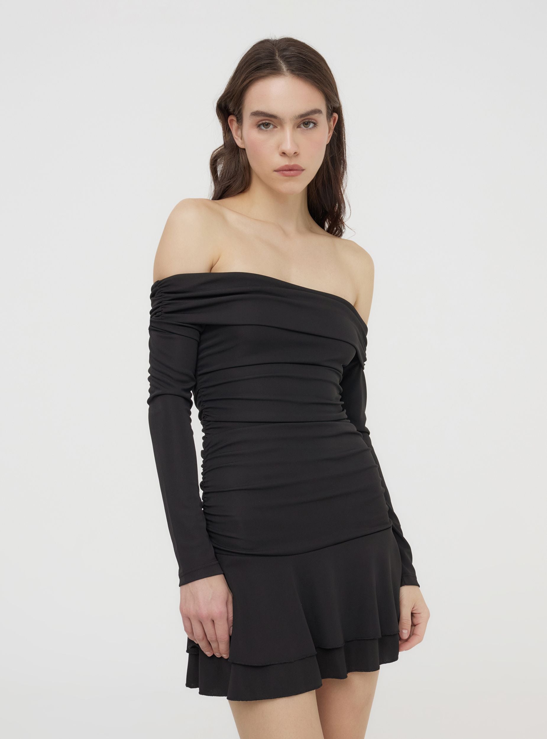 Abito da donna corto e dalla linea seducente, ideale per serate speciali, cene romantiche o eventi glamour. Il design a tinta unita esalta la silhouette, mentre le spalle scoperte aggiungono un tocco sofisticato. Le arricciature lungo il busto valorizzano le forme, creando un effetto avvolgente. Le maniche lunghe donano eleganza, mentre la balza sulla gonna regala movimento. Perfetto con tacchi e accessori luminosi.Dettagli