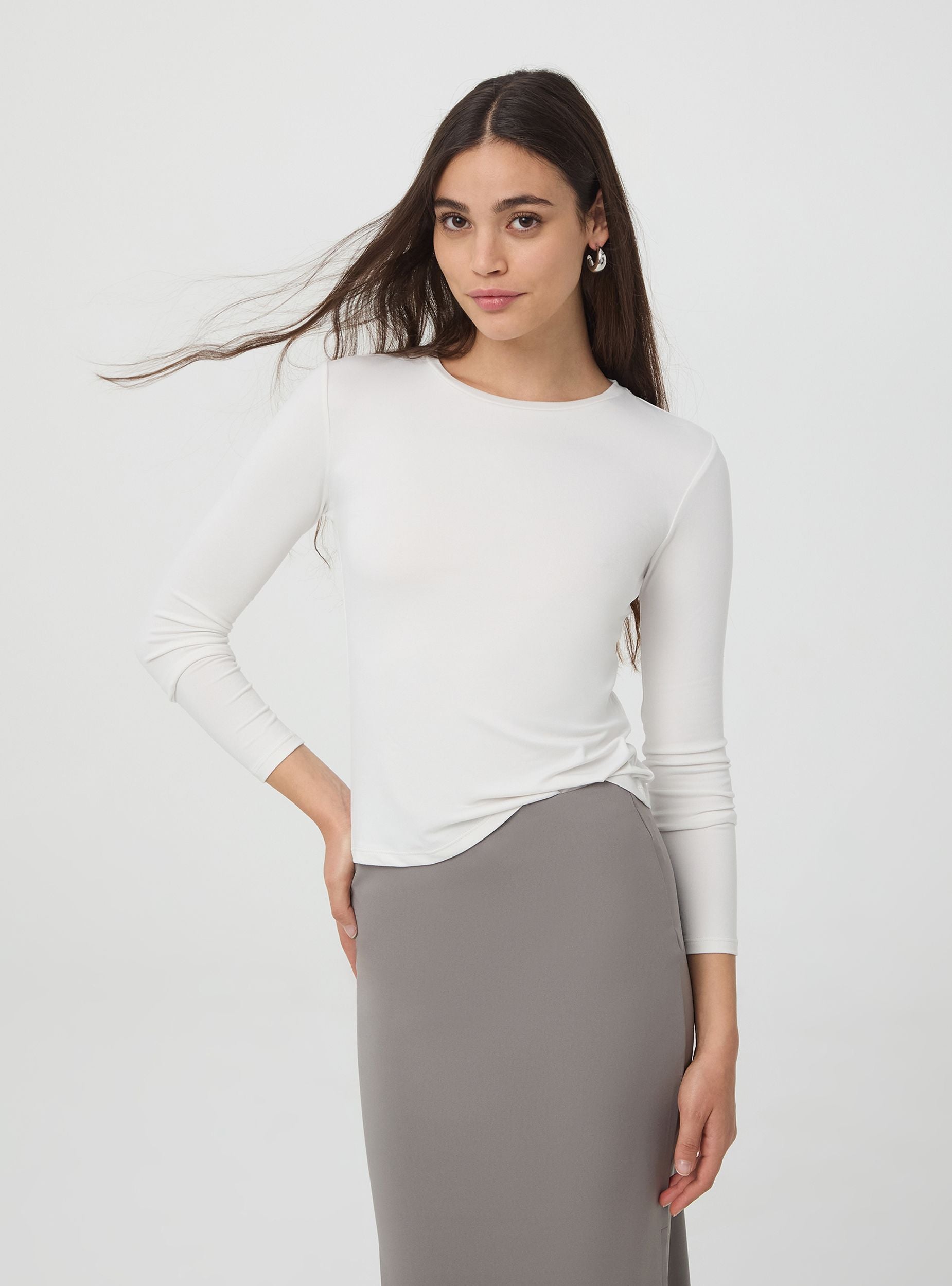 Bluză damă cu mâneci lungi și guler rotund, confecționată din material elastic uni. Un articol basic care se potrivește oricărui stil și ocazii. Croială regular. Această tricou este un element esențial în garderoba oricărei femei, ideal de purtat singur sau ca bază sub jachete, pulovere sau hanorace. Perfect pentru un look casual zilnic, este potrivit pentru muncă, timpul liber și activități în aer liber. Simplitatea și versatilitatea sa îl fac potrivit pentru orice stil și ocazie.Detalii