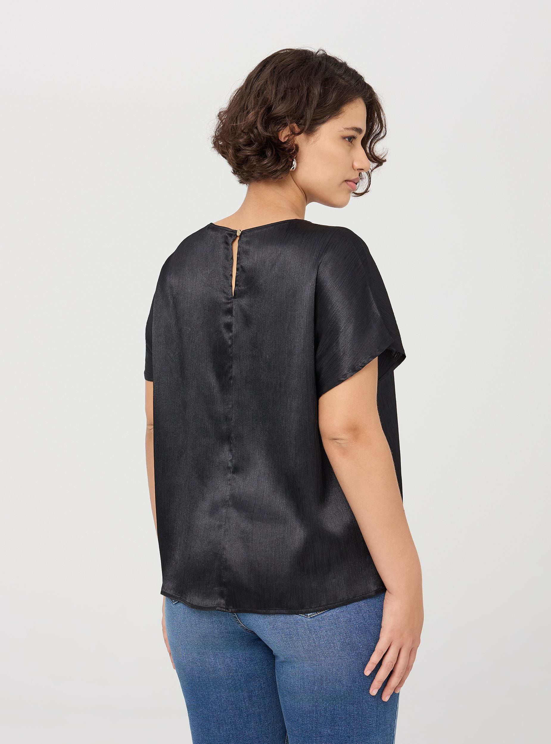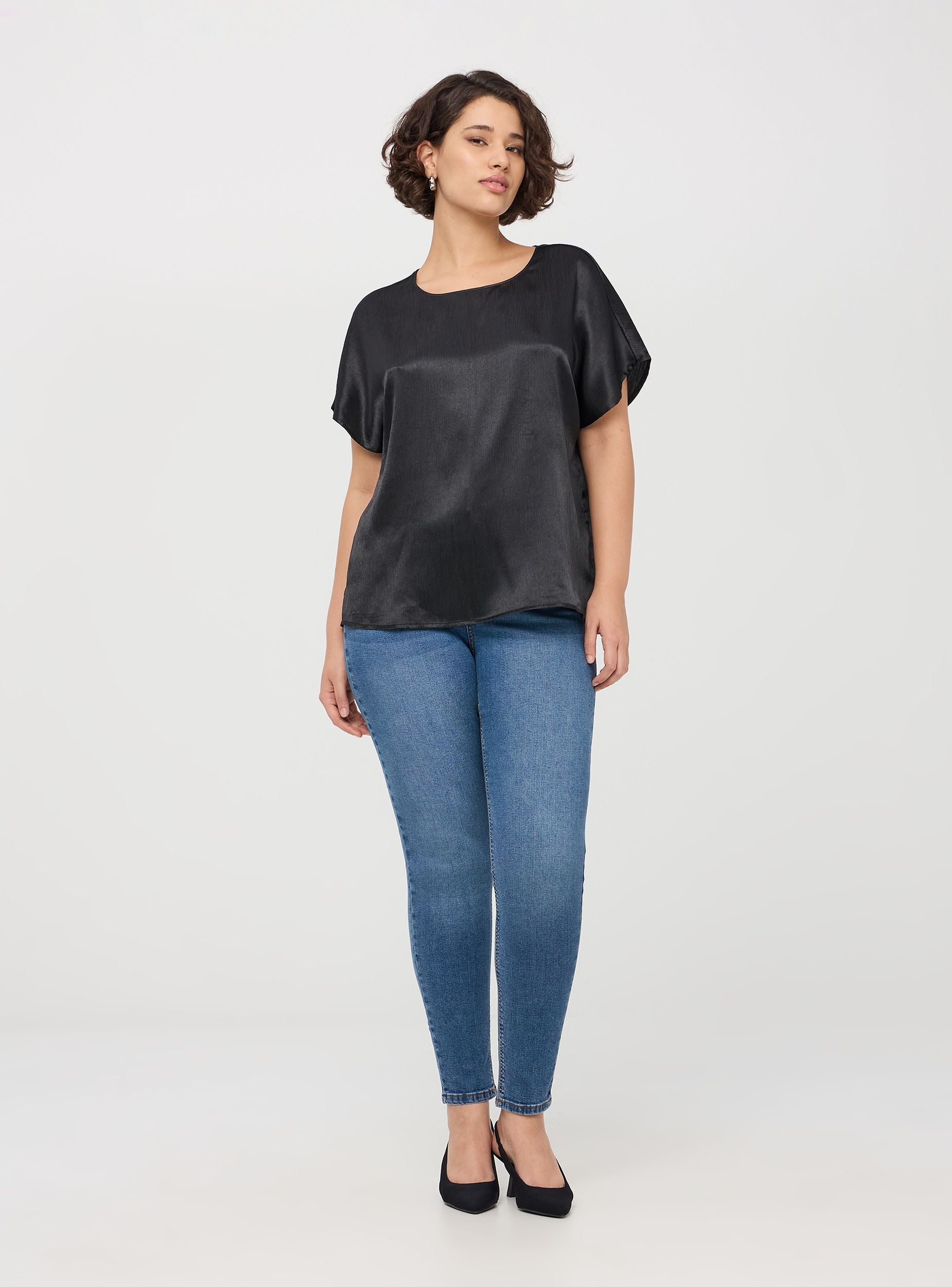 Bluza de damă din satin uni, cu o croială lejeră și confortabilă. Are un decolteu rotund și mâneci scurte. Pe spate este prevăzută cu o deschidere dreaptă, închisă cu un nasture mic.Detalii