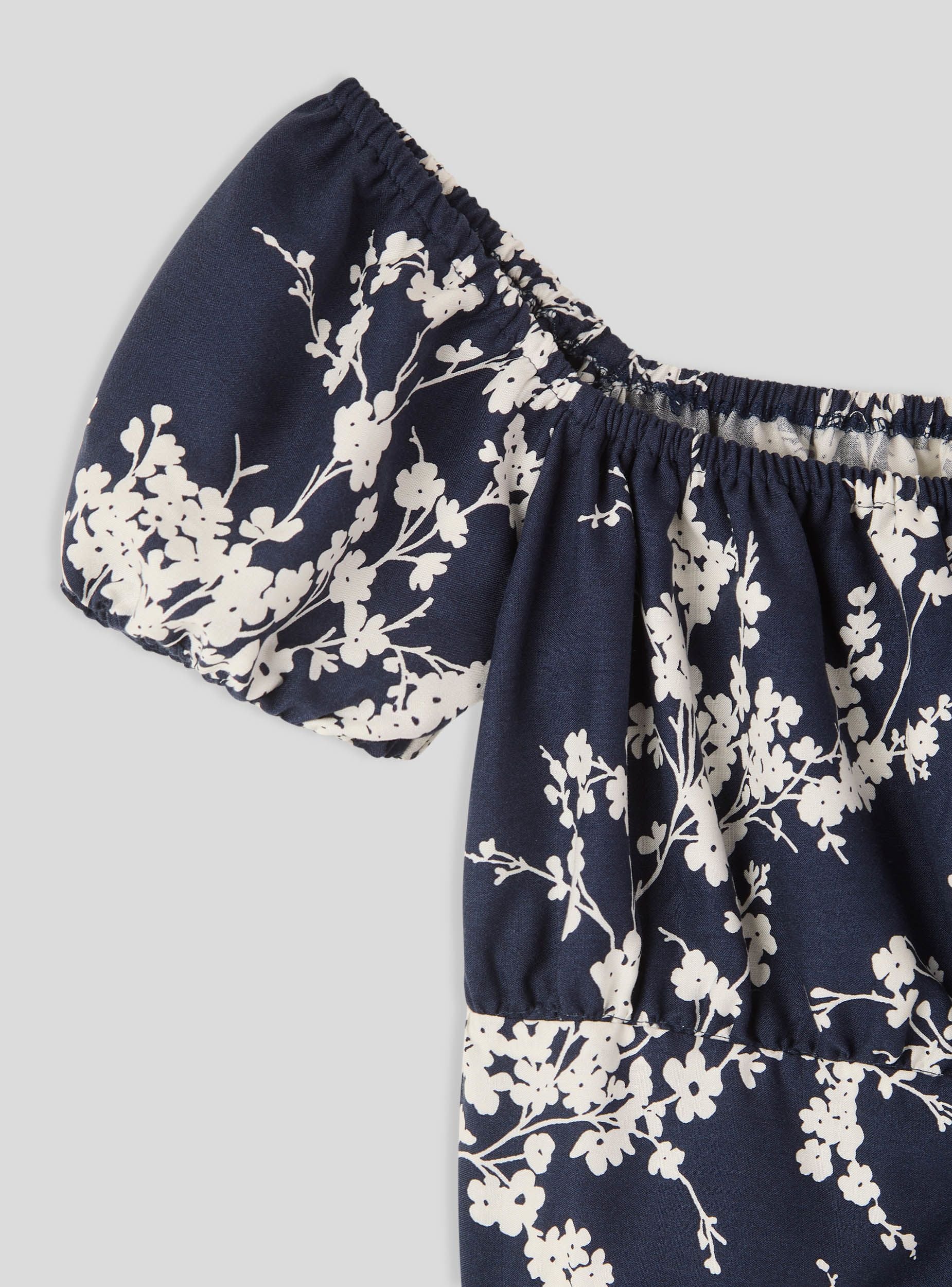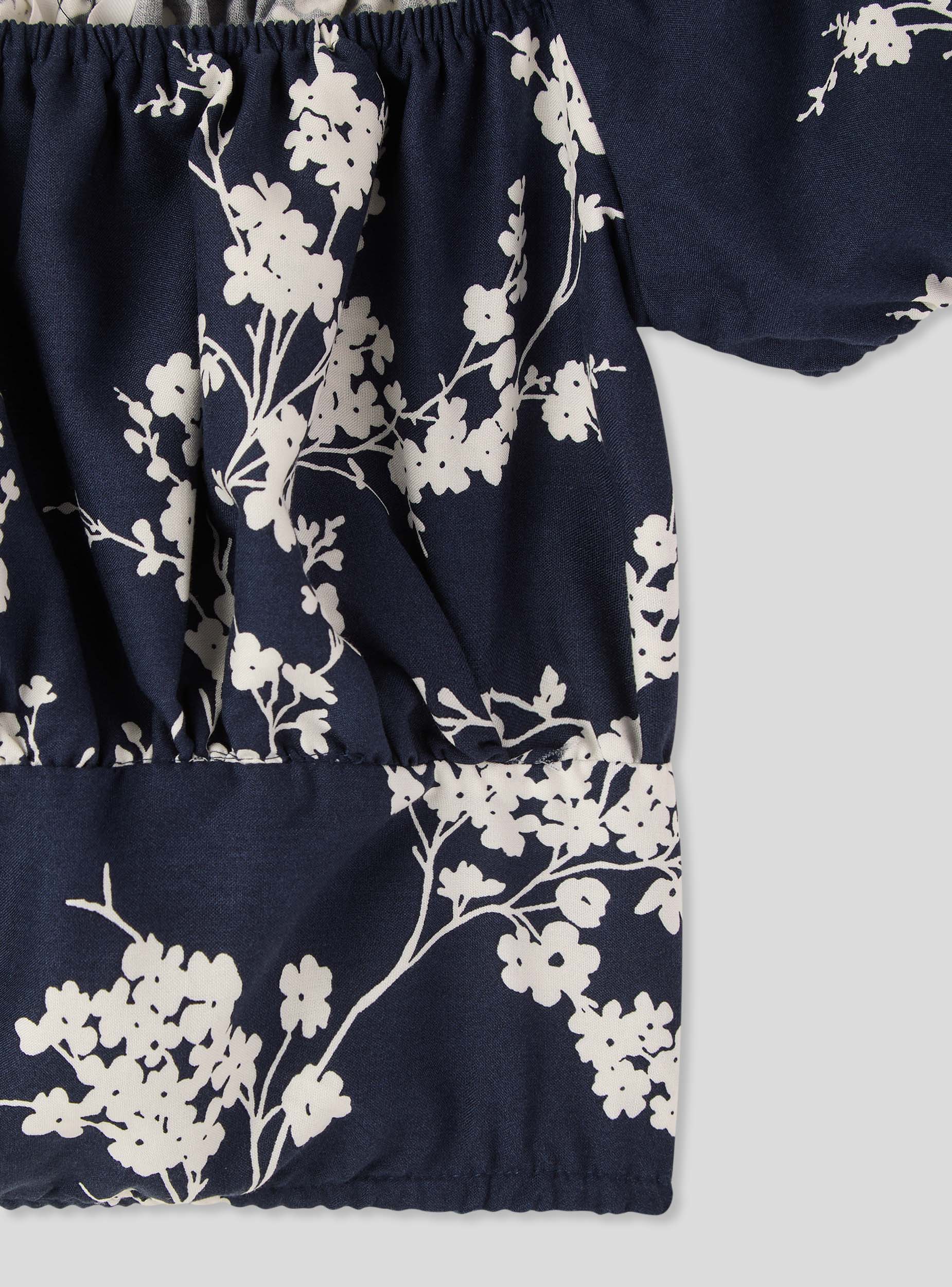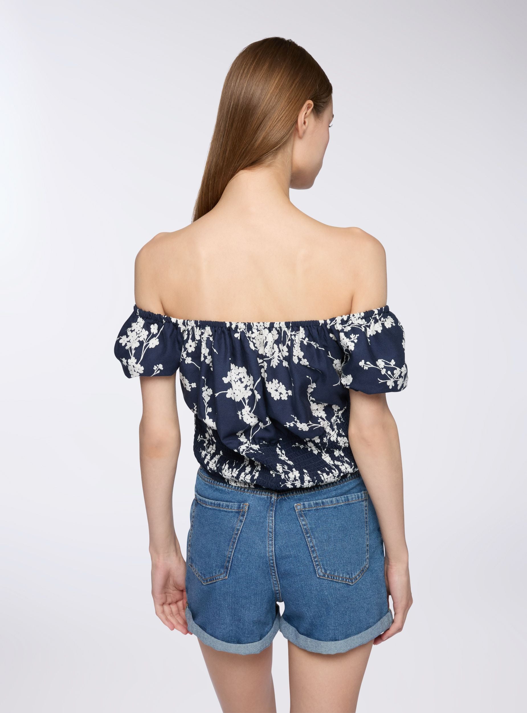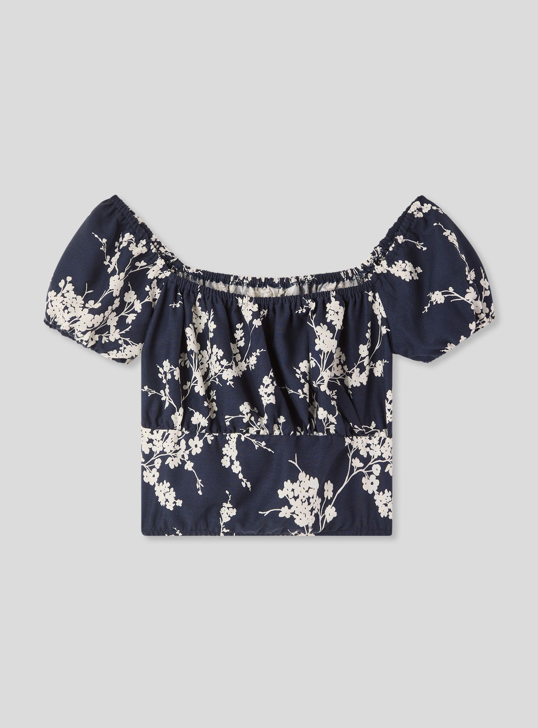 Bluza de damă cu un stil romantic și feminin, îmbogățită cu un delicat imprimeu cu flori japoneze care oferă un aer rafinat. Designul prezintă mâneci scurte ușor bufante, care subliniază eleganța piesei. Cusătura smock din partea din spate asigură o potrivire confortabilă și strânsă, modelând silueta în mod natural. Perfectă de asortat cu fuste fluide sau blugi cu talie înaltă pentru un look sofisticat și versatil.Detalii