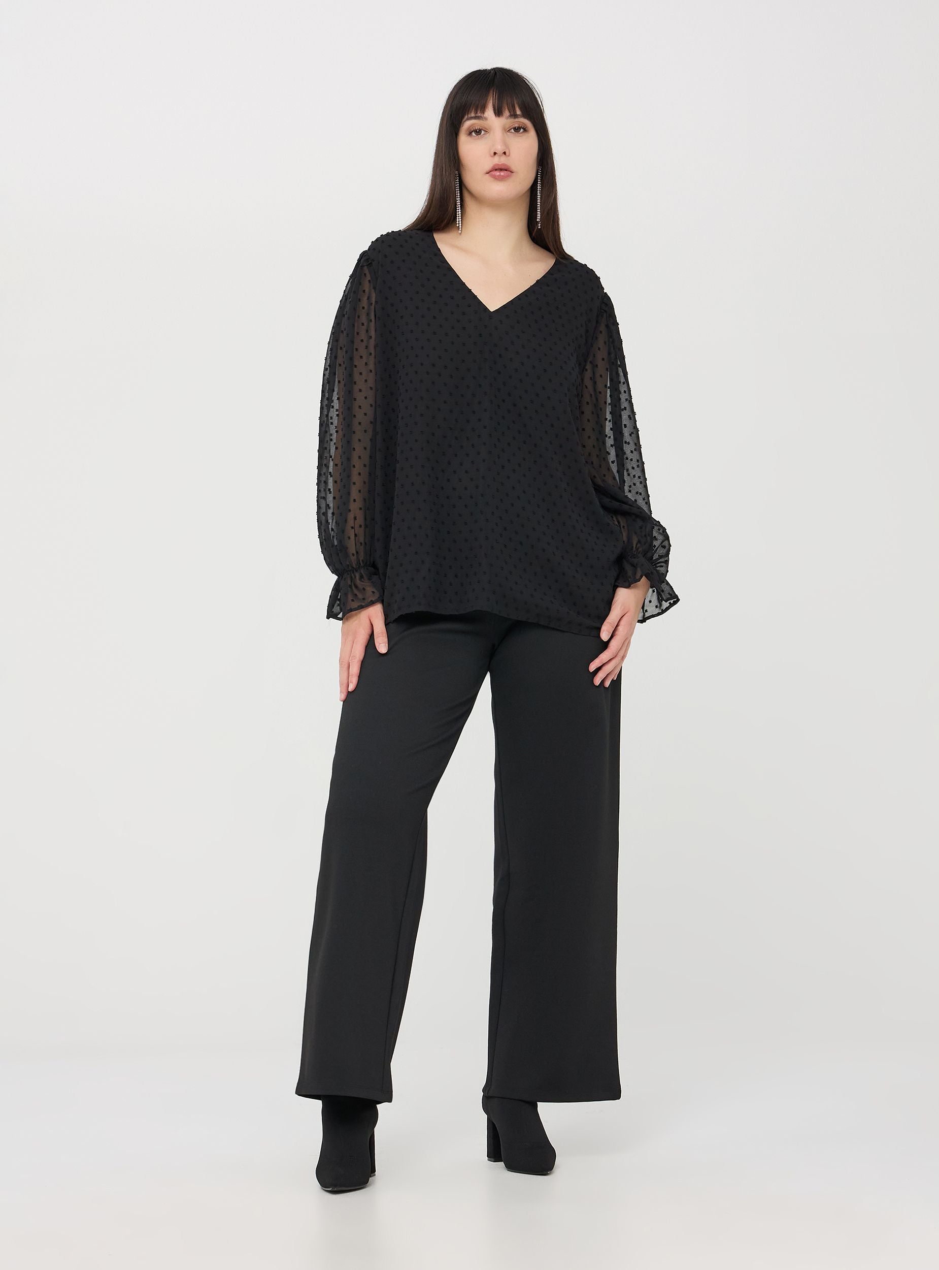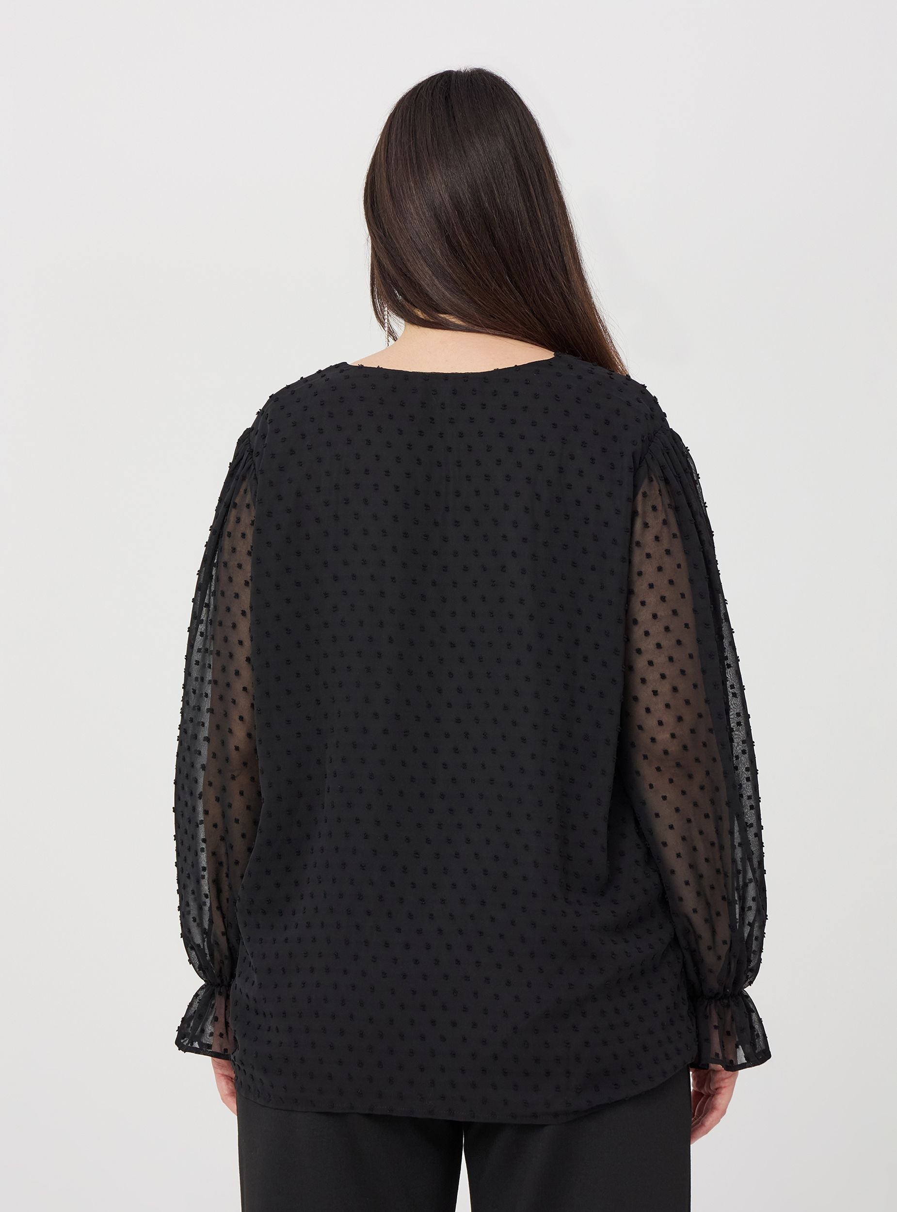 Bluză de damă realizată din chiffon, cu un design delicat cu buline în relief. Model cu decolteu în V și mâneci lungi bufante, cu detaliu cu volănaș la manșete. Croiala este comodă și fluidă, ideală pentru un look chic și rafinat. Perfectă pentru ocazii casual chic sau pentru birou, va adăuga o notă de eleganță garderobei tale zilnice.Detalii