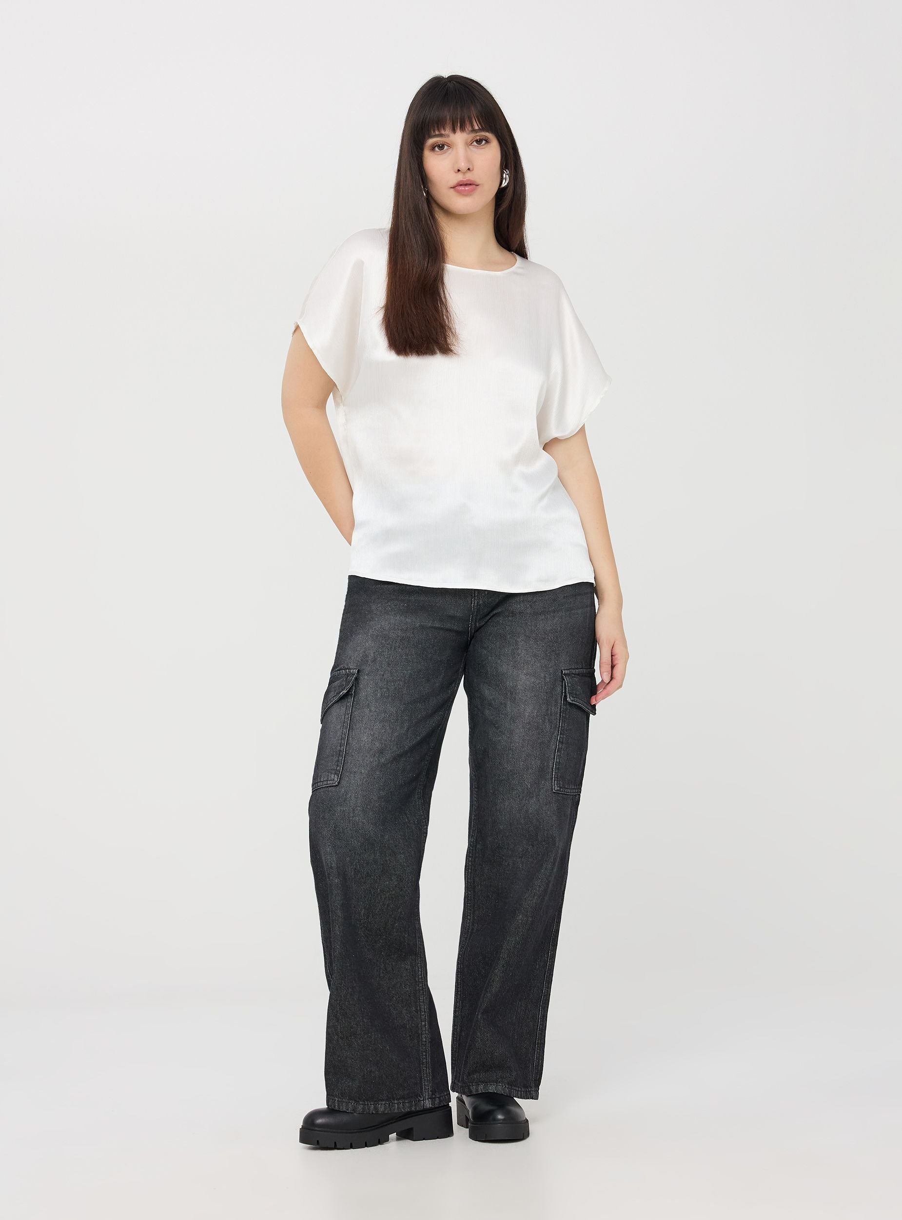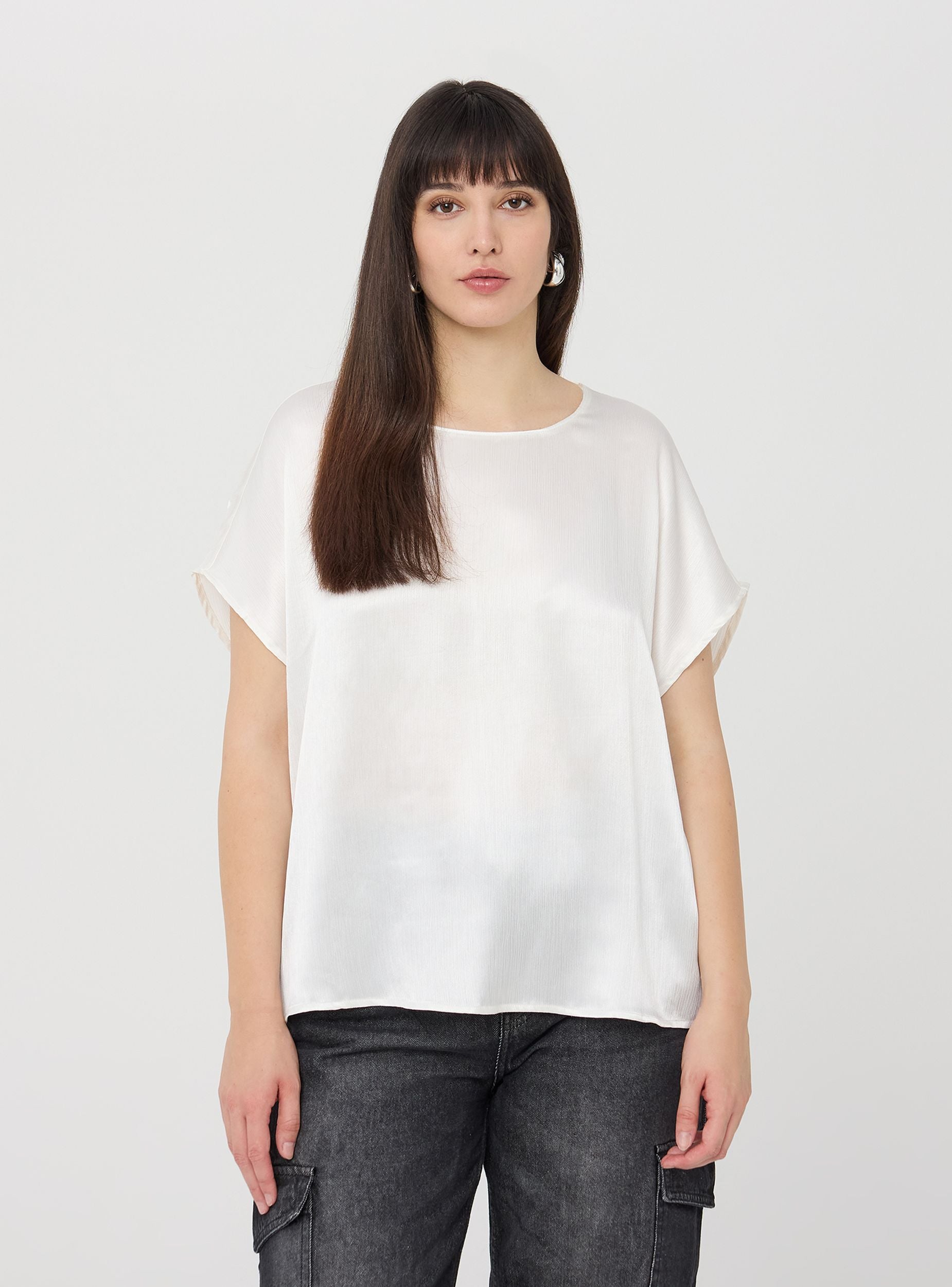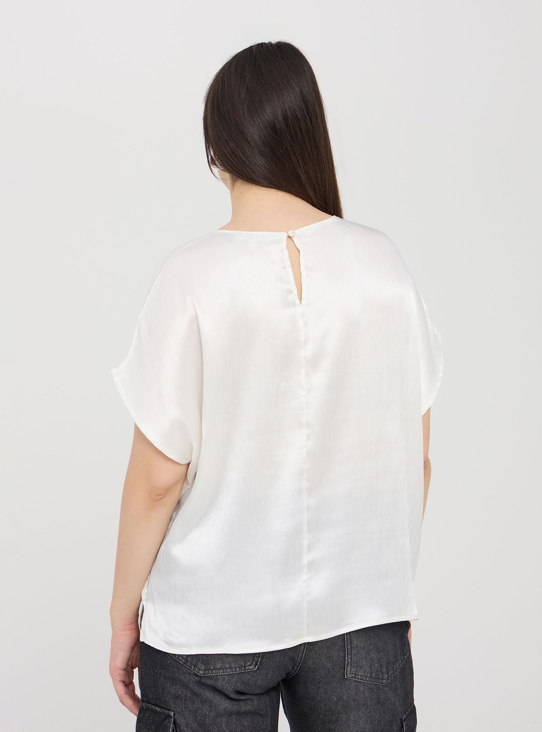 Bluza de damă din satin uni, cu o croială lejeră și confortabilă. Are un decolteu rotund și mâneci scurte. Pe spate este prevăzută cu o deschidere dreaptă închisă cu un nasture mic.Detalii