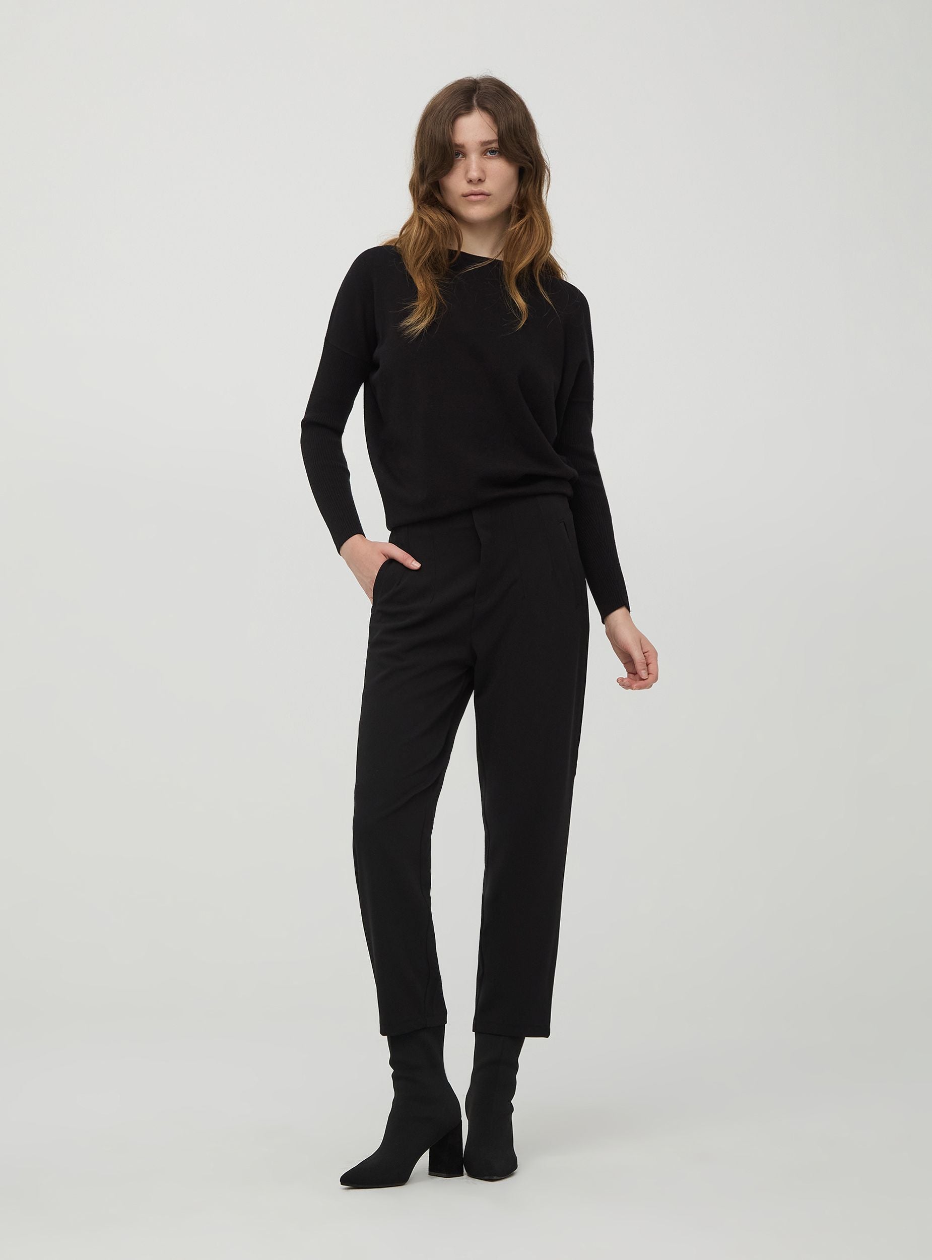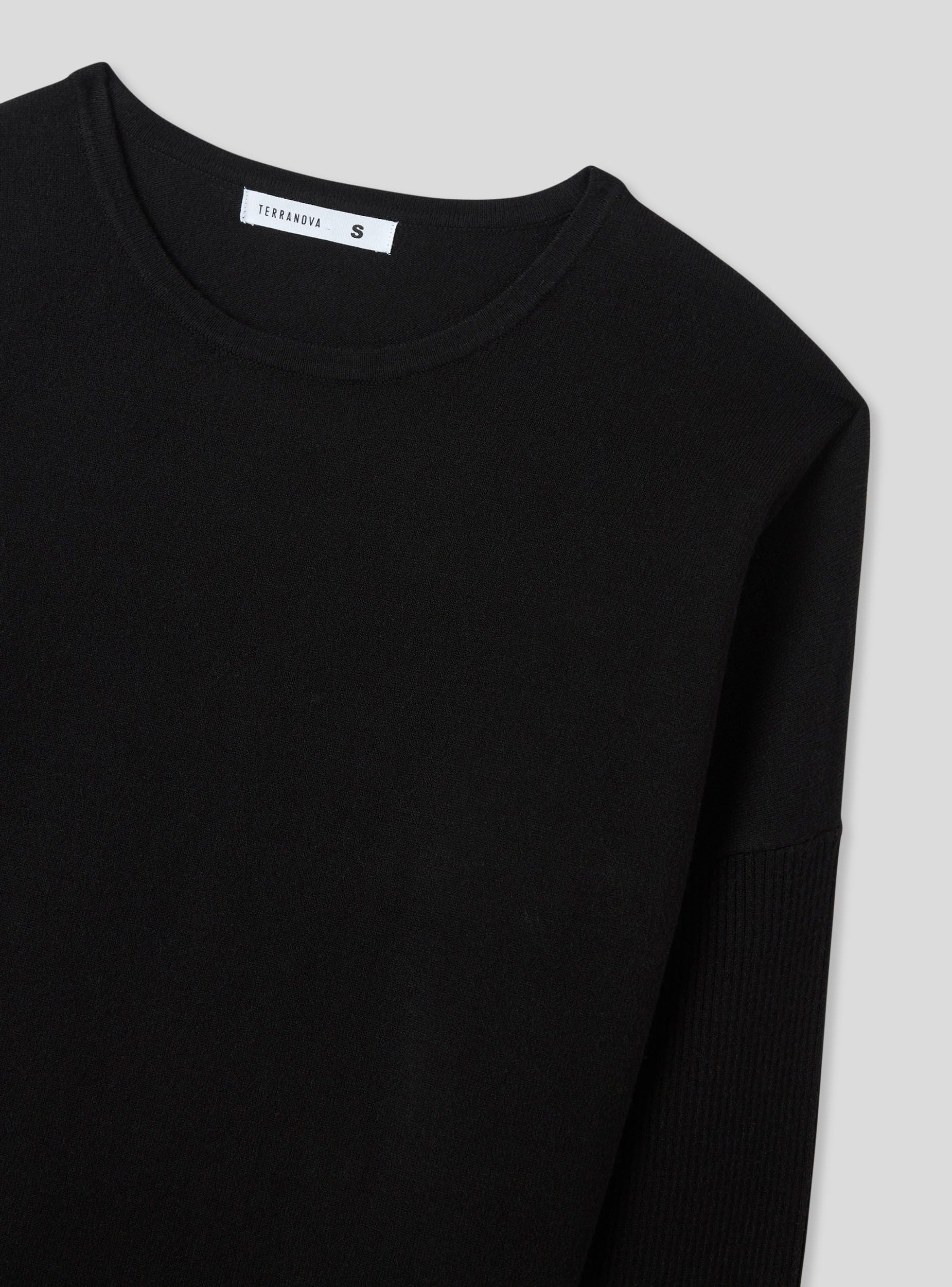 Bluză de damă cu guler rotund, realizată dintr-un material moale, oferă o croială confortabilă și ușor largă. Mâneci lungi cu manșete striate asigură o fixare perfectă fără a strânge. Designul esențial și minimalist este completat de o finisare netedă, făcând această bluză potrivită pentru diverse ocazii.
