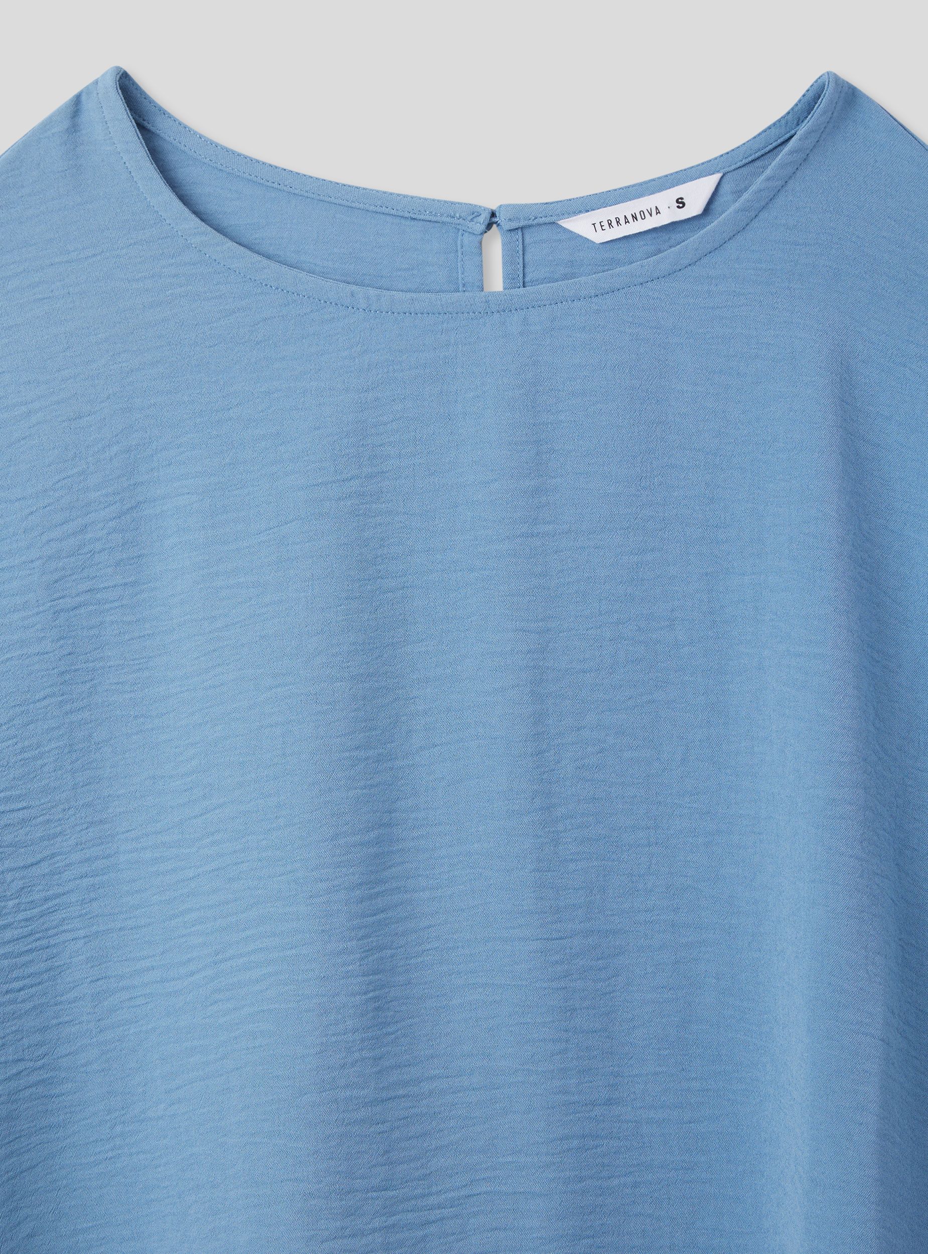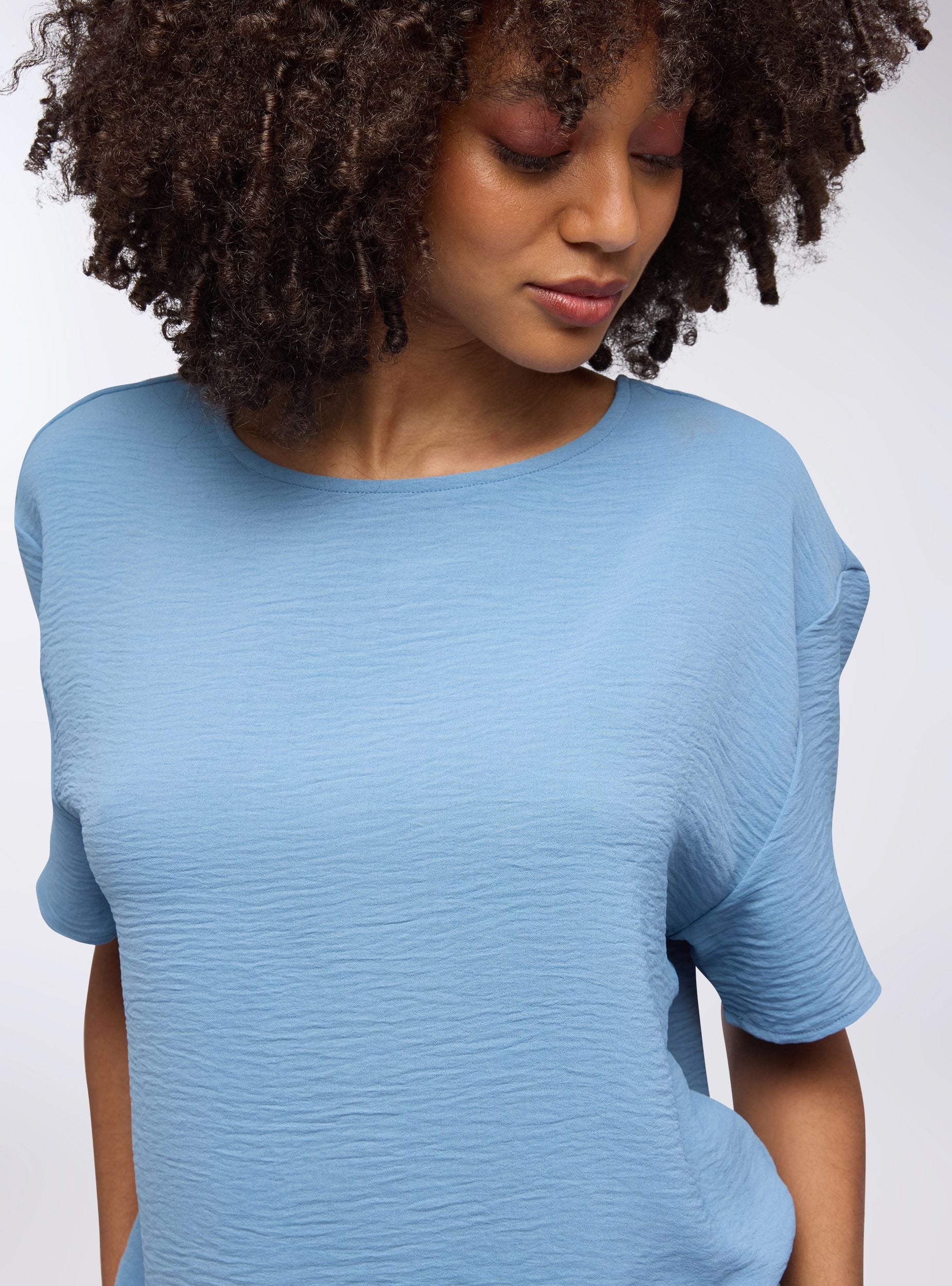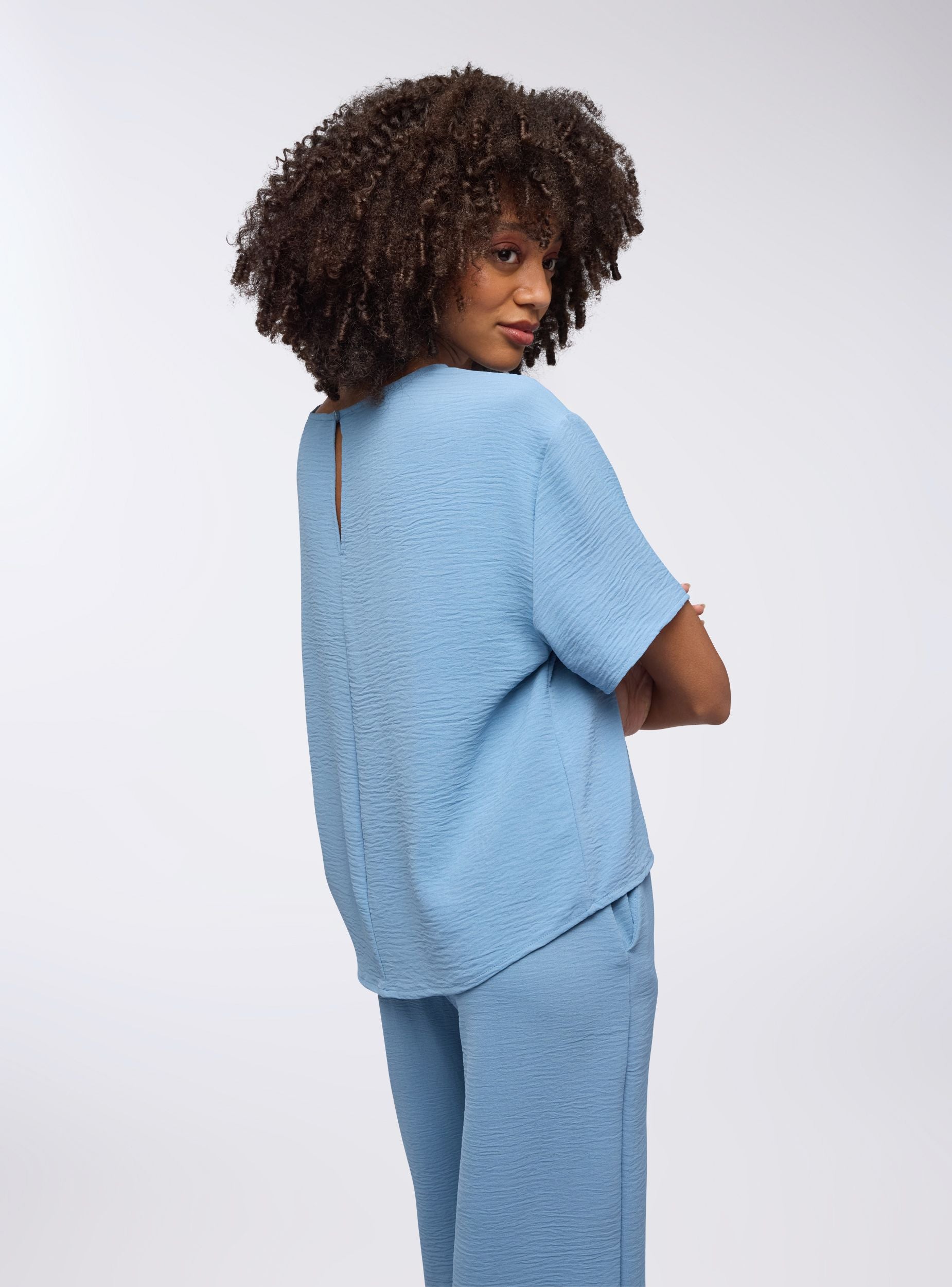 Bluză de damă uni, perfectă pentru un look rafinat și versatil. Designul esențial prezintă un elegant guler rotund și mâneci scurte largi, ideale pentru a asigura confort și libertate de mișcare. În spate, un nasture delicat adaugă un detaliu subtil, facilitând închiderea. Croiala moale și fluidă o face potrivită pentru diverse ocazii, de la cele informale la cele mai sofisticate.Detalii