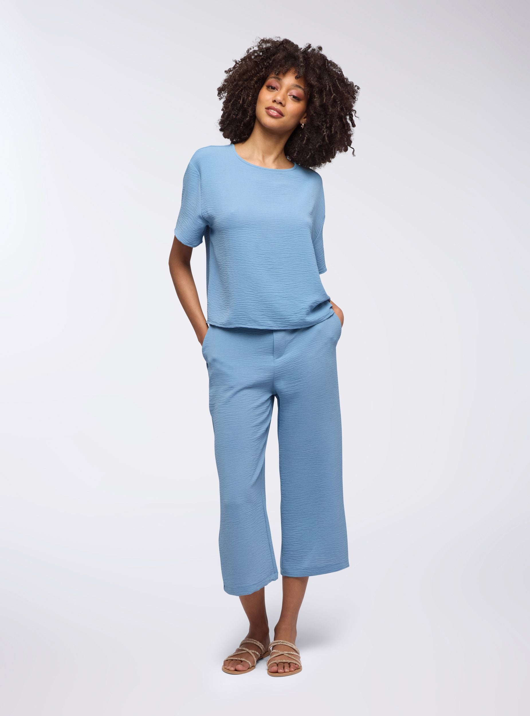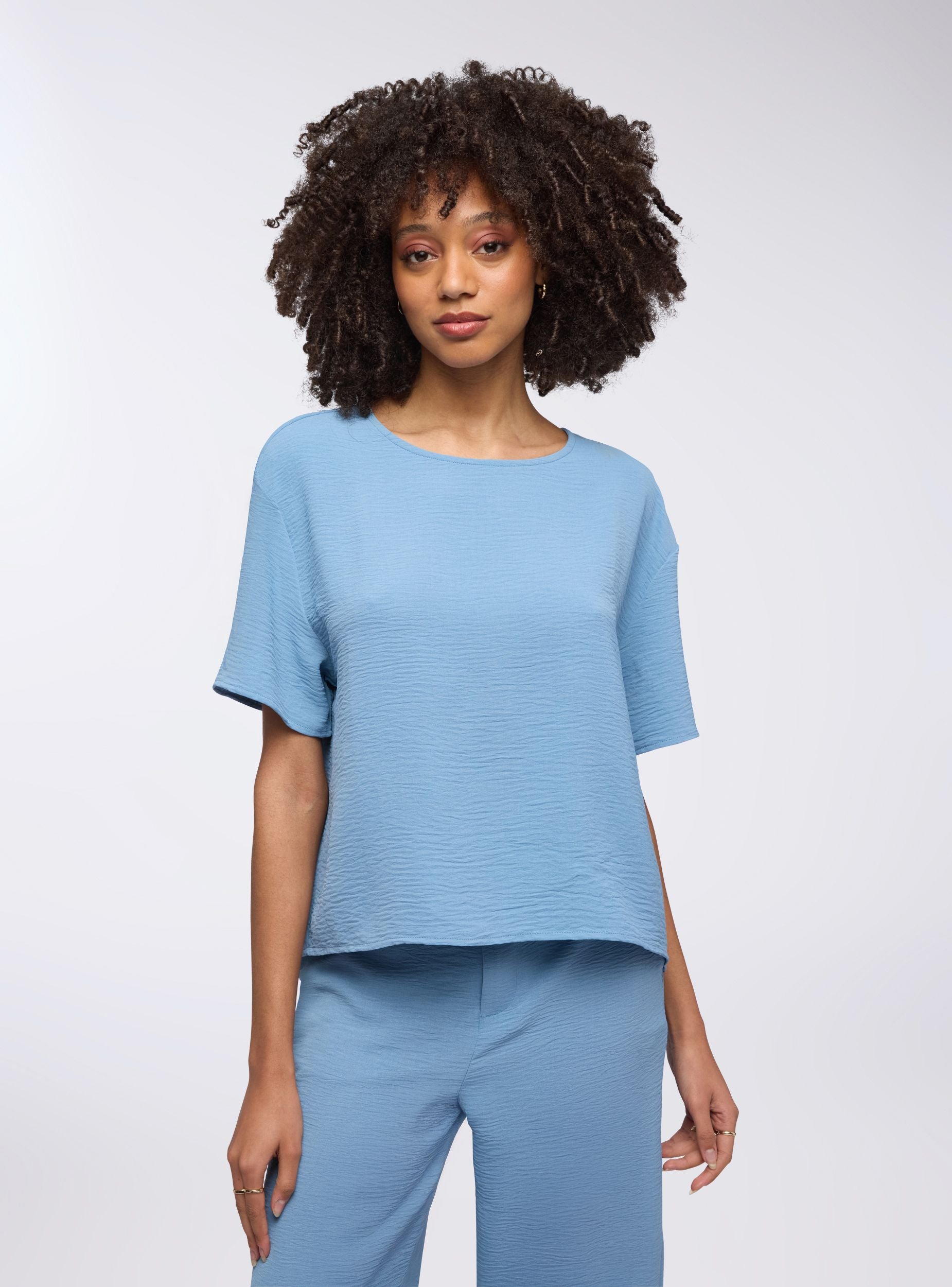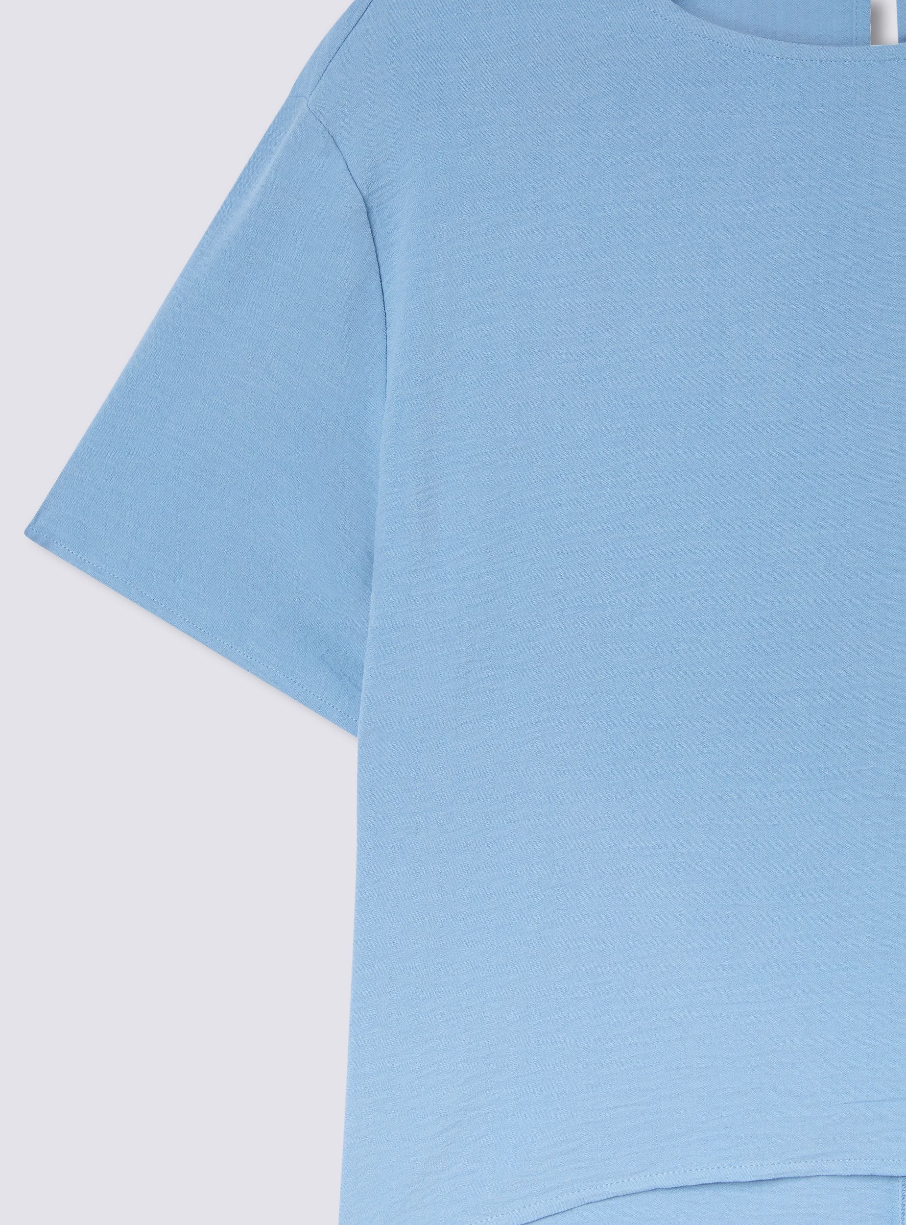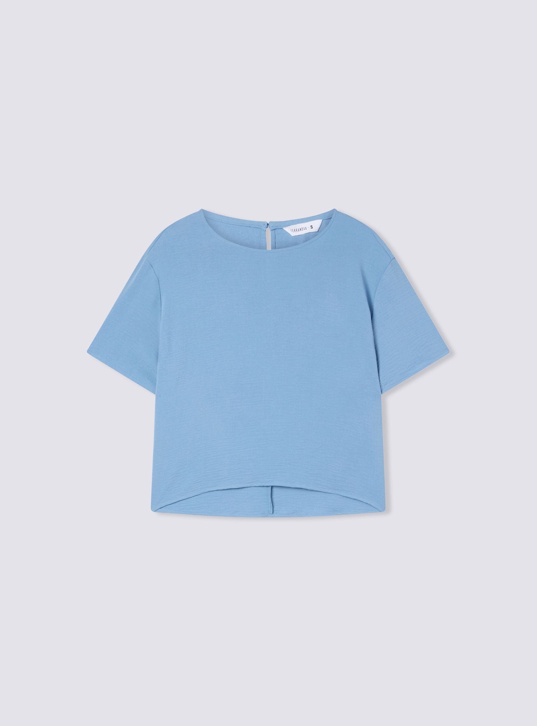 Bluză de damă uni, perfectă pentru un look rafinat și versatil. Designul esențial prezintă un elegant guler rotund și mâneci scurte largi, ideale pentru a asigura confort și libertate de mișcare. În spate, un nasture delicat adaugă un detaliu subtil, facilitând închiderea. Croiala moale și fluidă o face potrivită pentru diverse ocazii, de la cele informale la cele mai sofisticate.Detalii