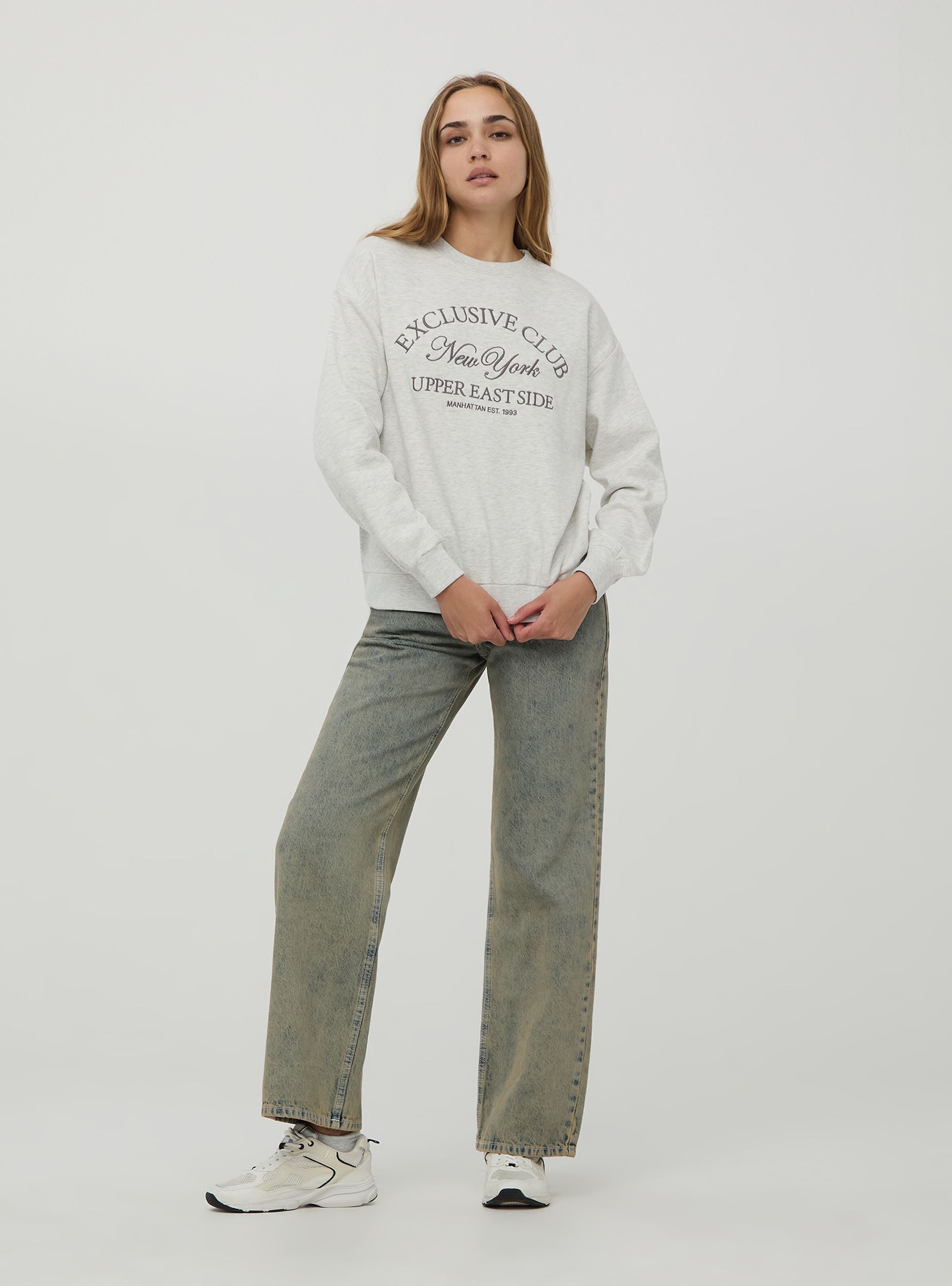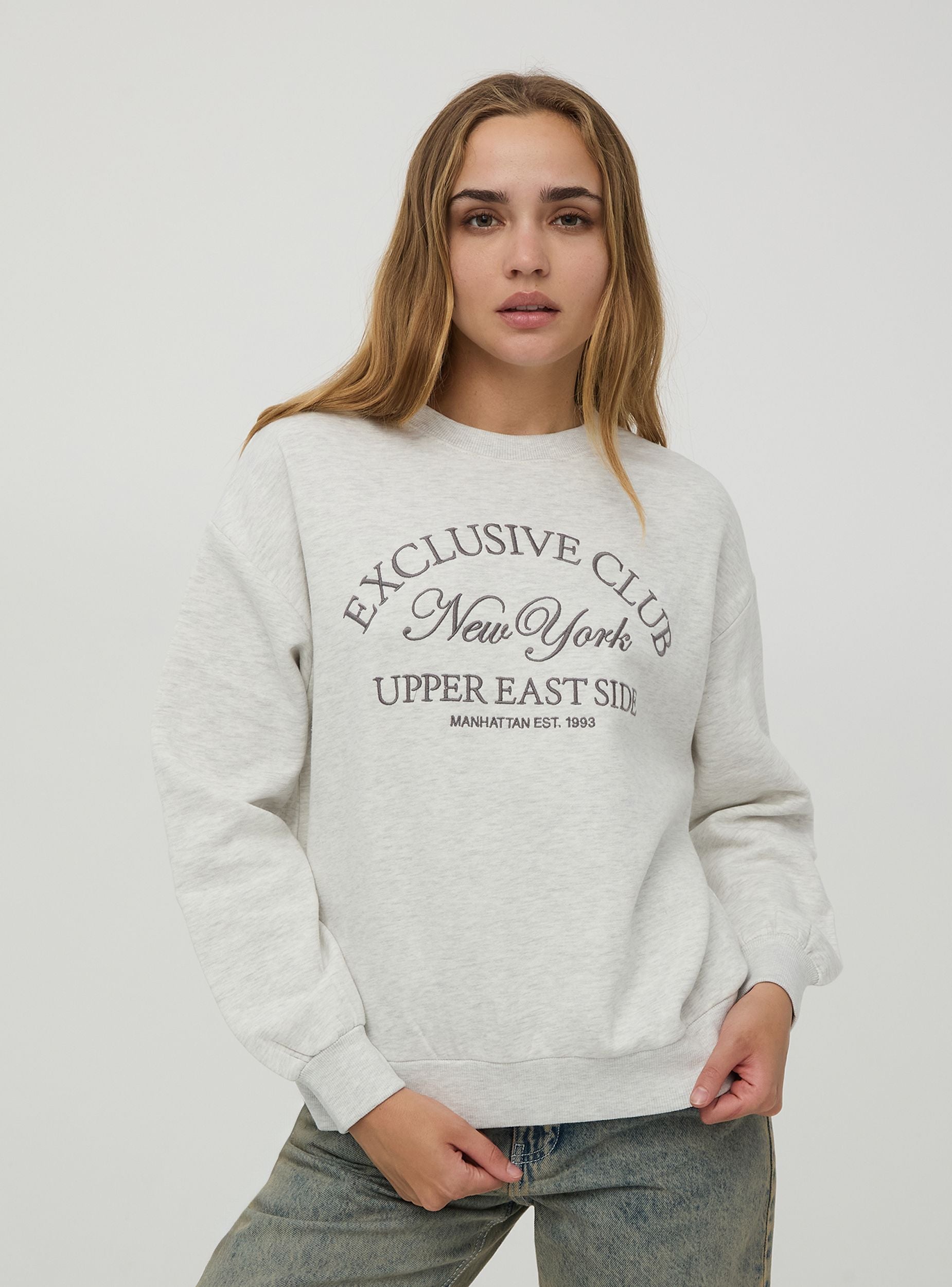 Hanorac damă, model închis fără glugă, din material gros uni, cu broderie frontală în stil college. Perfect pentru un look casual. Croială regular.