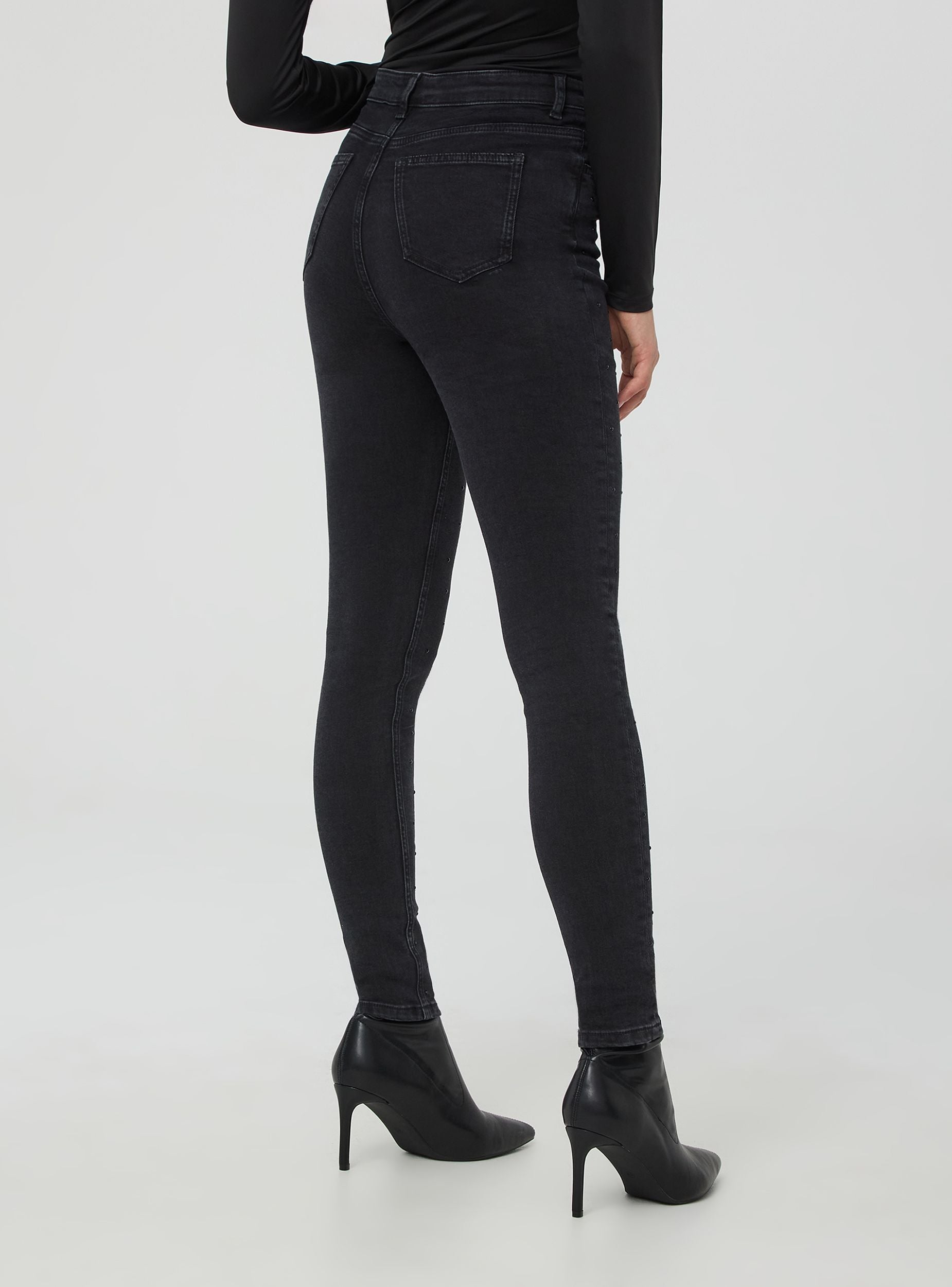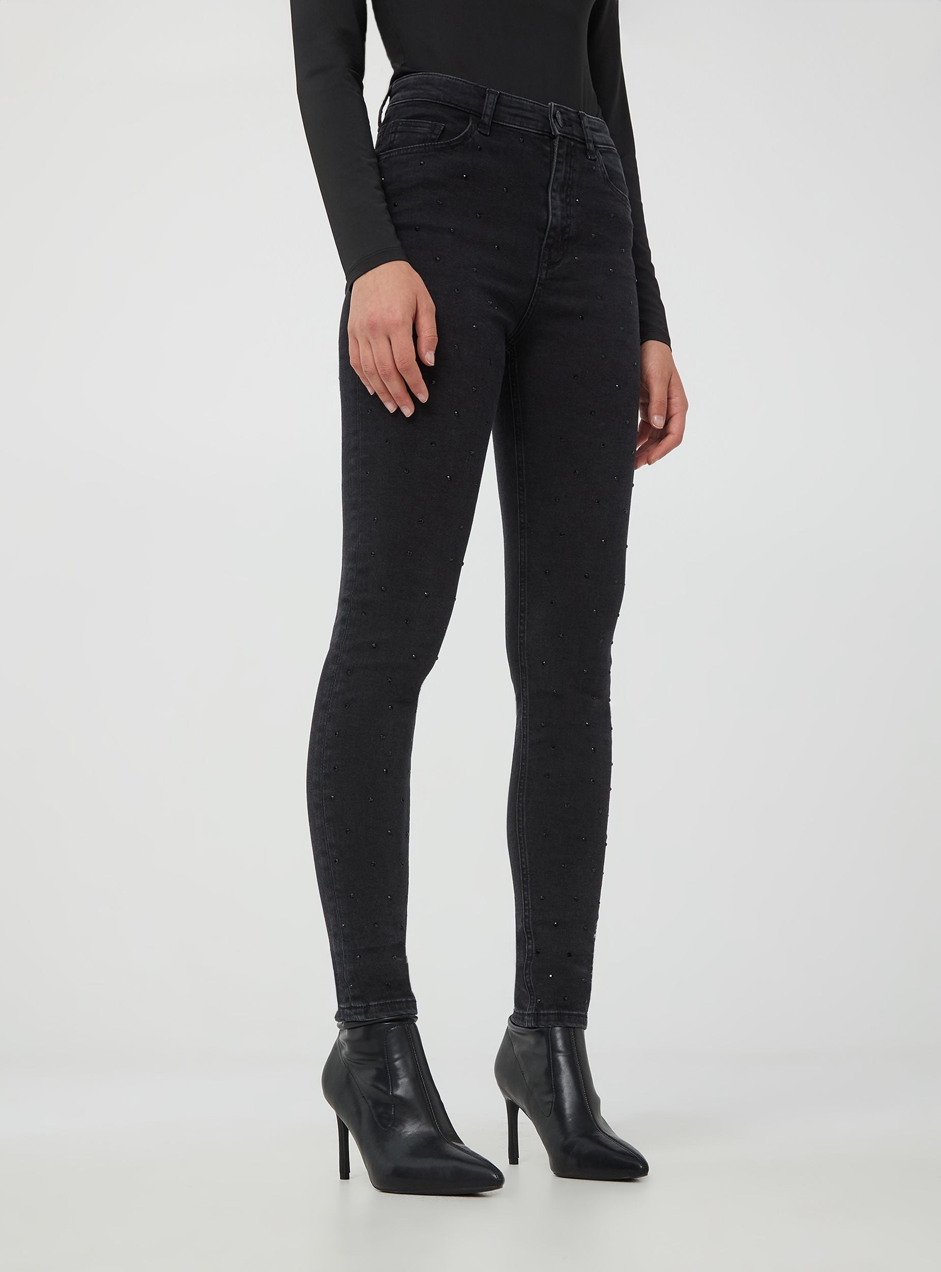 Jeans de damă cu talie înaltă și strasuri pe partea frontală. Perfecte pentru a adăuga un plus de eleganță garderobei tale. Model cu cinci buzunare, completat de cusături rezistente și confortabile, un nasture metalic și un fermoar frontal. Ideal pentru un look casual-chic, sunt perfecte pentru seri în oraș și ocazii informale în care vrei să te remarci cu stil.Detalii