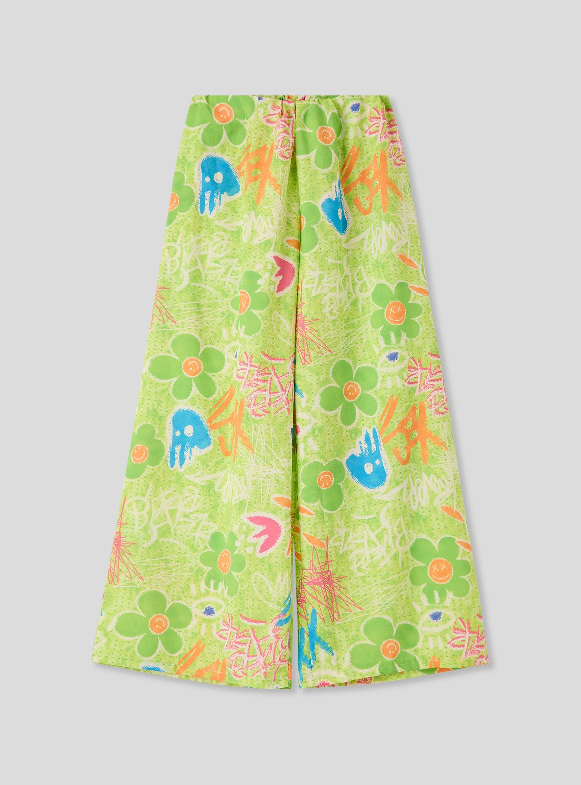 Pantaloni pentru fete cu design wide leg, ideali pentru un look trendy și vivace. Prezintă un model colorat și atrăgător, perfect pentru ocazii casual sau pentru a adăuga un strop de veselie garderobei. Talie elastică asigură confort și practicitate, în timp ce croiala largă oferă libertate de mișcare. Excelenți de asortat cu tricouri sau cămăși pentru un outfit proaspăt și modern.Detalii