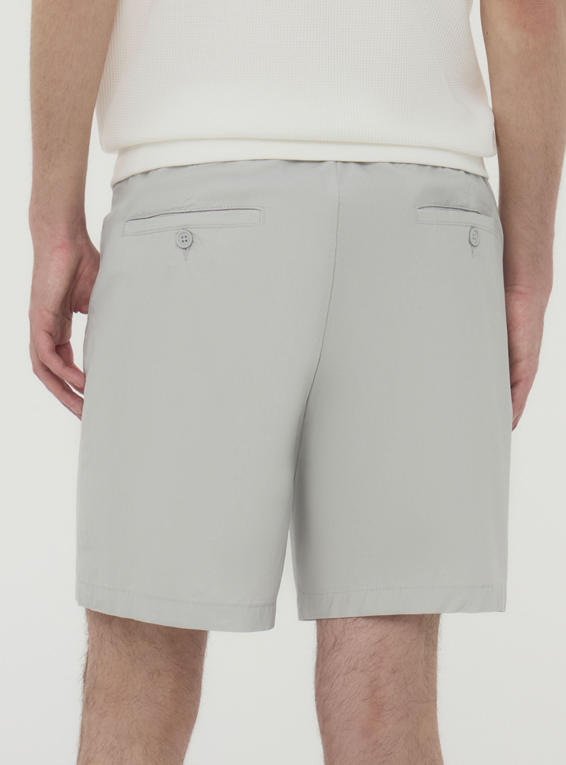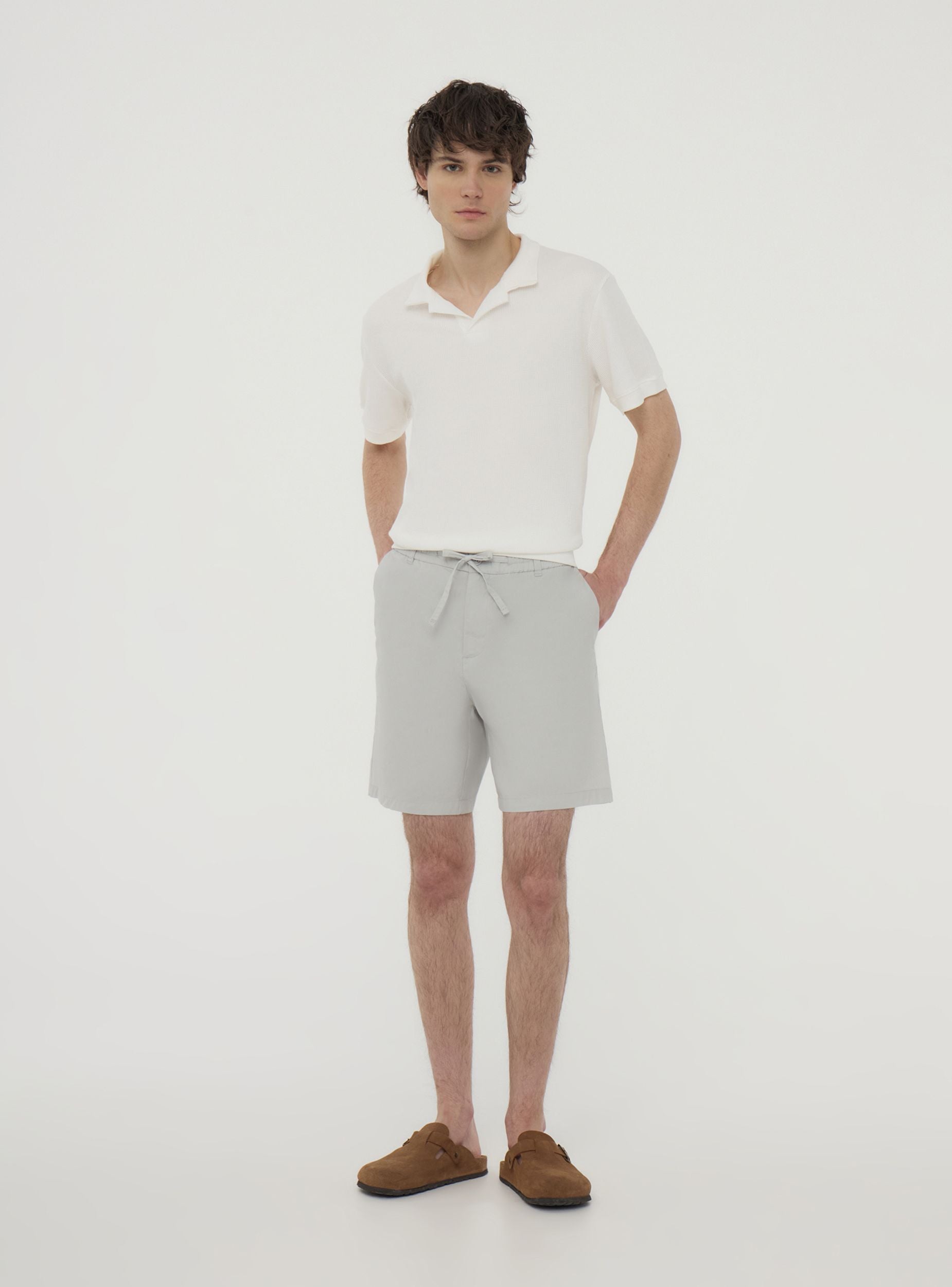 Pantaloni scurți uni pentru bărbați, ideali pentru un look casual și relaxat, perfecți pentru timpul liber sau pentru o ținută de vară. Se caracterizează printr-o croială regulară, cu închidere cu nasture, fermoar și șnur. Au o talie elastică și buzunare oblice. Un articol versatil și comod pentru cei care caută practicitate și stil în orice ocazie.Detalii