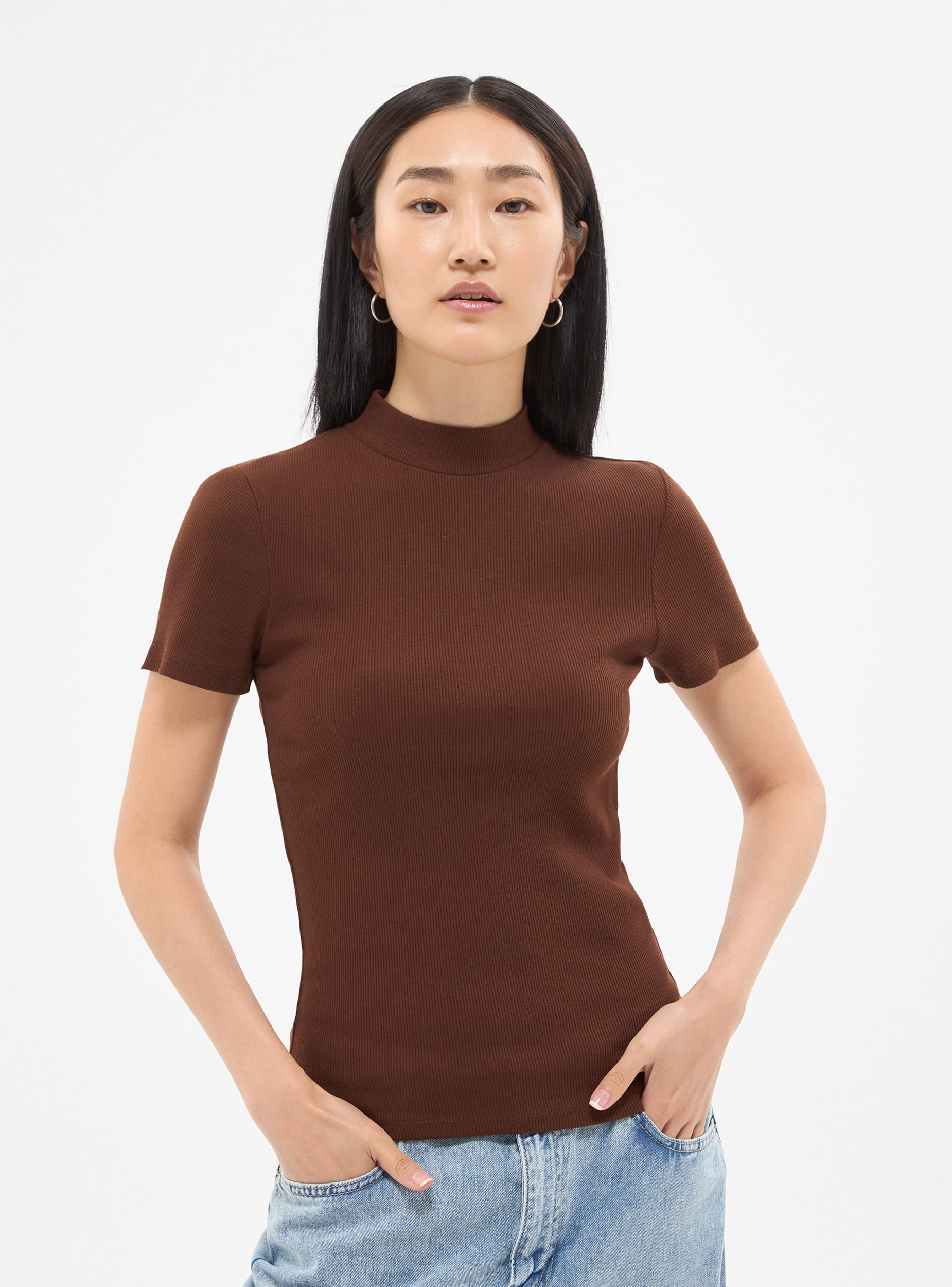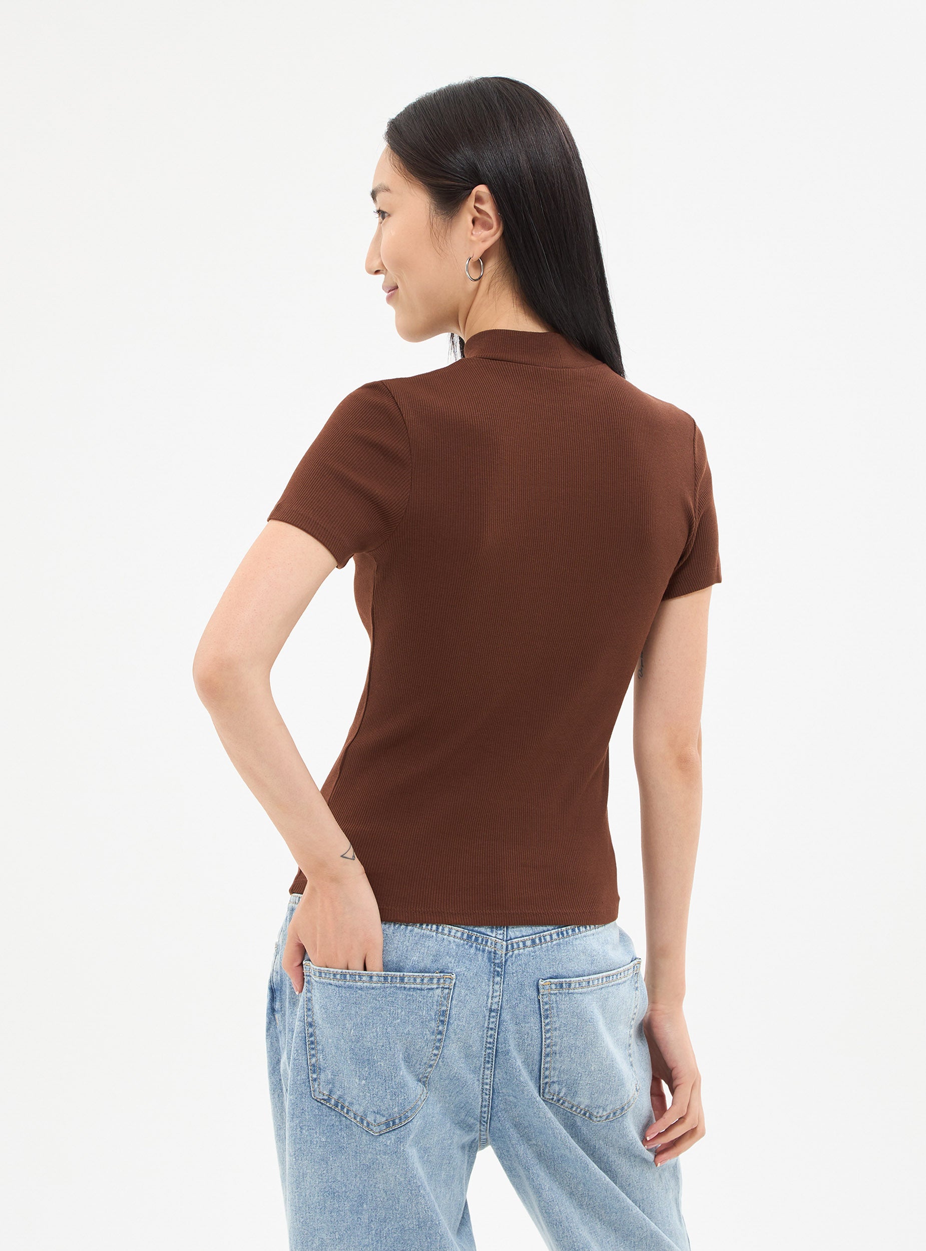 Maglietta donna a manica corta in tessuto a costina tinta unita. Collo lupetto. Vestibilità slim.