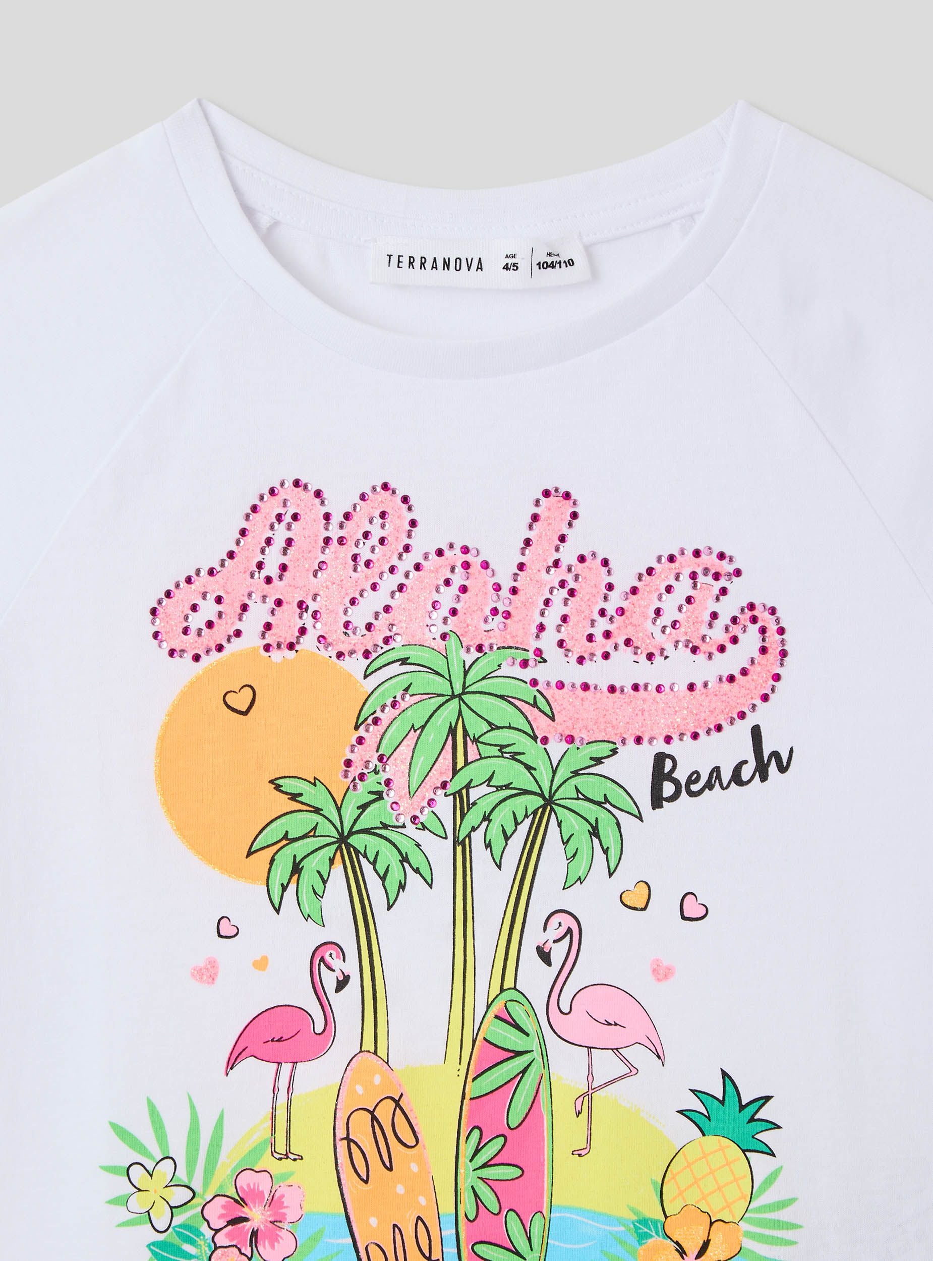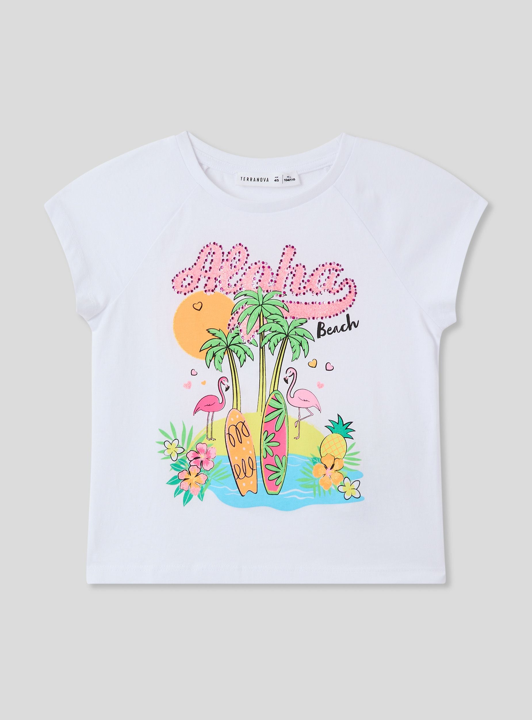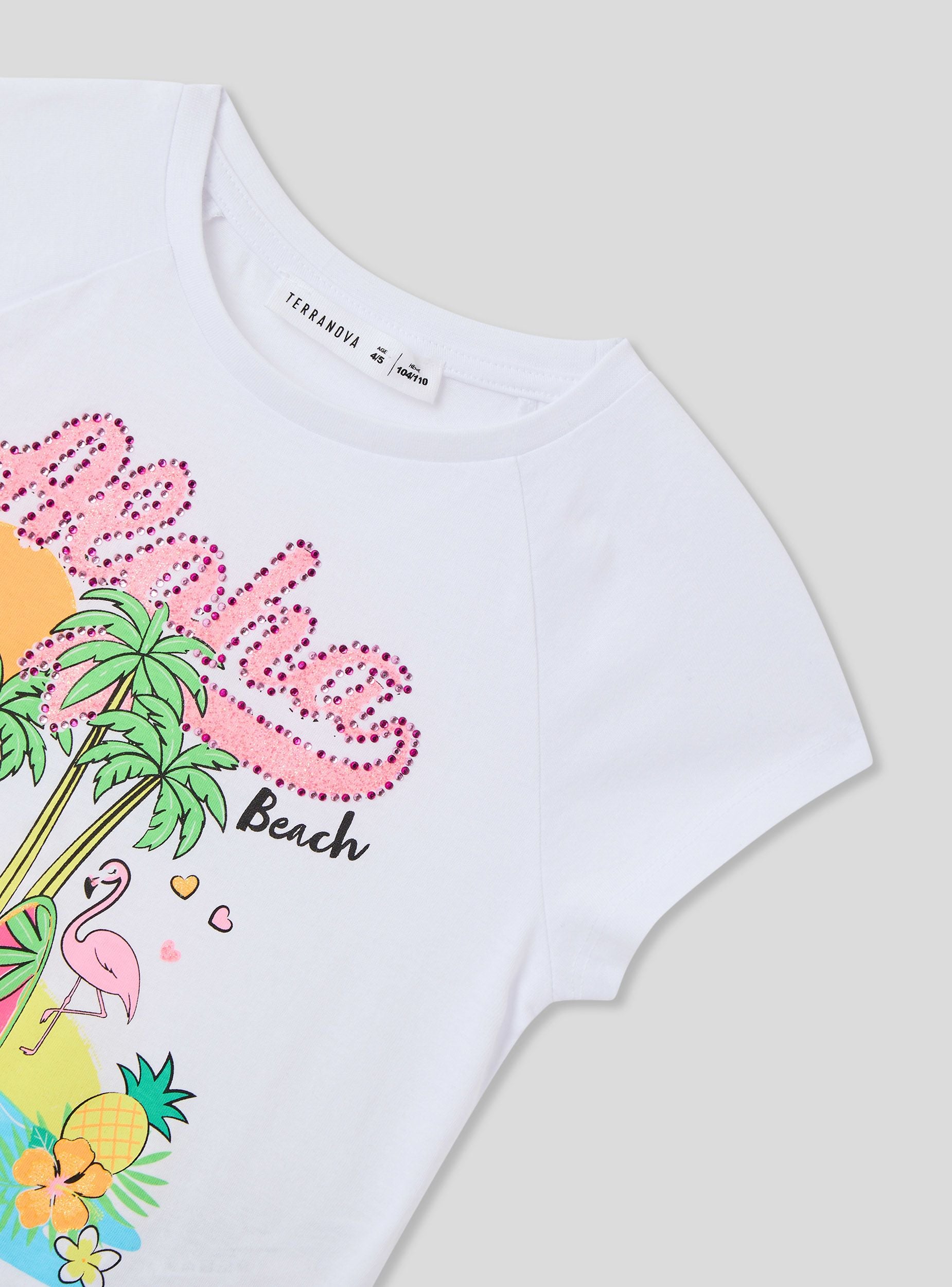 Tricou pentru fetițe, ideal pentru un look casual și vivace, perfect pentru timpul liber. Caracterizat printr-o croială regulară, prezintă o imprimare colorată cu detalii decorative și un guler rotund. O alegere versatilă pentru a adăuga un strop de veselie ținutelor de zi cu zi.