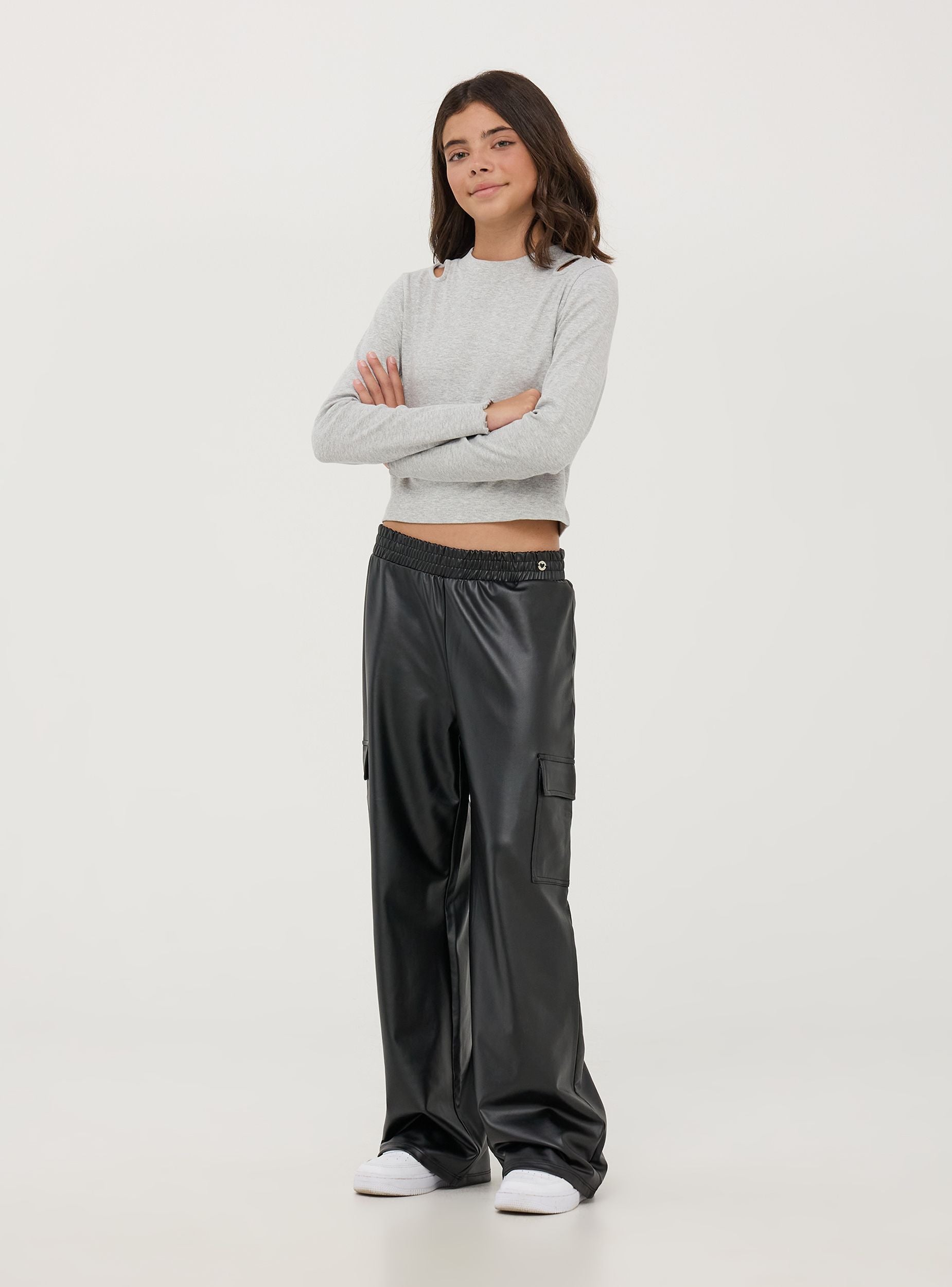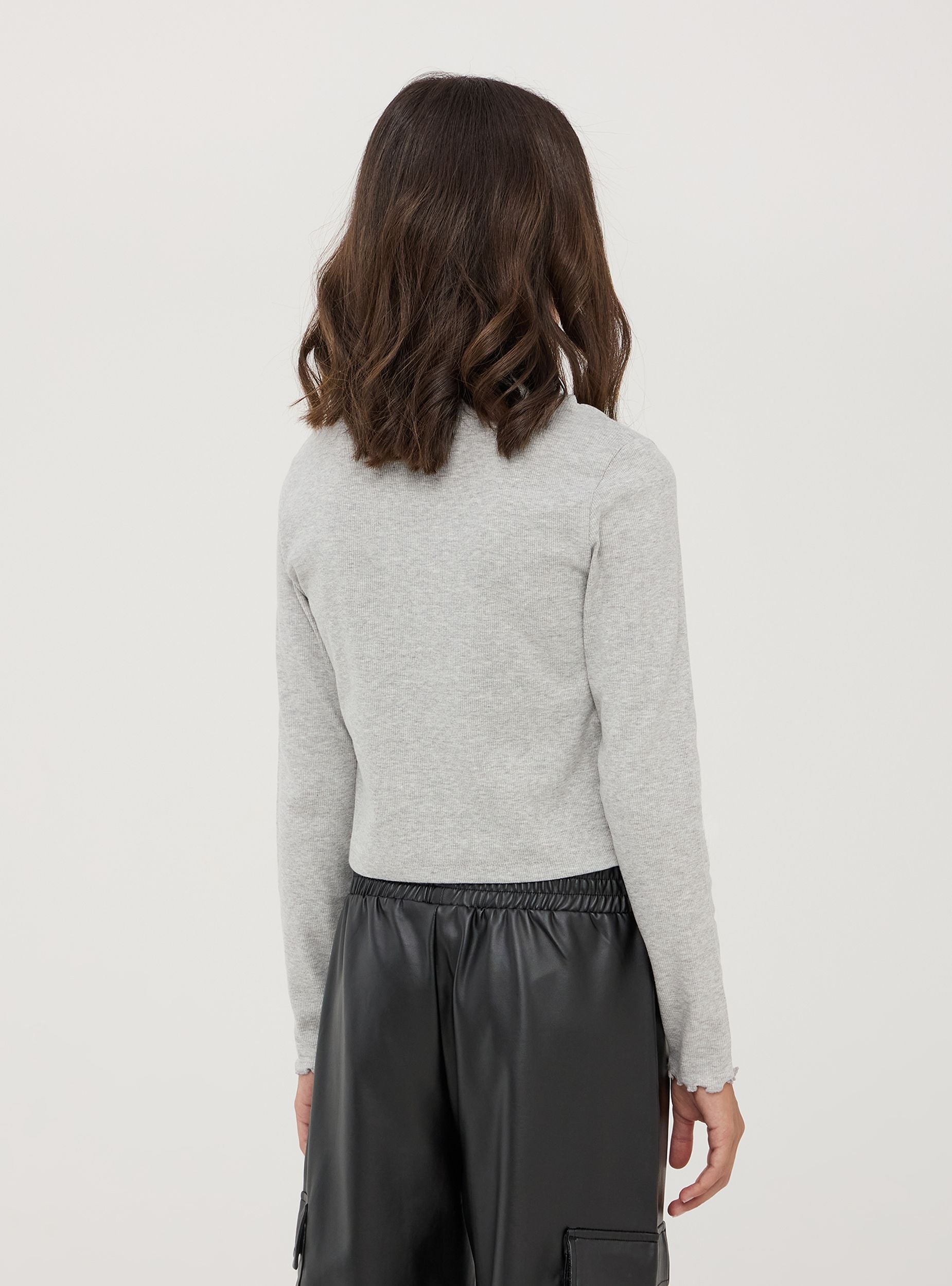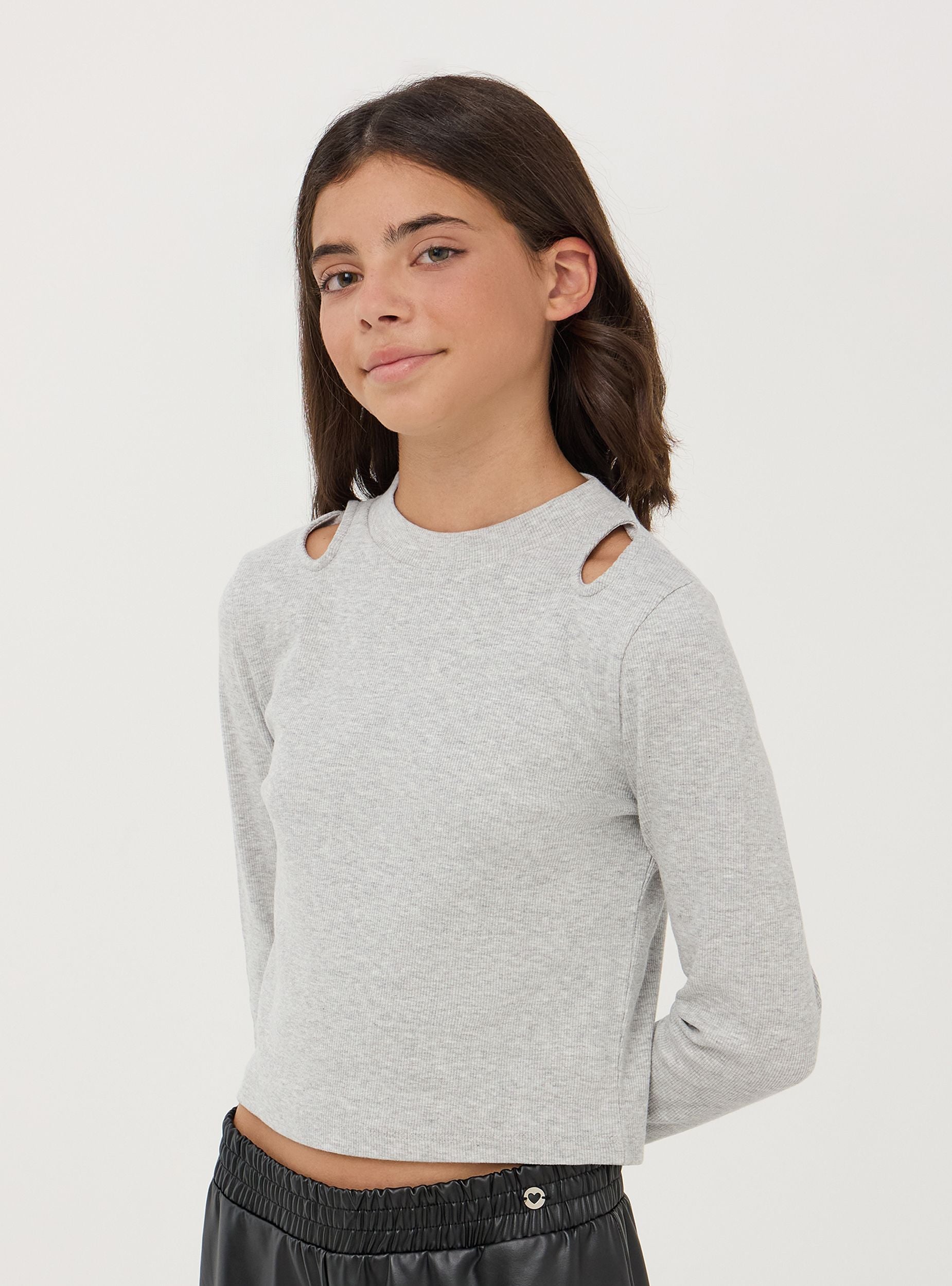 Bluză pentru fete cu mâneci lungi, cu detalii decupate pe umeri și tivuri adunate la mâneci, confecționată dintr-un material cu rețea uni. Perfectă pentru un look la modă. Designul atrăgător adaugă un plus de originalitate garderobei. Ideală pentru ocazii casual, cum ar fi ieșirile cu prietenii sau momentele de relaxare, poate fi asortată cu blugi, fuste sau pantaloni pentru un outfit comod și stilat. Potrivită pentru zilele mai răcoroase, oferind confort și stil în orice situație. Croială crop.