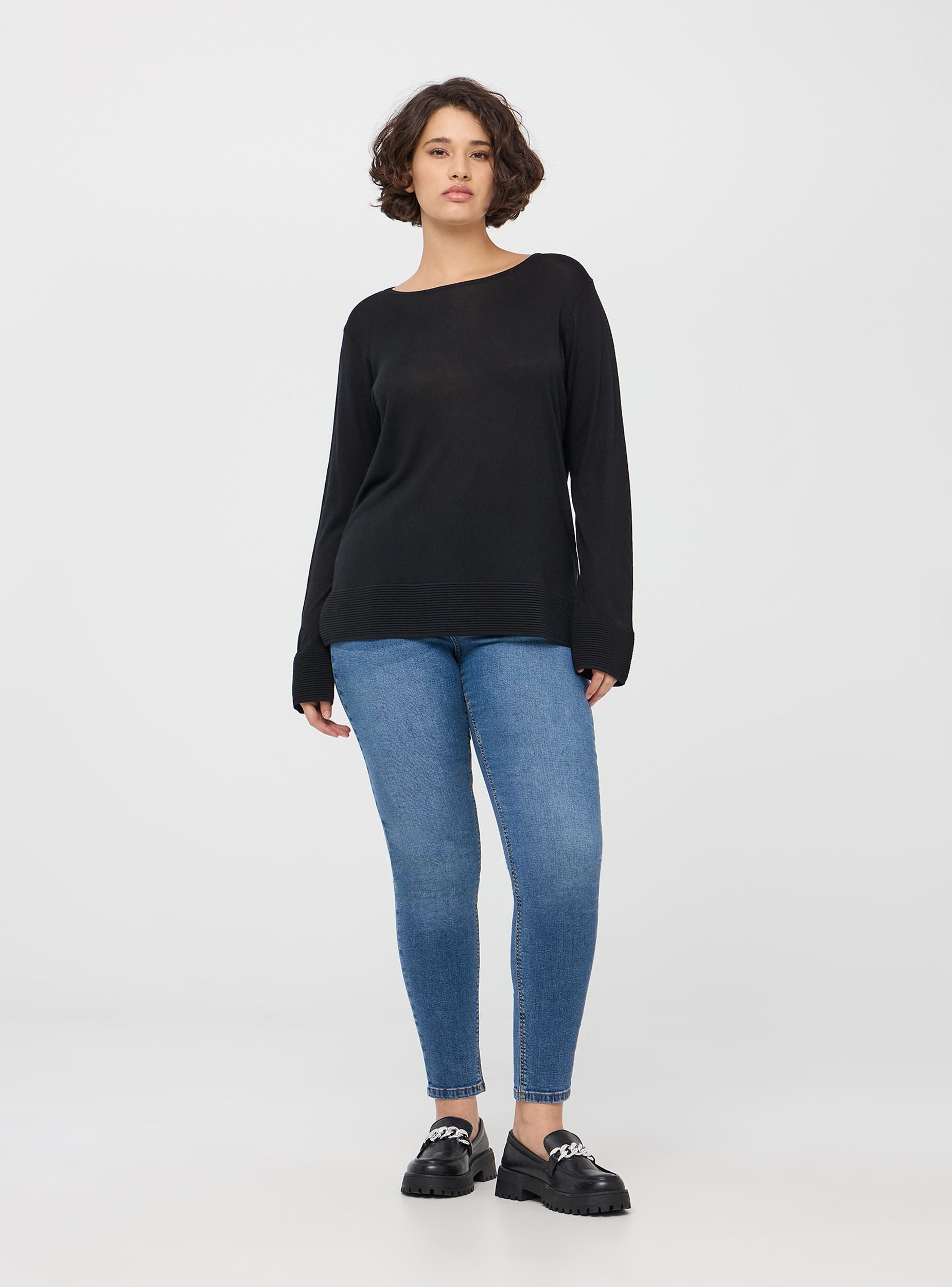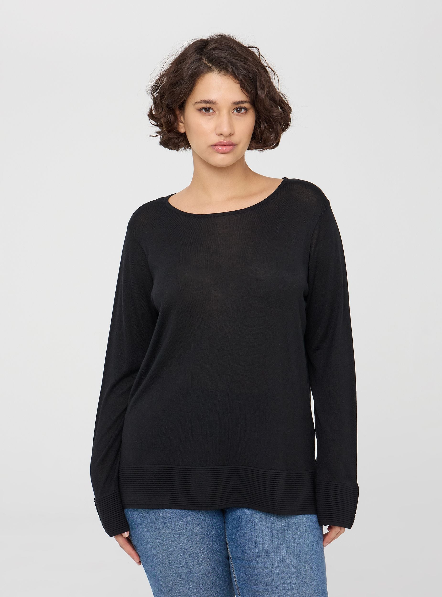 Bluză de damă uni. Prezintă un design simplu, cu decolteu rotund și mâneci lungi. Bluza are o croială confortabilă și ușor lejeră, ideală pentru un look casual, dar îngrijit. Marginile mânecilor și tivul inferior sunt finisate cu un detaliu cu nervuri care adaugă un plus de stil. Potrivită pentru a fi purtată atât cu pantaloni, cât și cu fuste.