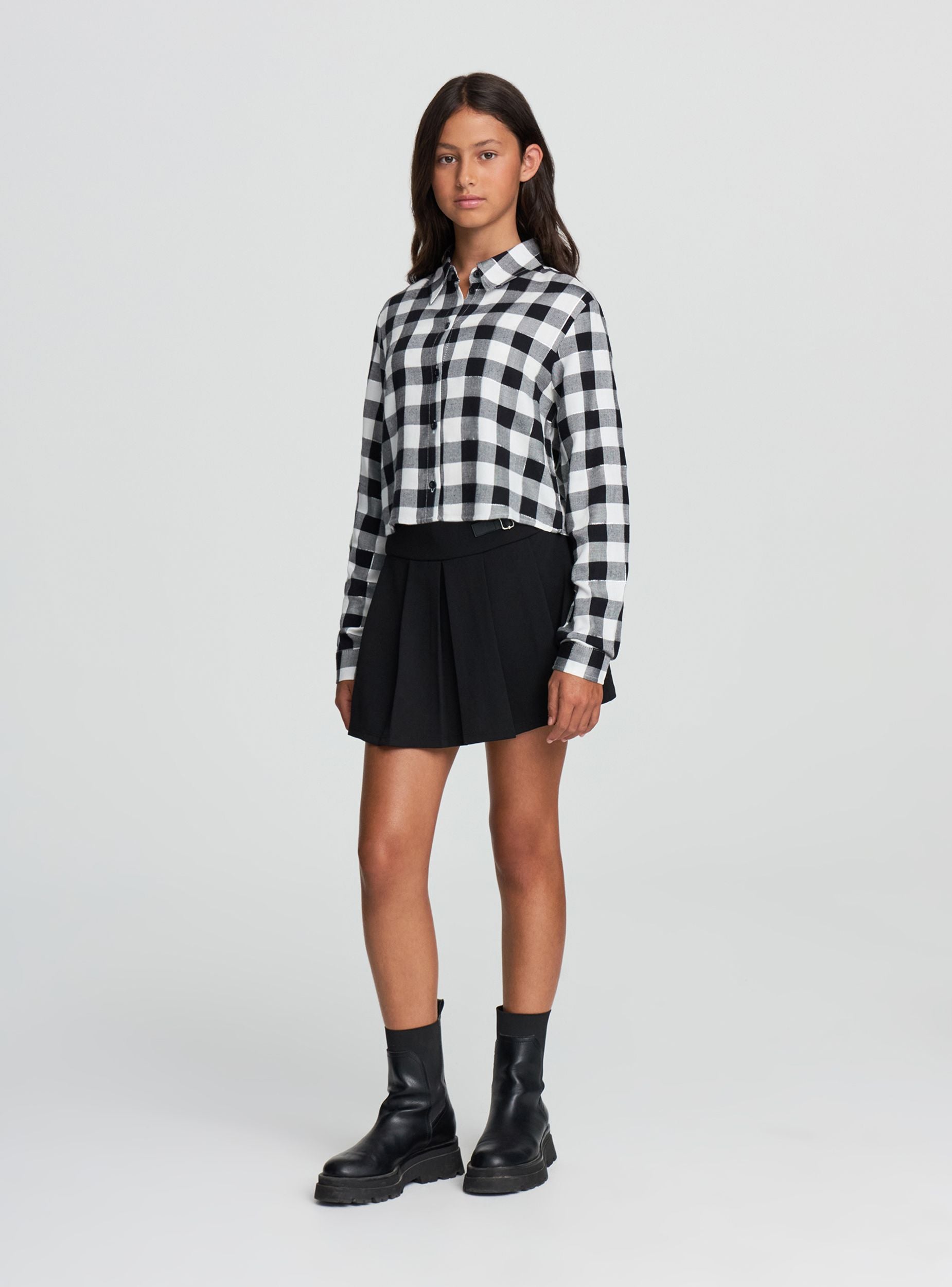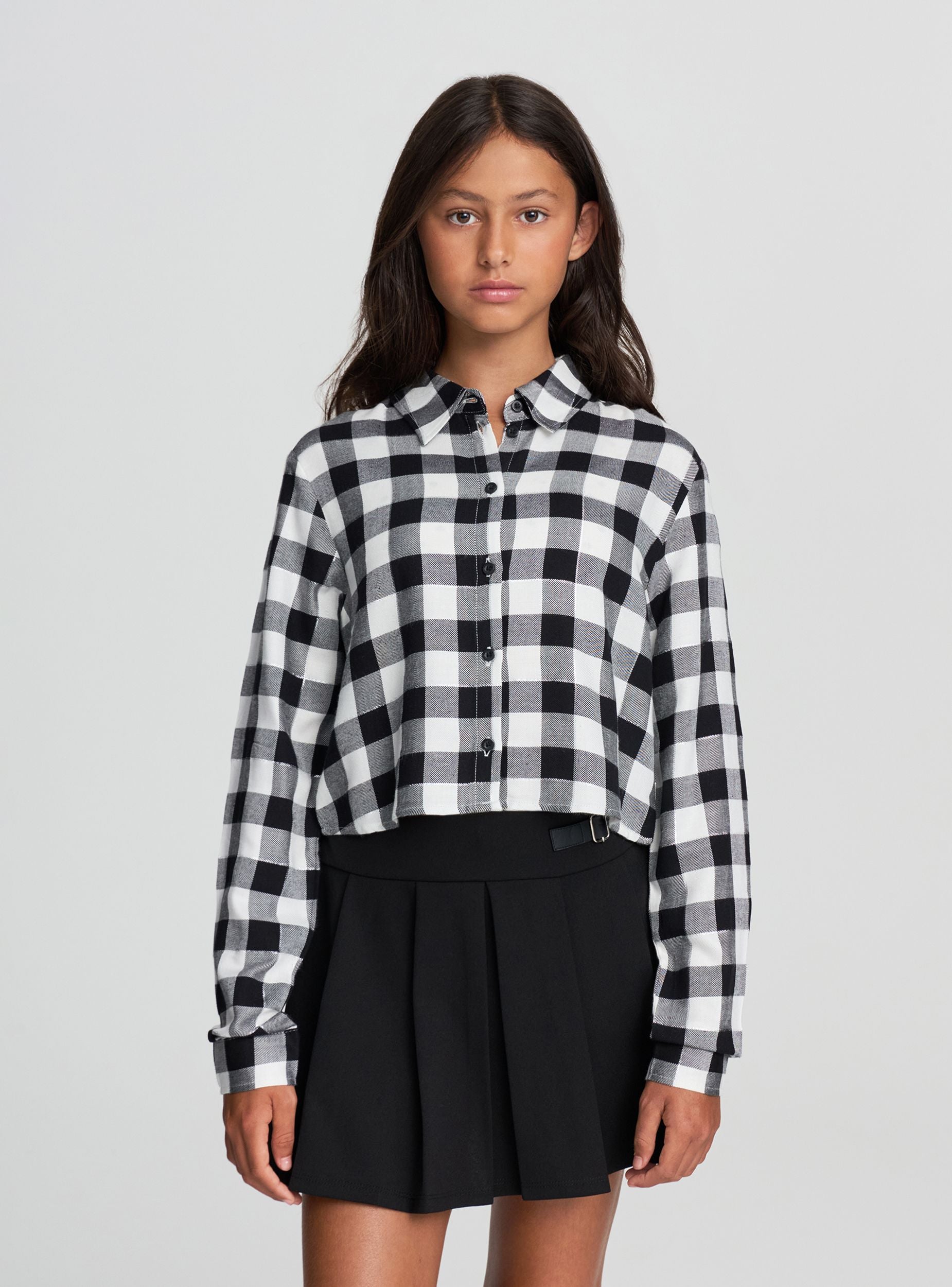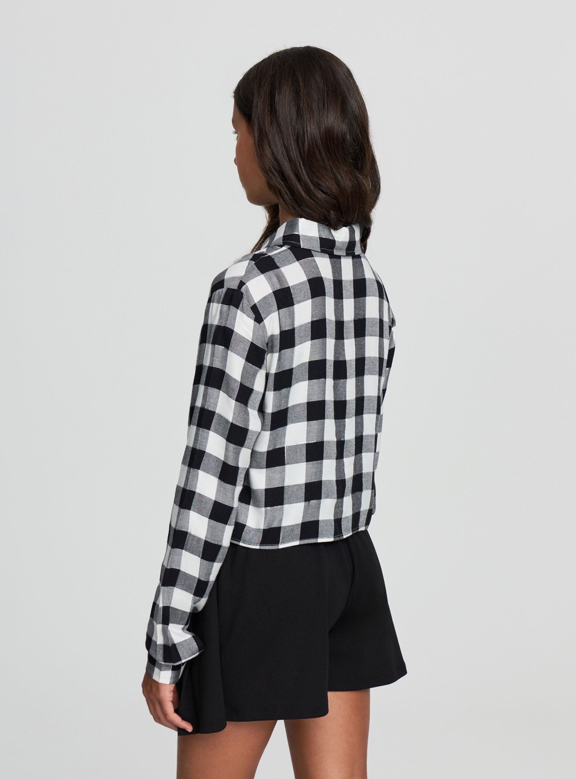 Cămașă pentru fete cu design crop și model în carouri. Echipată cu mâneci lungi și închidere cu nasturi, această cămașă se remarcă prin stilul său modern și versatil. Perfectă pentru a crea ținute casual și la modă, se potrivește ușor cu blugi sau pantaloni pentru un look proaspăt și dinamic. Ideală pentru zilele de relaxare sau ocazii informale.Detalii
