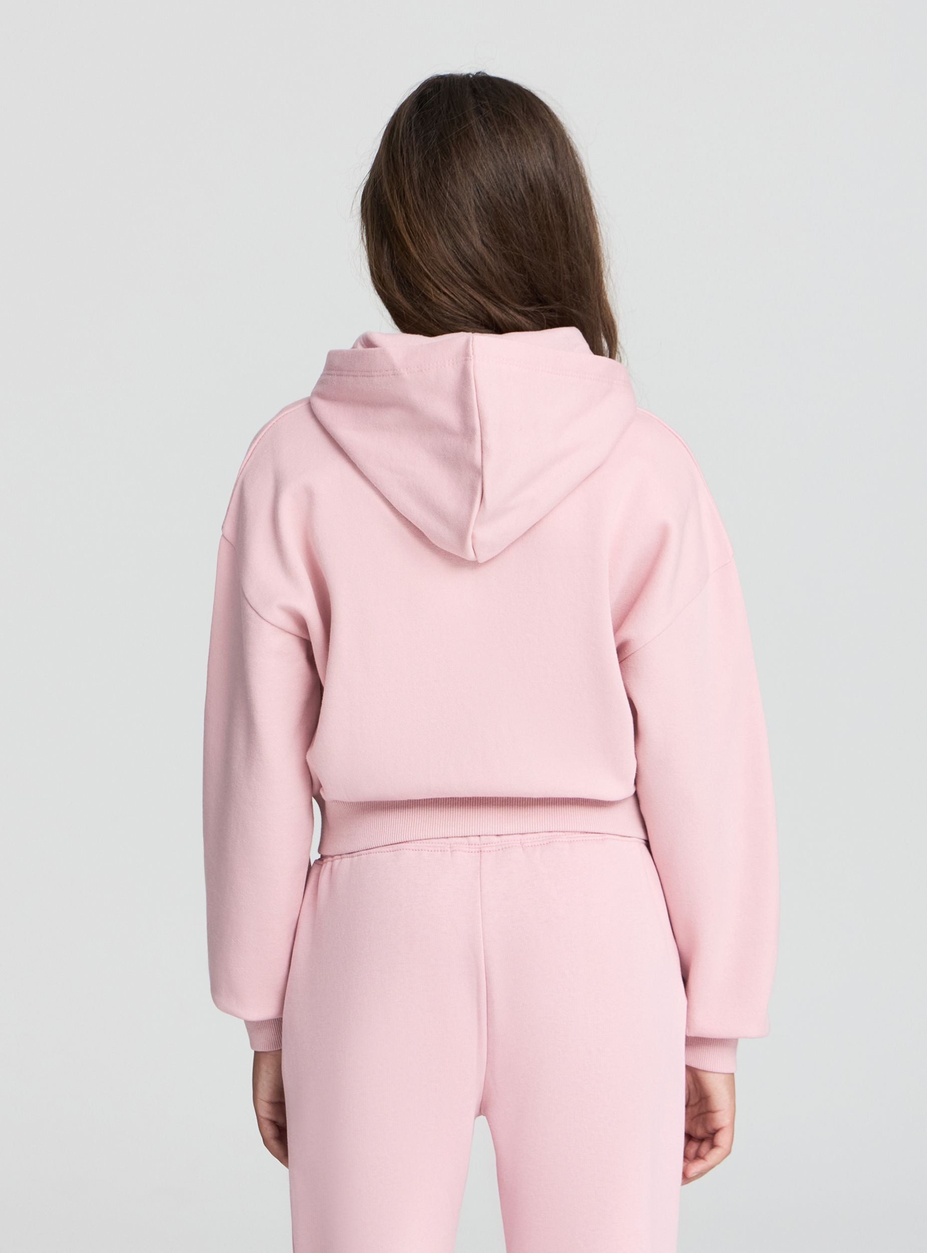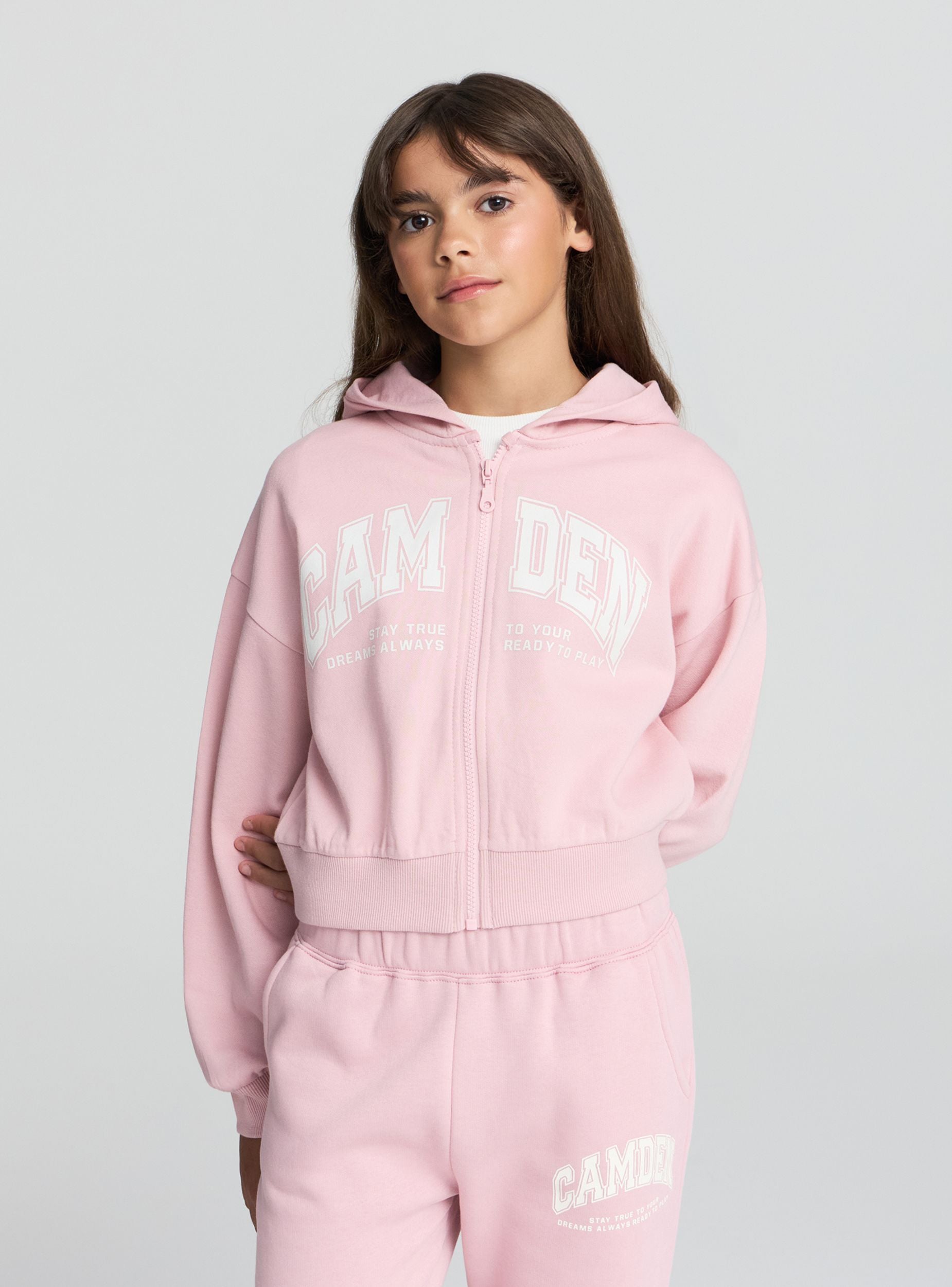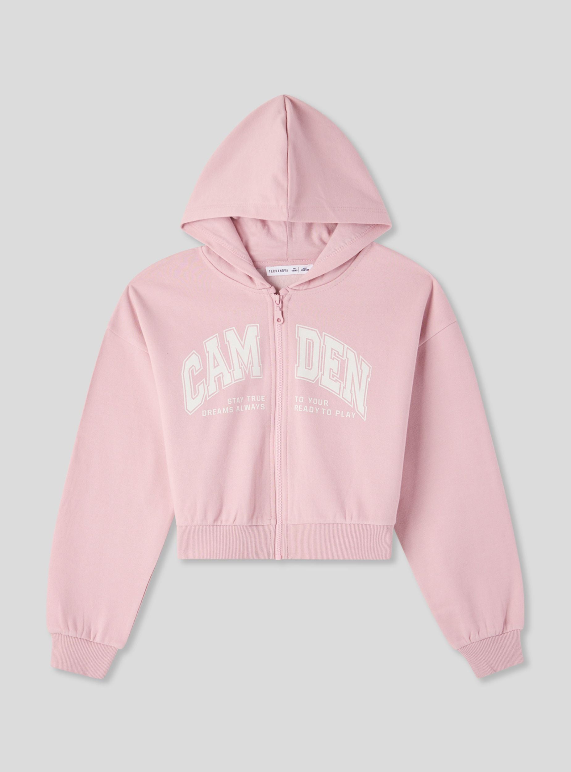 Hanorac gros pentru fete, cu glugă, caracterizat printr-o croială crop și închidere cu fermoar frontal. Designul prezintă o imprimare în stil colegiu american pe partea din față, ideală pentru a adăuga un plus de stil ținutelor zilnice. Mâneci lungi și manșete elastice asigură confort și practicitate, perfect de asortat cu blugi sau pantaloni sport pentru timpul liber sau școală.Detalii