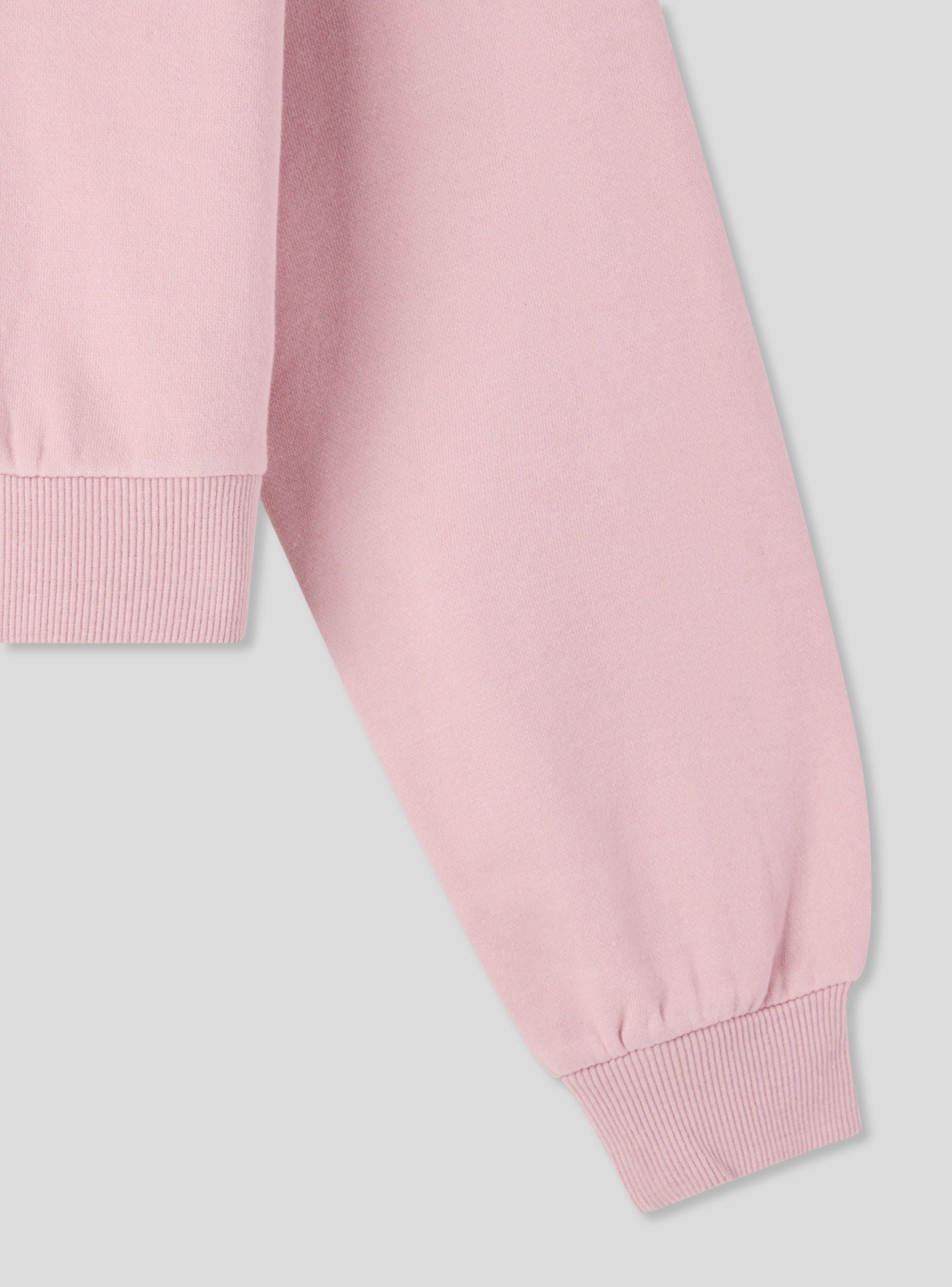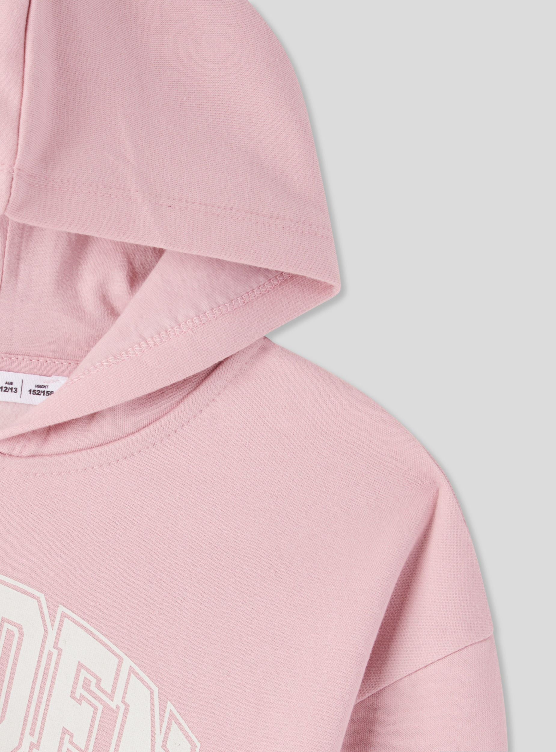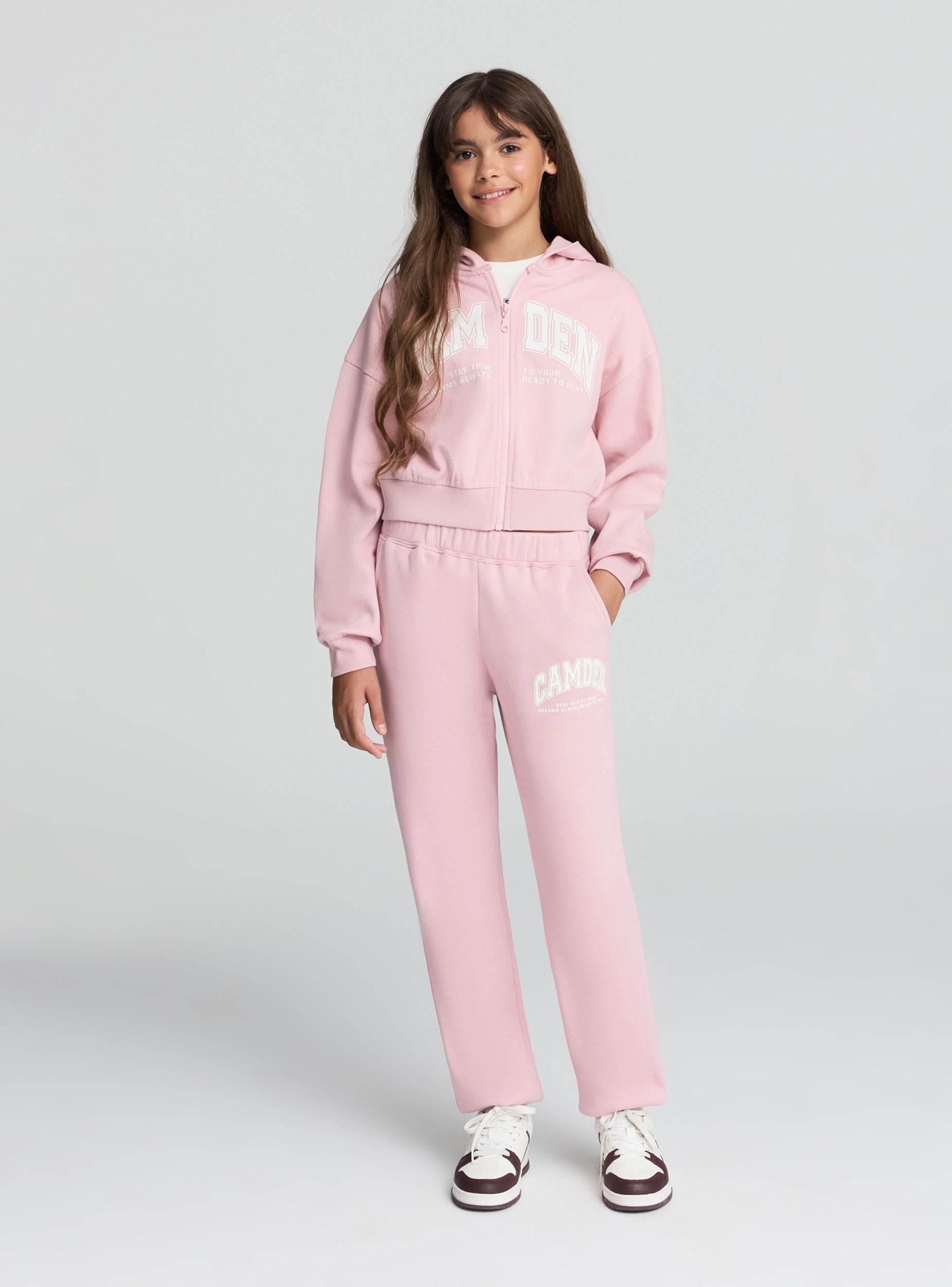 Hanorac gros pentru fete, cu glugă, caracterizat printr-o croială crop și închidere cu fermoar frontal. Designul prezintă o imprimare în stil colegiu american pe partea din față, ideală pentru a adăuga un plus de stil ținutelor zilnice. Mâneci lungi și manșete elastice asigură confort și practicitate, perfect de asortat cu blugi sau pantaloni sport pentru timpul liber sau școală.Detalii