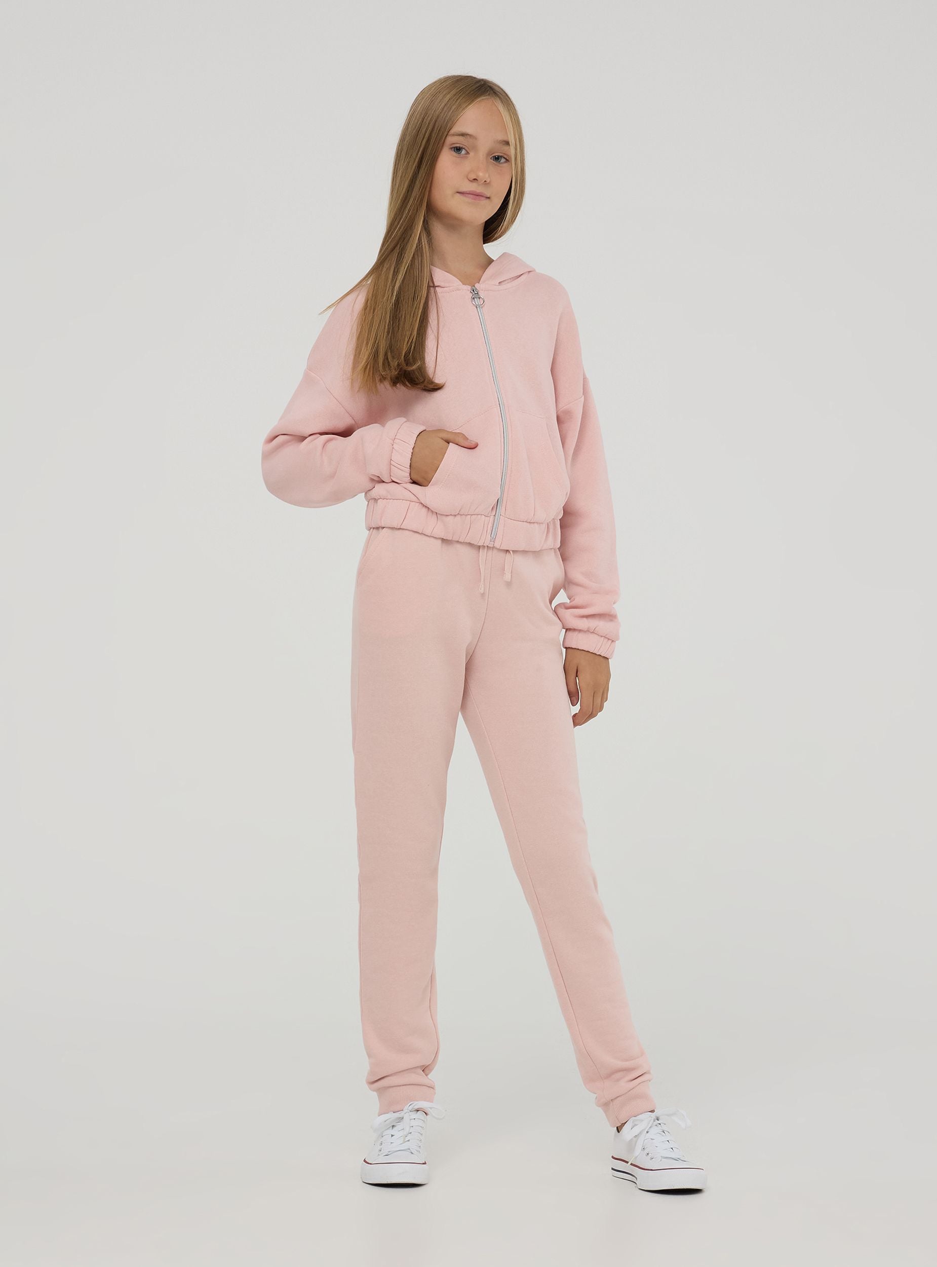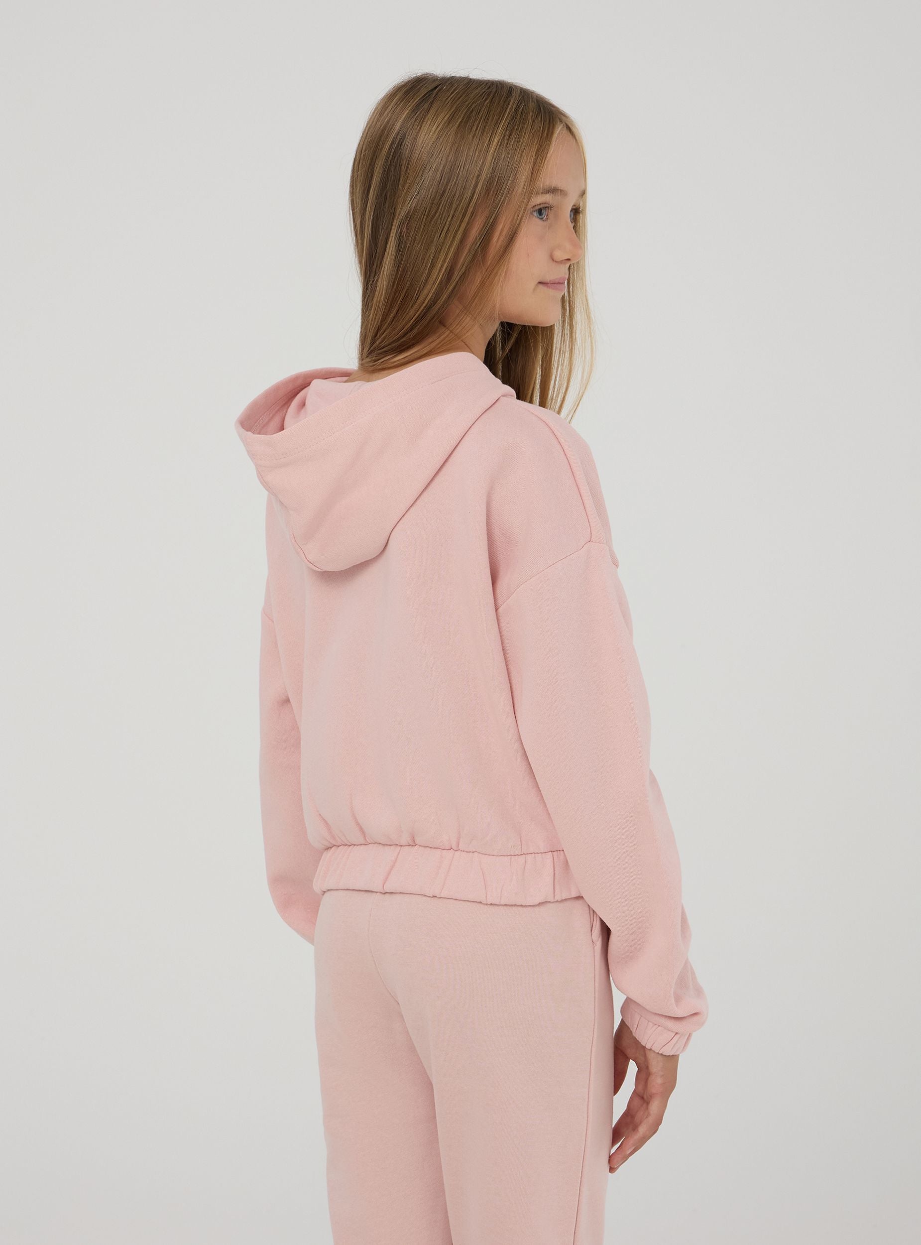 Hanorac gros pentru fete, cu glugă, prevăzut cu închidere frontală cu fermoar. Hanoracul are un croi cropped și un design modern. În partea din față sunt două buzunare tip marsupiu pentru o mai mare practicitate. Gluga este largă și oferă o protecție suplimentară împotriva frigului. Partea din spate este simplă, fără detalii adiționale. Finisajul este moale și confortabil, potrivit pentru utilizarea zilnică în sezonul rece.Detalii