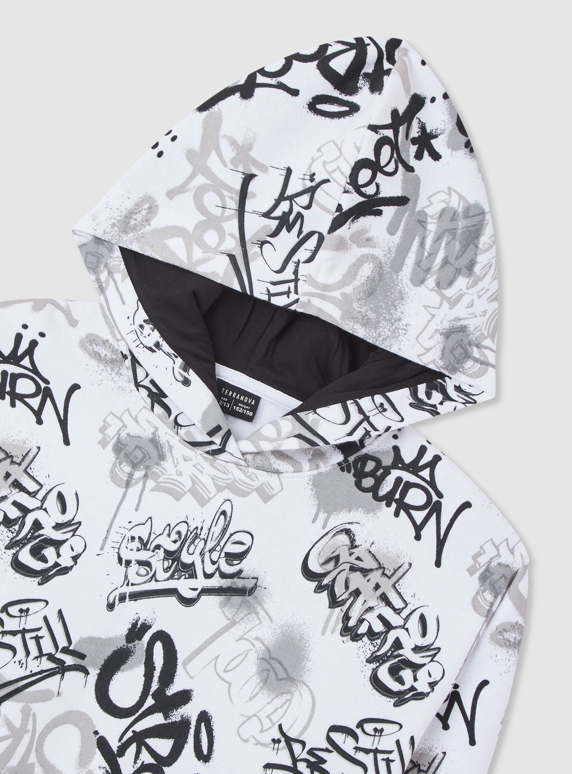 Hanorac gros pentru copii, cu glugă, caracterizat printr-o imprimare graffiti pe toată suprafața. Ideal pentru un look casual și modern, perfect pentru timpul liber sau pentru a completa ținute streetwear. Croială comodă și design atractiv, cu detalii care îl fac unic și la modă.Detalii