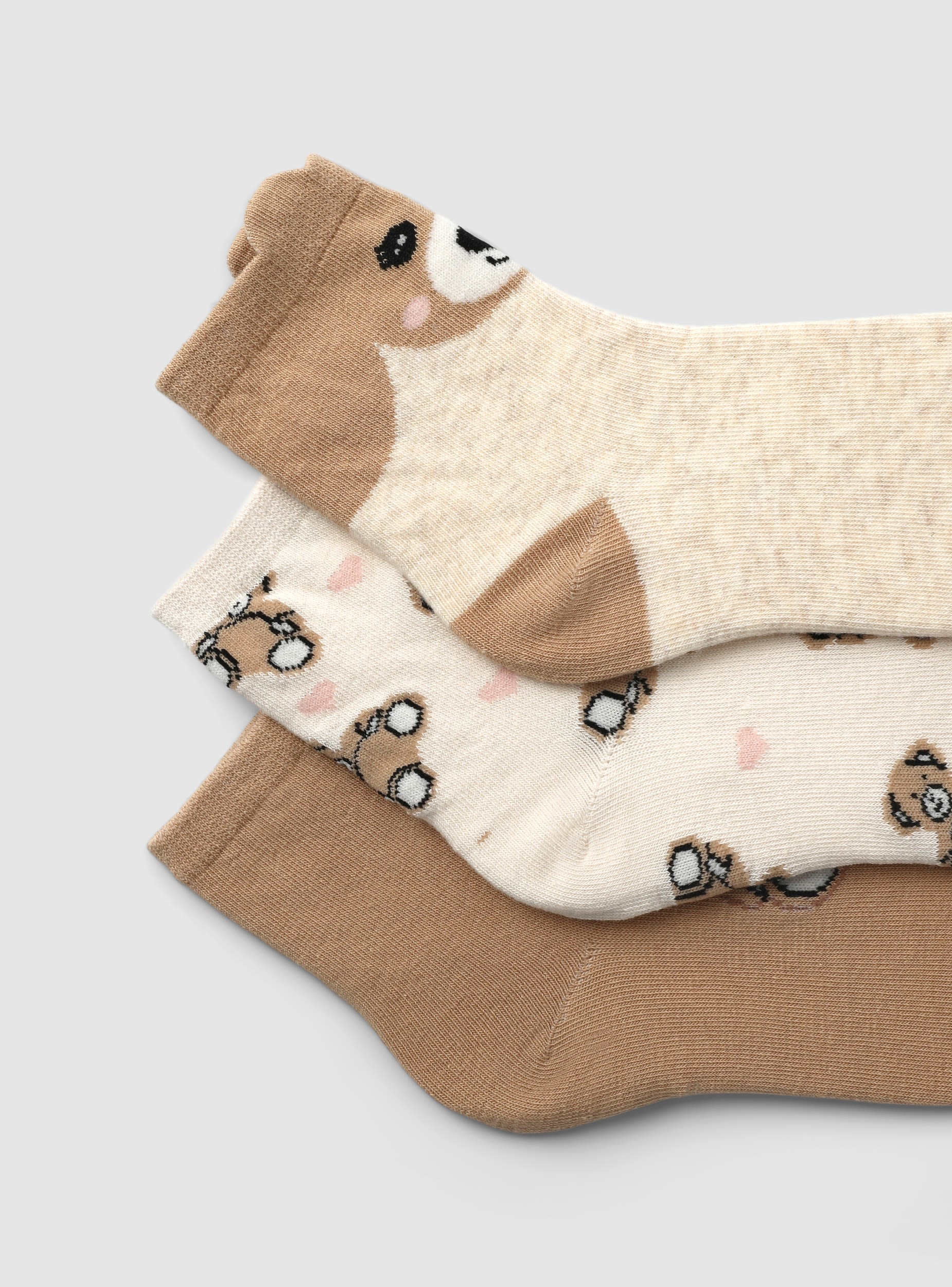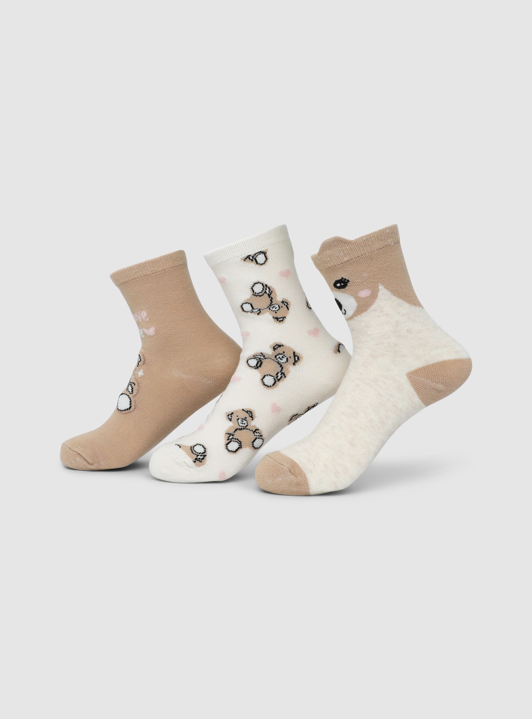 Set format din 3 perechi de șosete pentru fete cu model ursuleți. Ideal pentru a adăuga o notă amuzantă și jucăușă ținutelor de zi cu zi. Perfecte pentru a fi purtate cu pantofi sport sau casual, asigură confort și o potrivire optimă datorită elasticității lor. Un accesoriu versatil și practic pentru a completa garderoba celor mici.