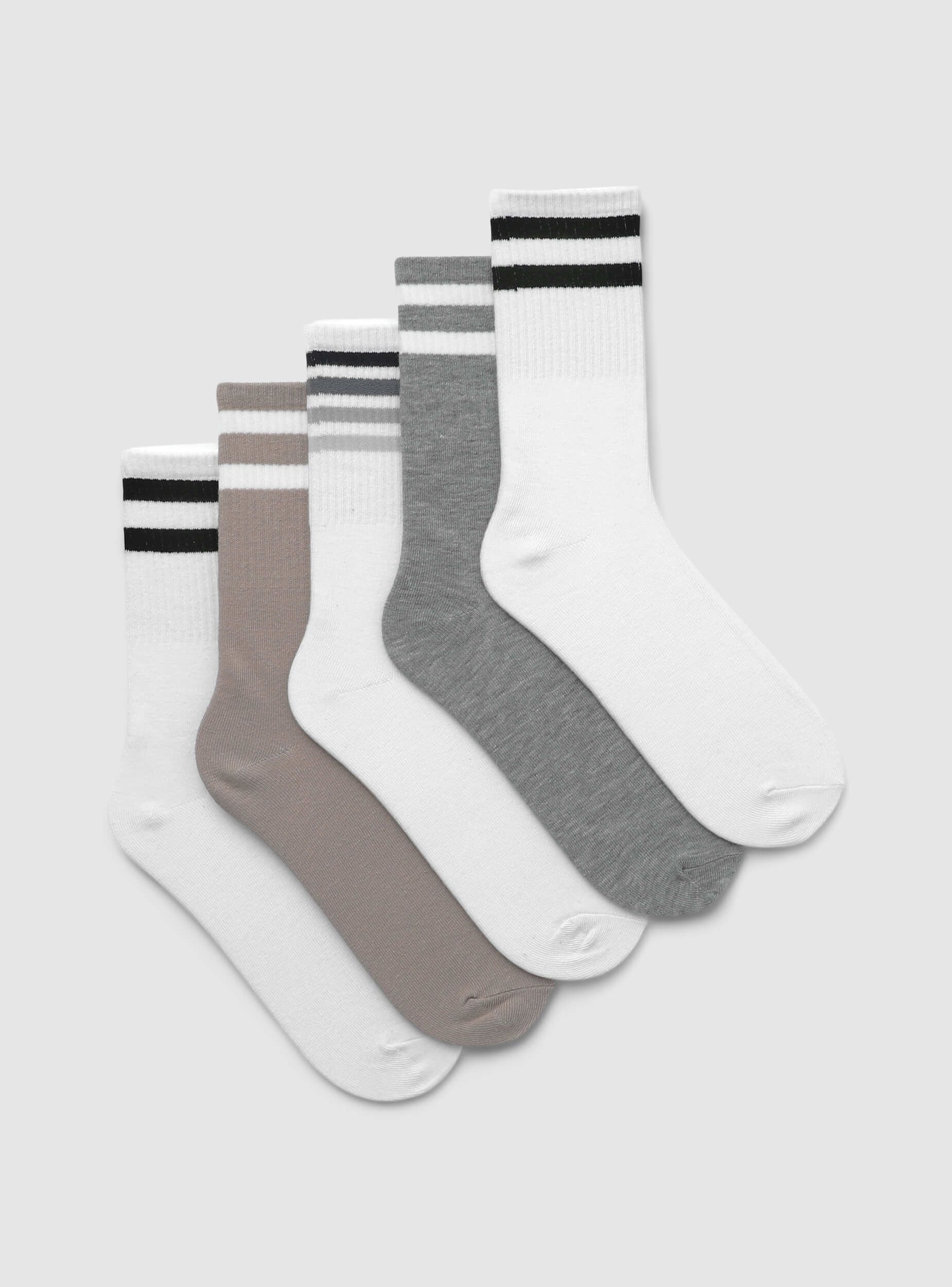 Pachet format din 5 perechi de șosete pentru femei. Fiecare pereche are un design cu dungi în partea superioară, ideal pentru un look casual și sportiv. Perfecte pentru a fi purtate cu adidași sau pantofi joși, aceste șosete oferă confort și stil pentru orice ocazie. Pachetul include diverse culori pentru a se potrivi cu diferite ținute.
