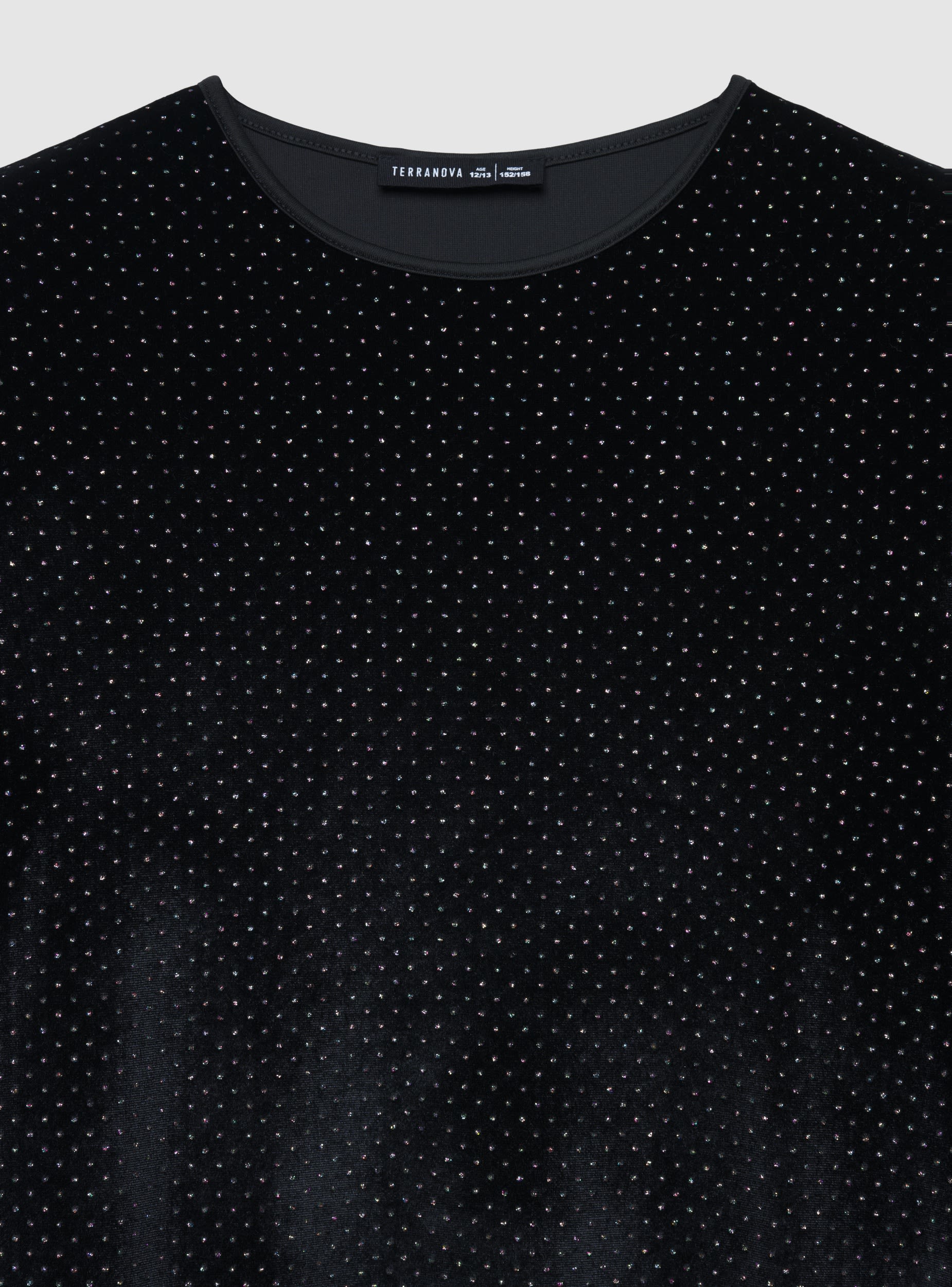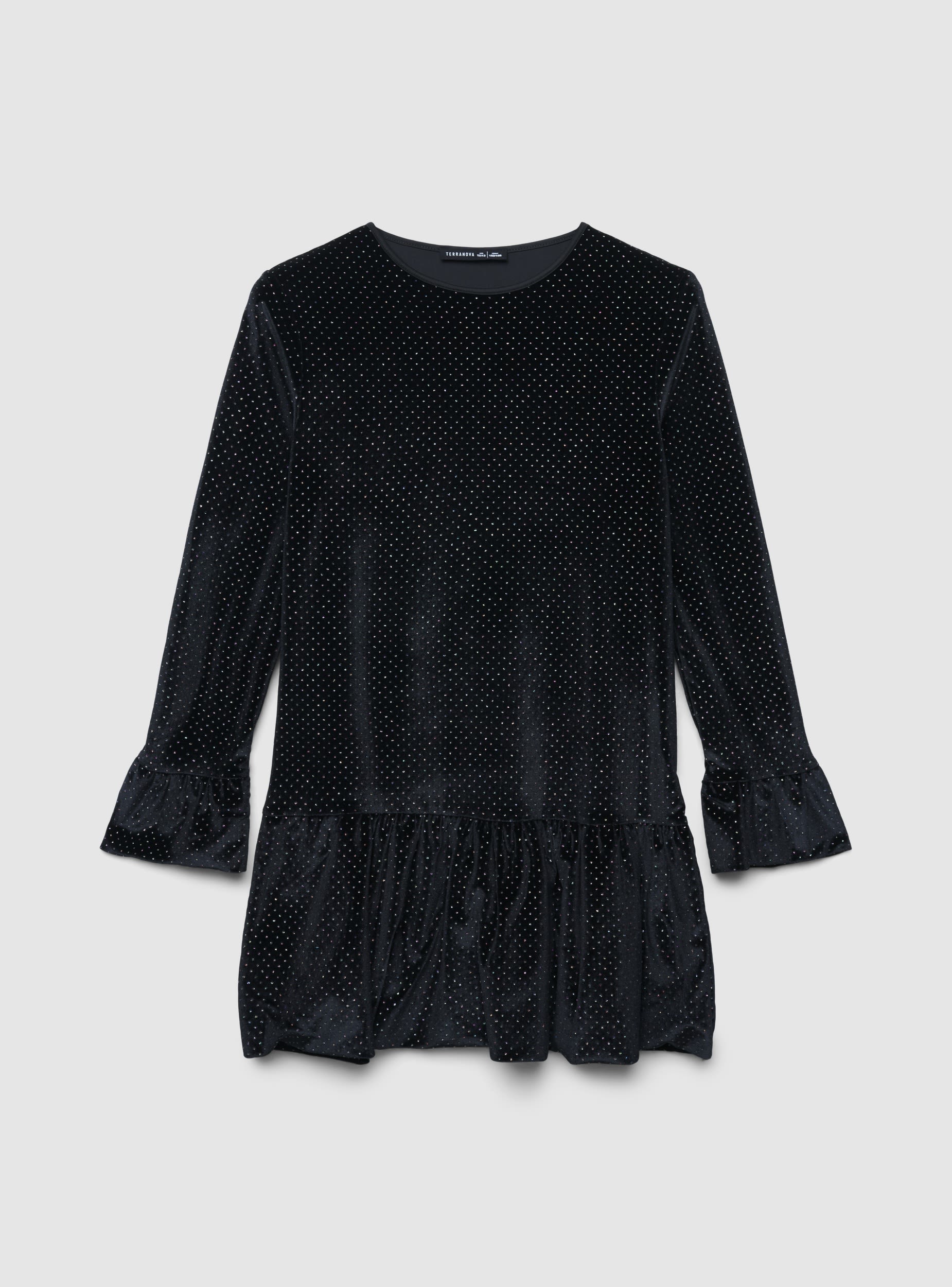Rochie cu mâneci lungi pentru fete, concepută să strălucească la orice ocazie. Designul integral cu sclipici oferă un efect luminos și distractiv, perfect pentru petreceri, evenimente sau momente speciale. Croiala dreaptă cu volănaș la bază adaugă mișcare siluetei, în timp ce gulerul rotund asigură confort și practicitate. O piesă cu un aspect strălucitor care îmbină stilul cu confortul.Detalii