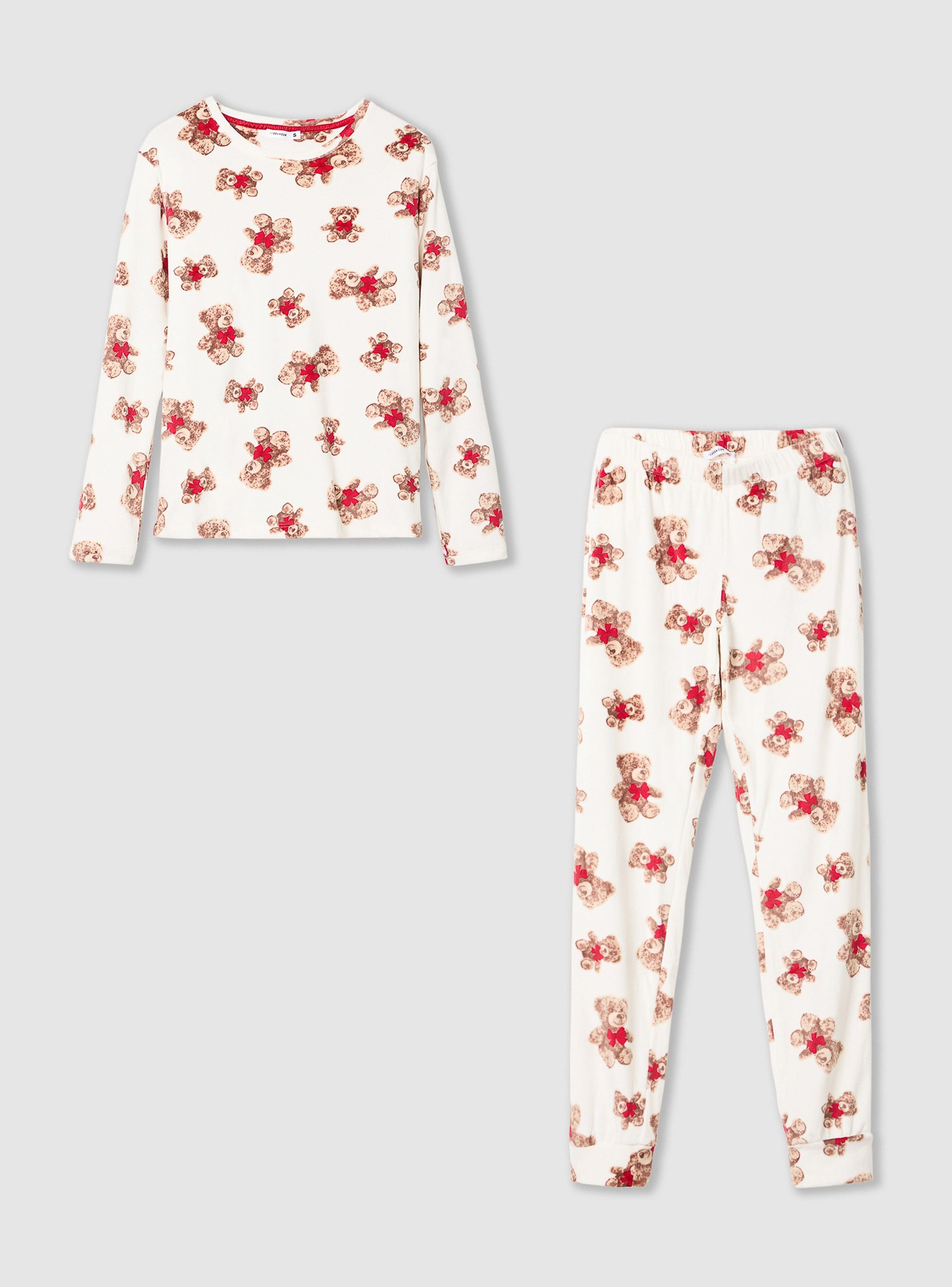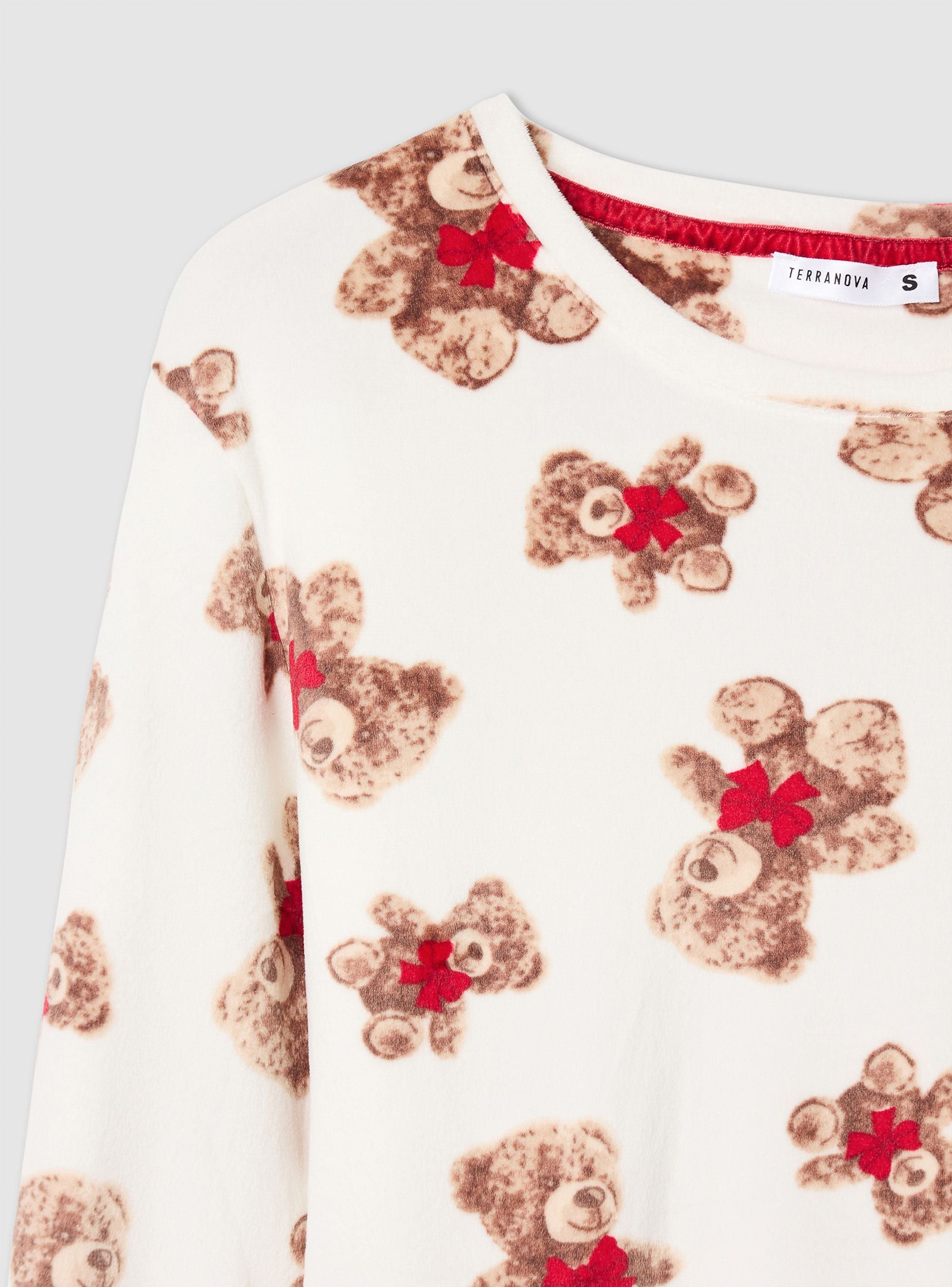 Set compus din pijama de damă cu bluză cu mâneci lungi și pantaloni lungi, ideal pentru momente de relaxare și confort. Bluza are o imprimeu viu colorat cu ursuleți, cu decolteu rotund și croială normală. Pantalonii sunt asortați, oferind un aspect armonios și confortabil. Perfect pentru seri liniștite sau pentru o ținută comodă acasă.