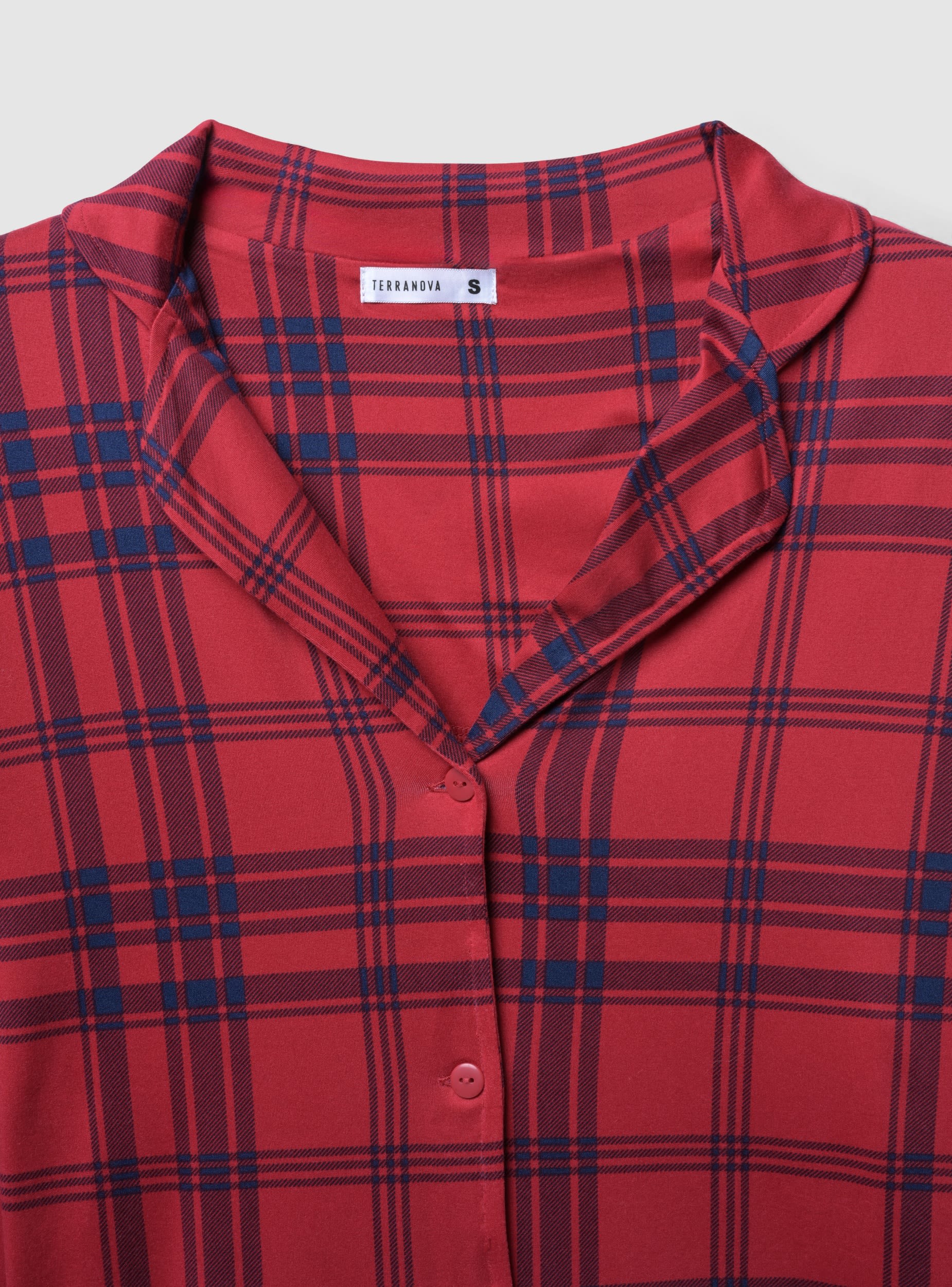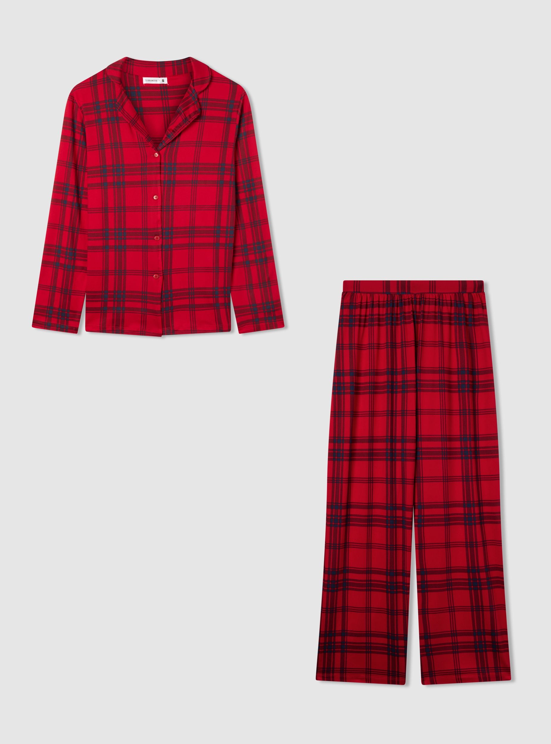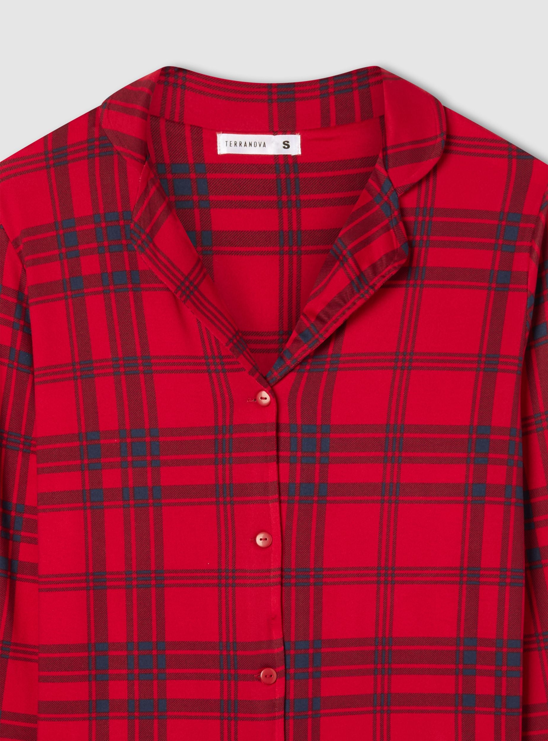 Pijama de damă compus din cămașă cu mâneci lungi și pantaloni lungi. Cămașa are un guler cu rever și închidere cu nasturi, iar pantalonii sunt prevăzuți cu talie elastică pentru un confort maxim. Designul cu model în carouri adaugă o notă de stil, făcându-l ideal pentru momentele de relaxare acasă. Perfect pentru cei care caută practicitate și versatilitate fără a renunța la eleganță.Detalii