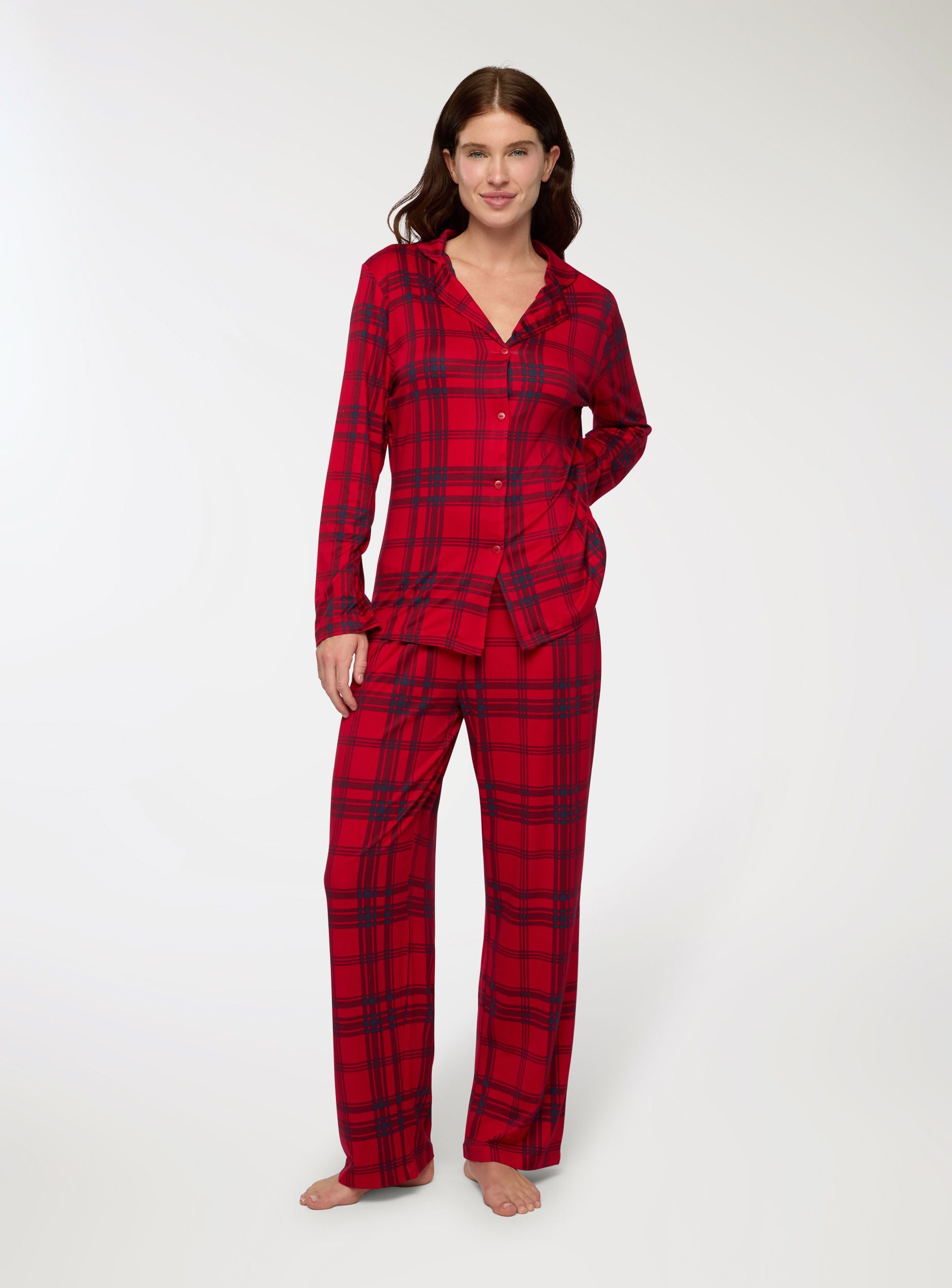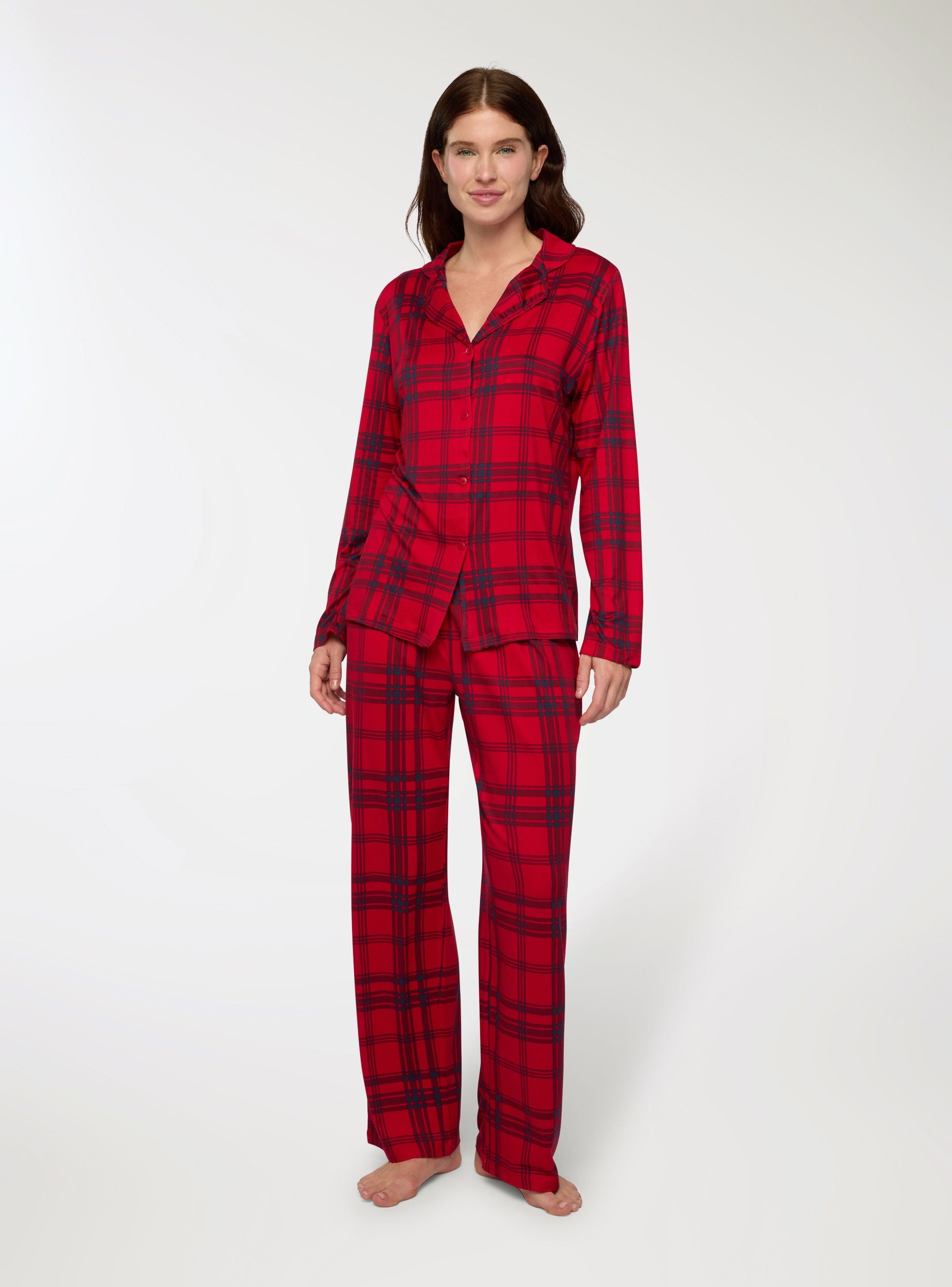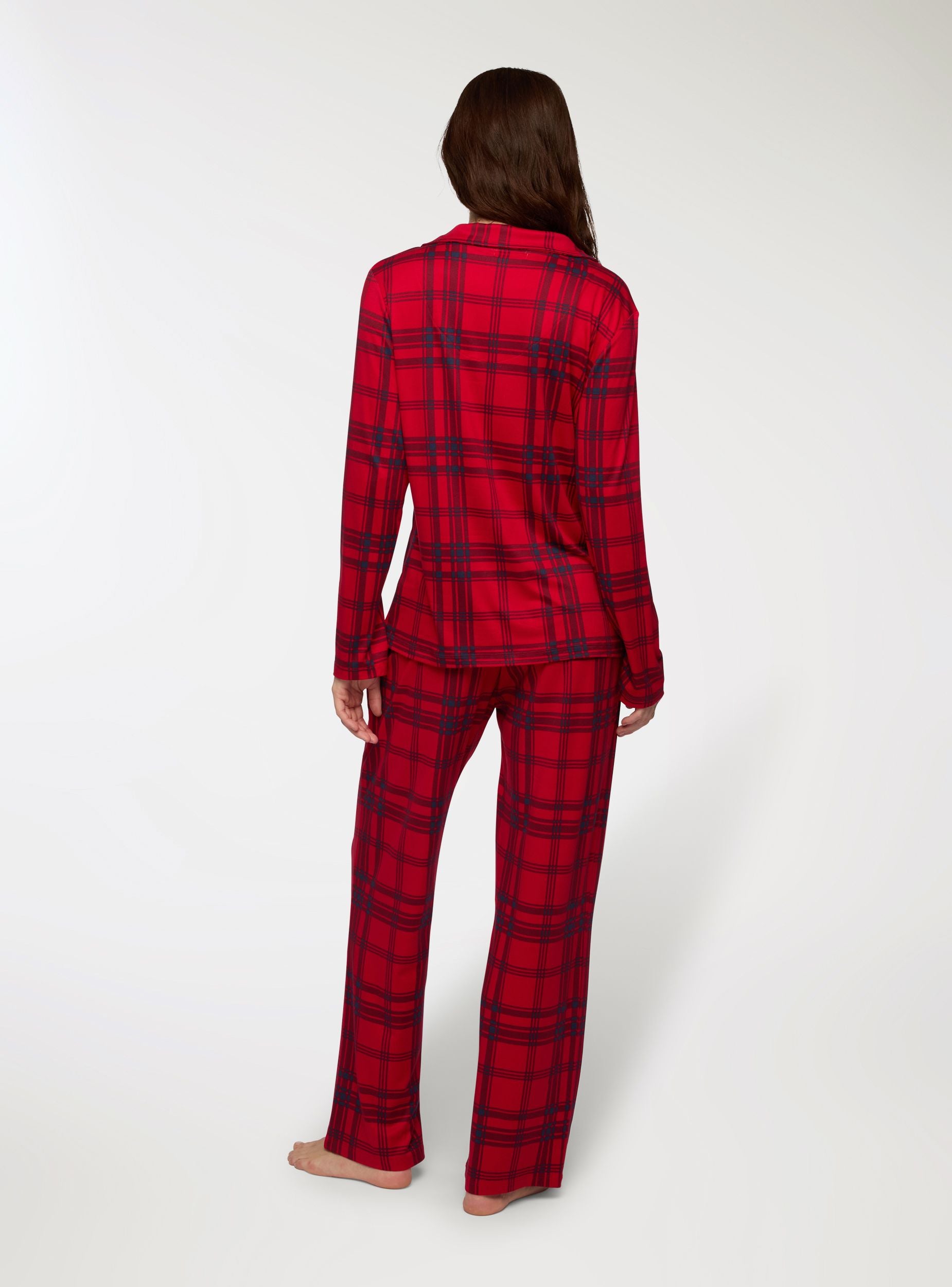 Pijama de damă compus din cămașă cu mâneci lungi și pantaloni lungi. Cămașa are un guler cu rever și închidere cu nasturi, iar pantalonii sunt prevăzuți cu talie elastică pentru un confort maxim. Designul cu model în carouri adaugă o notă de stil, făcându-l ideal pentru momentele de relaxare acasă. Perfect pentru cei care caută practicitate și versatilitate fără a renunța la eleganță.Detalii