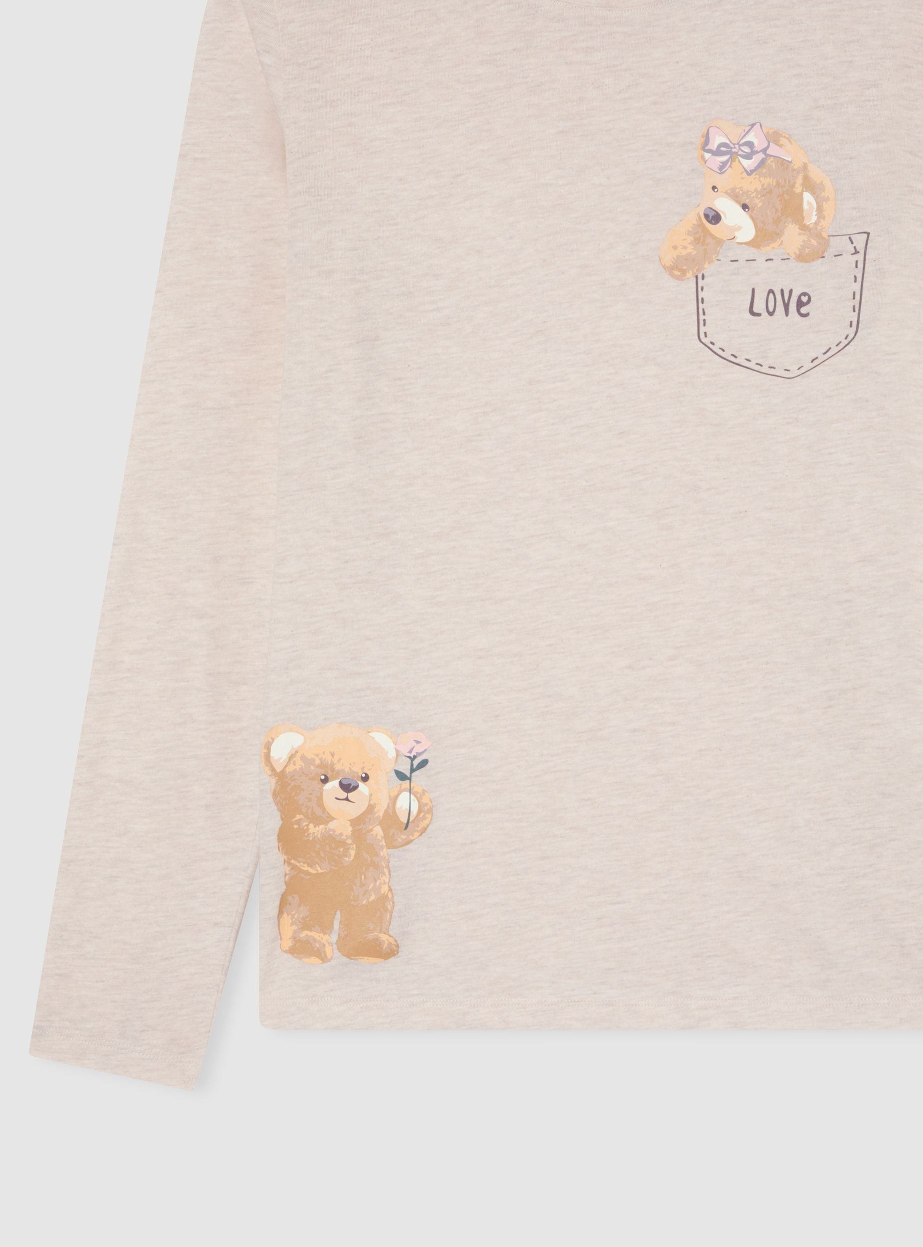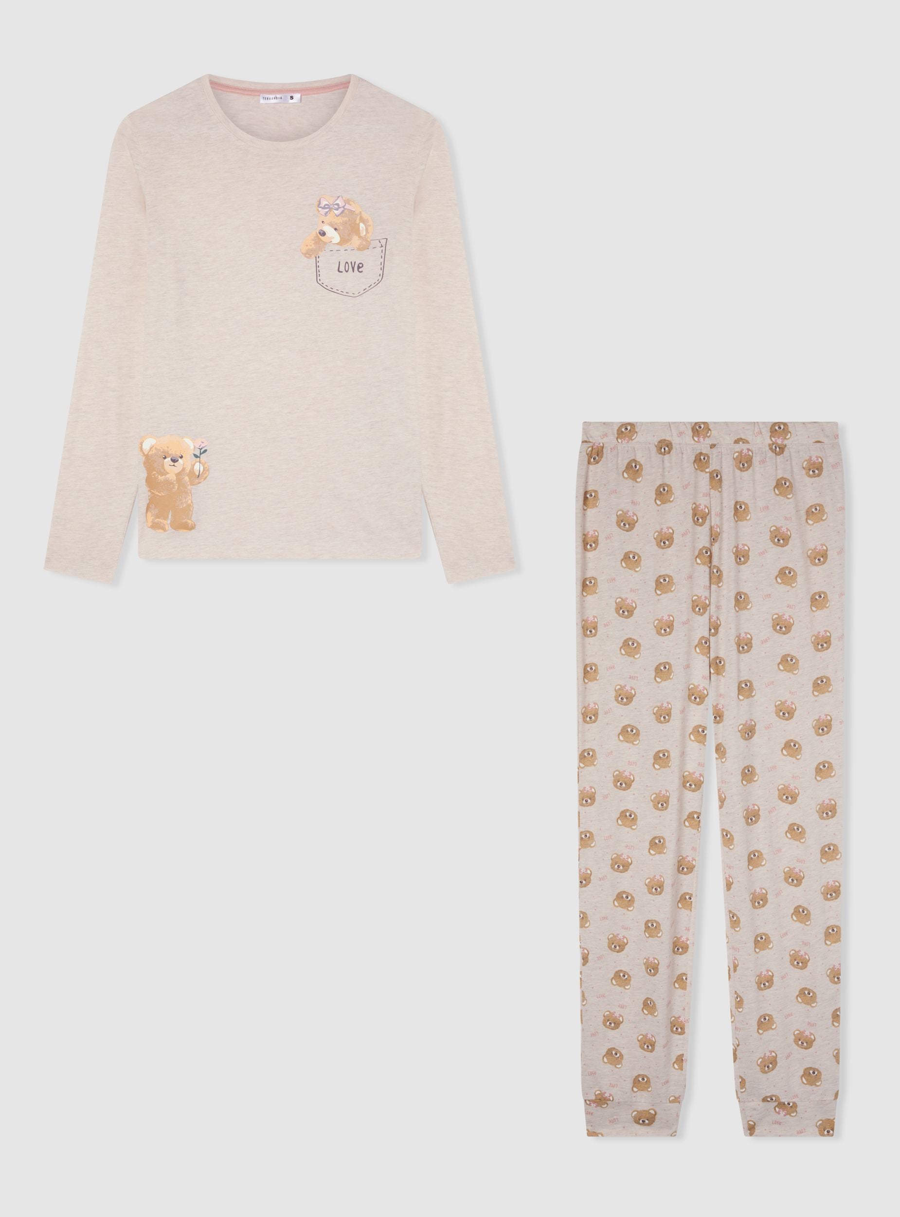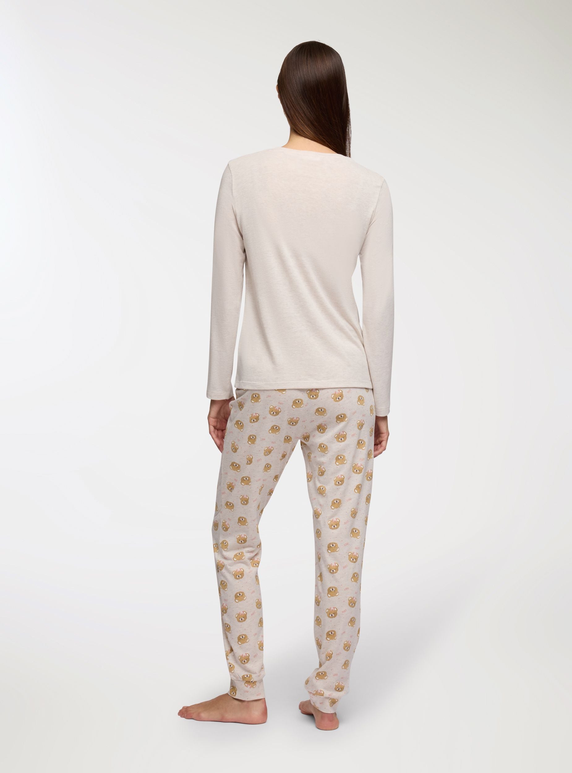 Set pijama damă compus din tricou cu mâneci lungi și pantaloni lungi. Tricoul are o imprimeu cu ursuleți și detalii decorative, în timp ce pantalonii prezintă un model repetat cu ursuleți. Ideal pentru momente de relaxare și confort, acest pijama oferă o croială regulară. Perfect pentru seri liniștite sau ca idee de cadou.Detalii