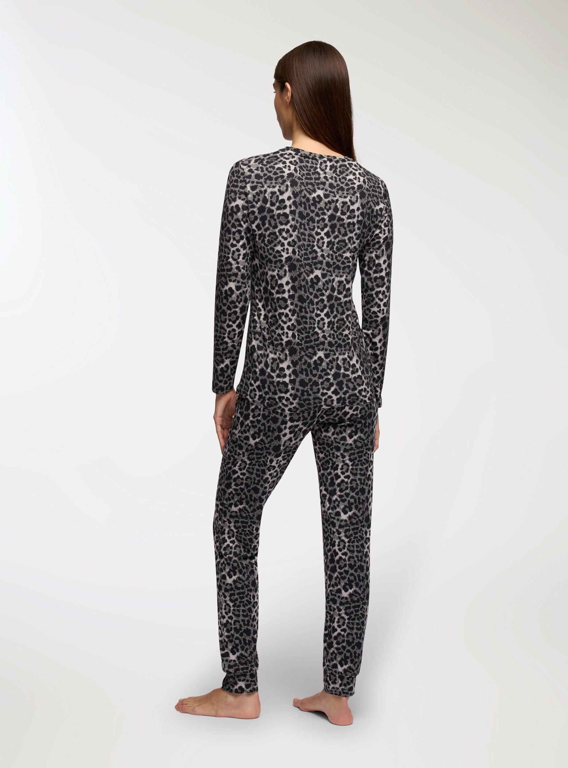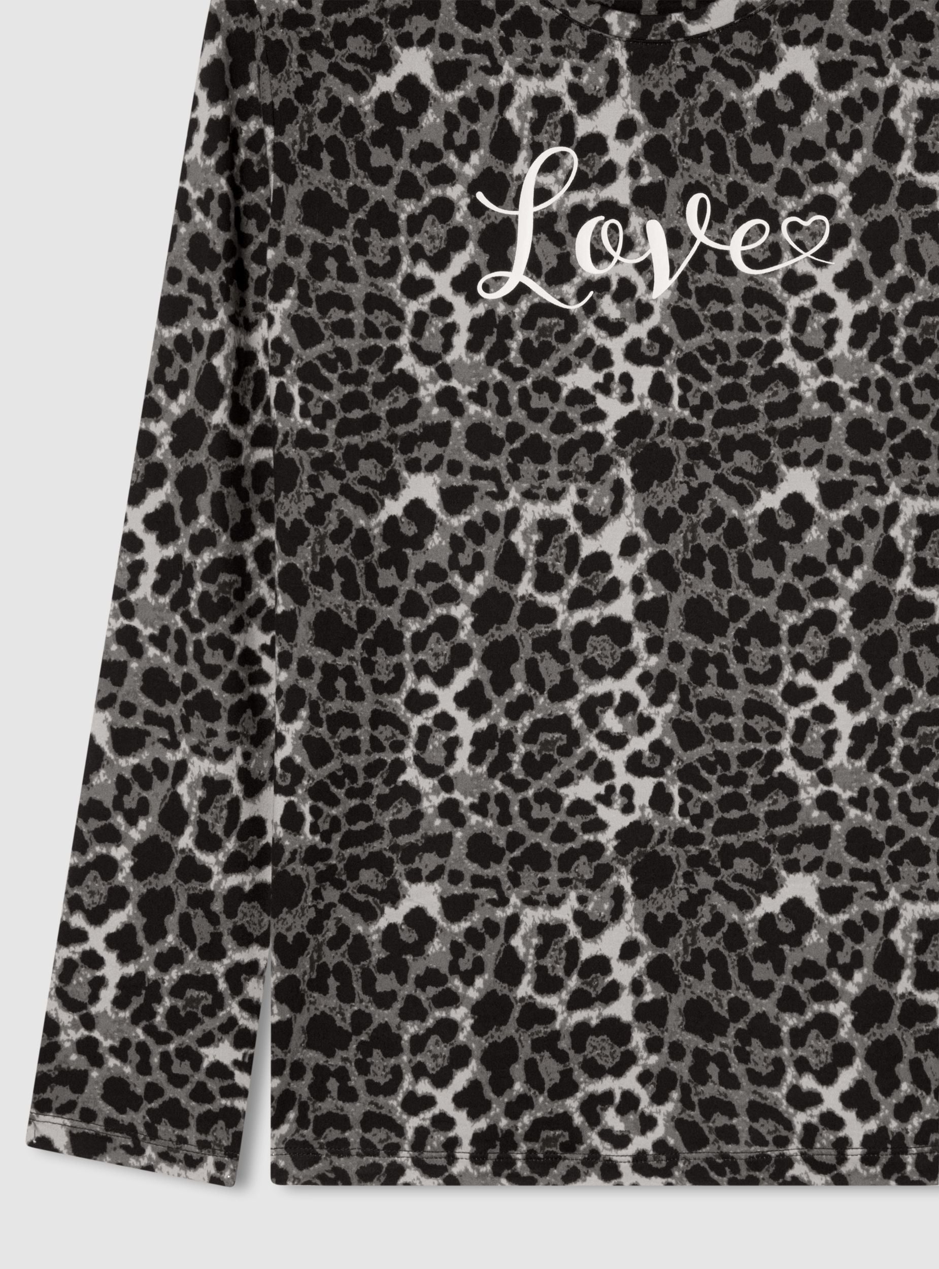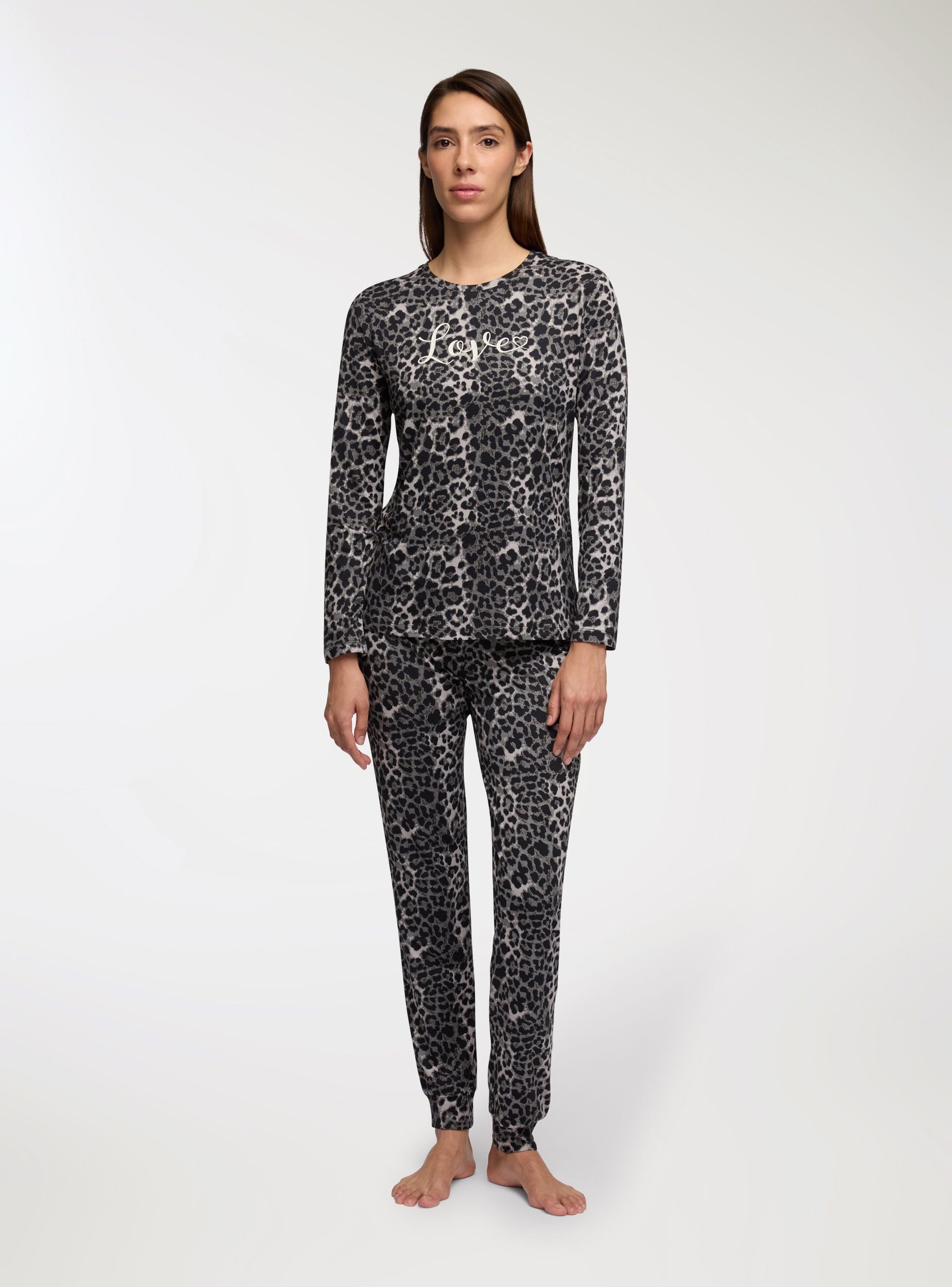 Set de pijama pentru femei, compus dintr-un tricou cu mâneci lungi și pantaloni lungi. Tricoul are o inscripție decorativă pe față și un design cu imprimeu animalier. Pantalonii sunt prevăzuți cu elastic în talie pentru o potrivire confortabilă. Ideal pentru relaxare acasă sau pentru somn, acest pijama combină stilul și confortul într-un singur articol.Detalii
