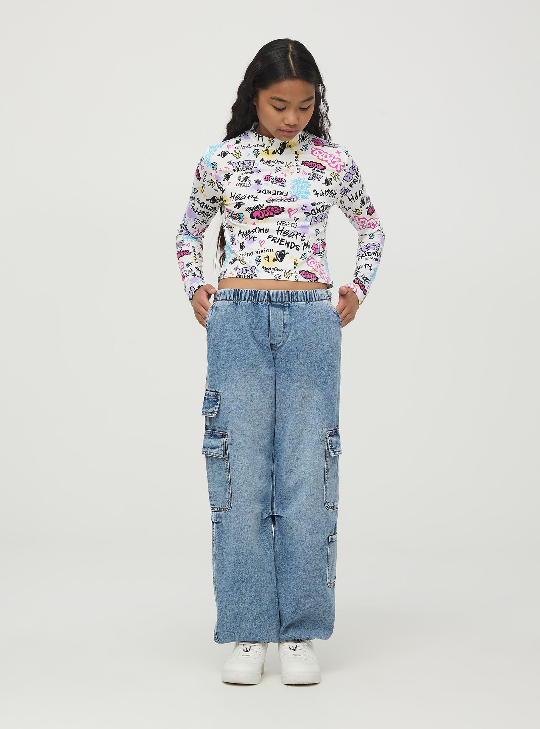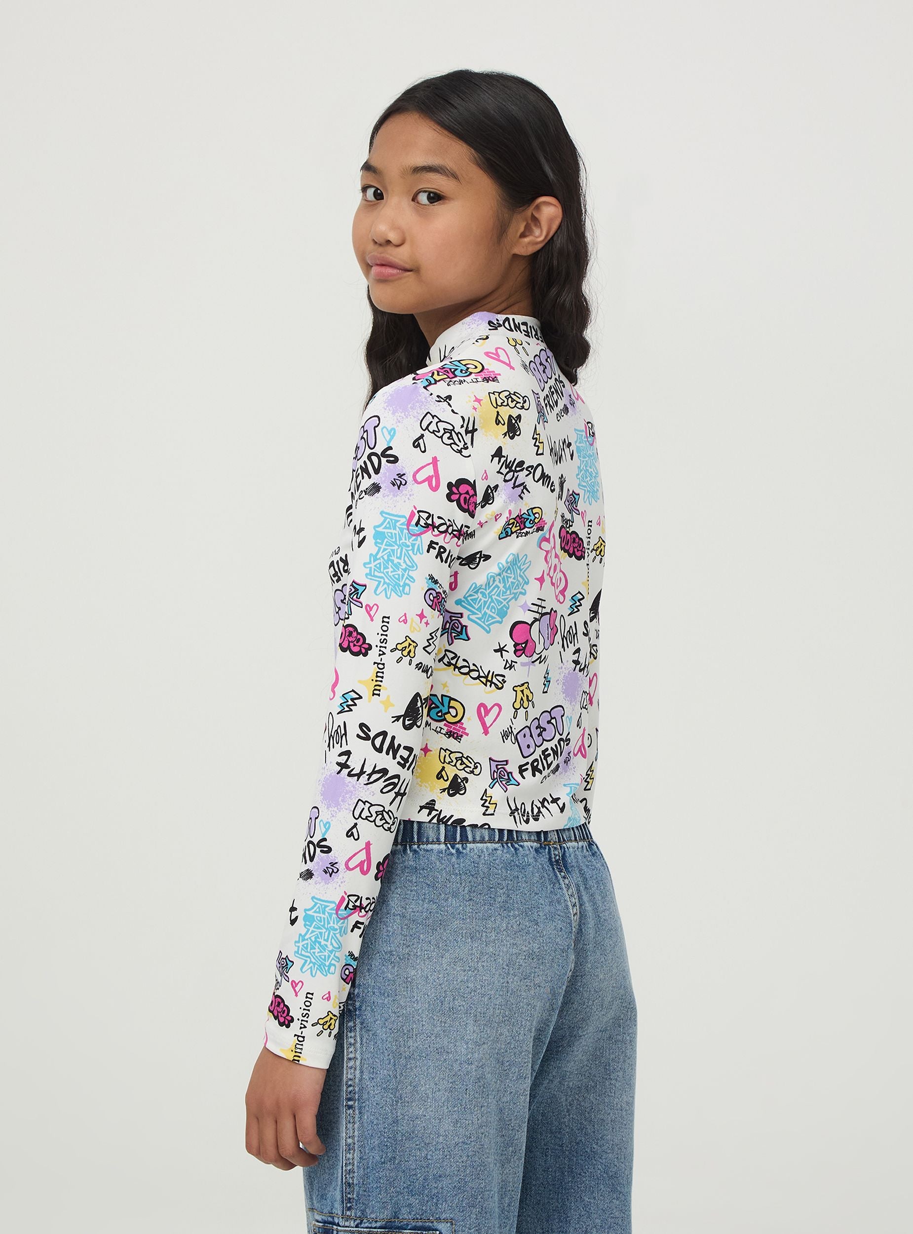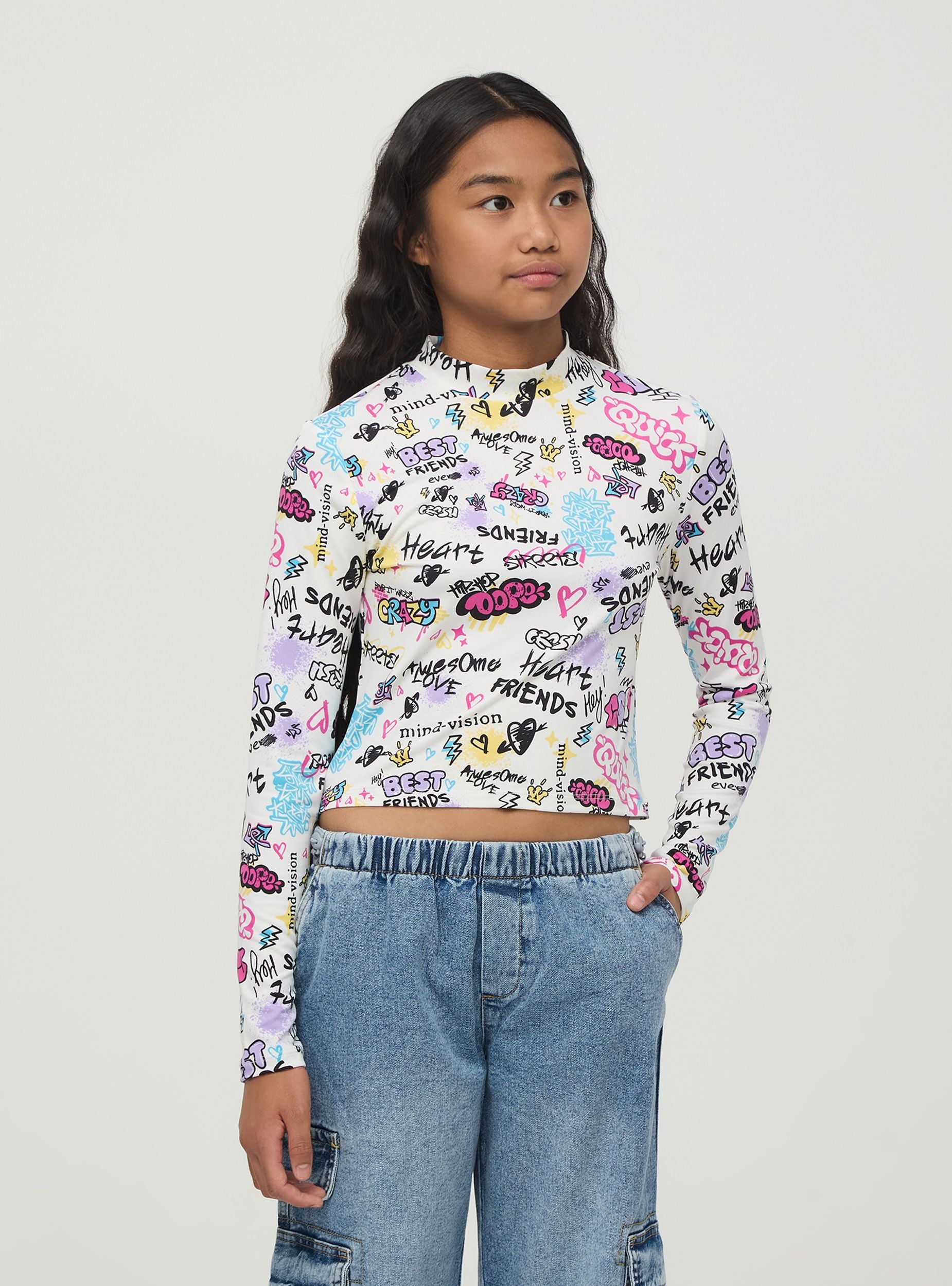 Bluză cu mâneci lungi pentru fete, cu imprimeu graffiti viu colorat pe toată suprafața, cu desene și inscripții. Țesătura soft touch oferă o senzație de confort și moliciune. Ideală pentru timpul liber și activitățile zilnice, această bluză se potrivește perfect cu blugi, fuste sau pantaloni, garantând stil și confort pentru orice ocazie. Croială regulară.