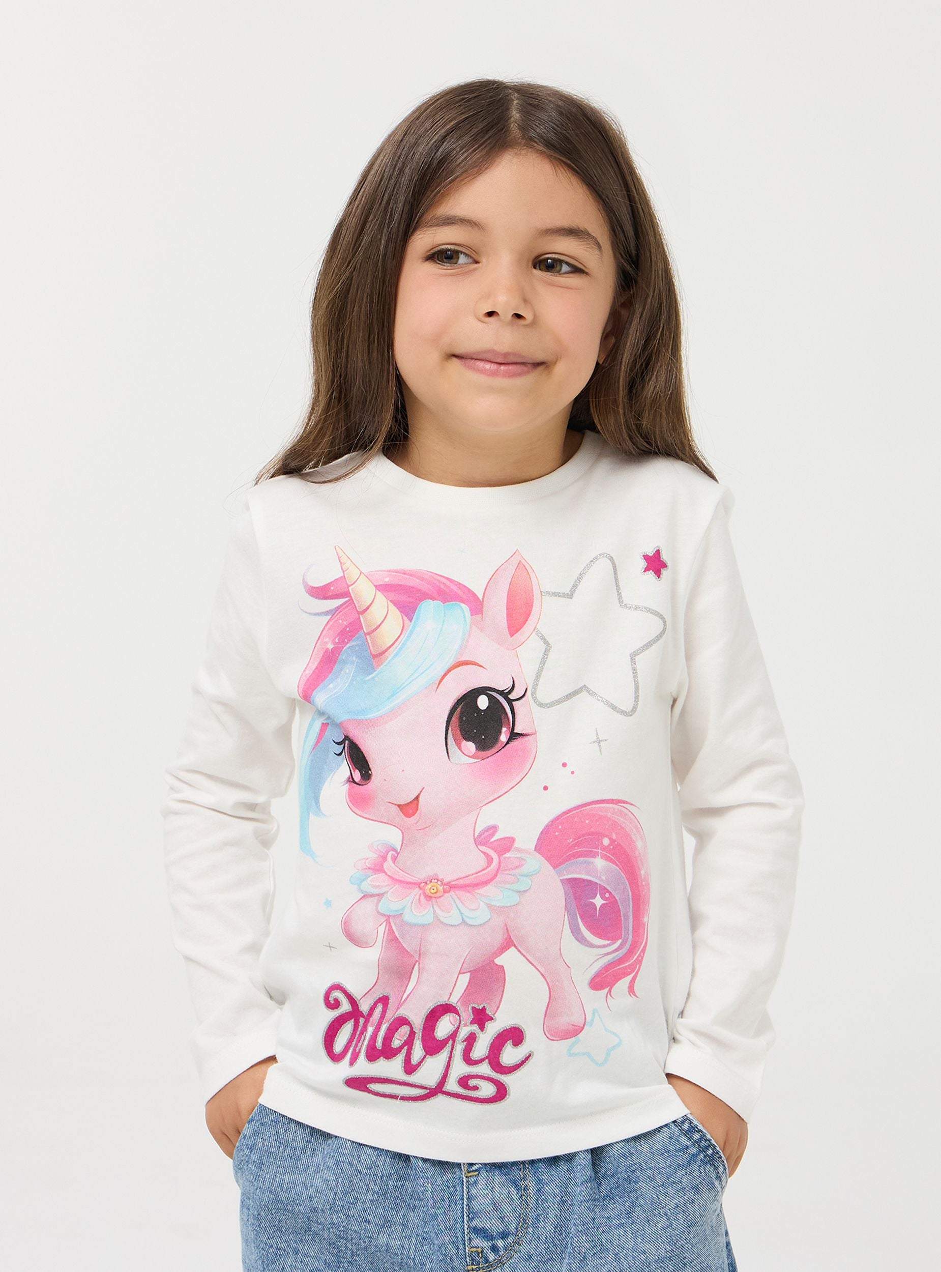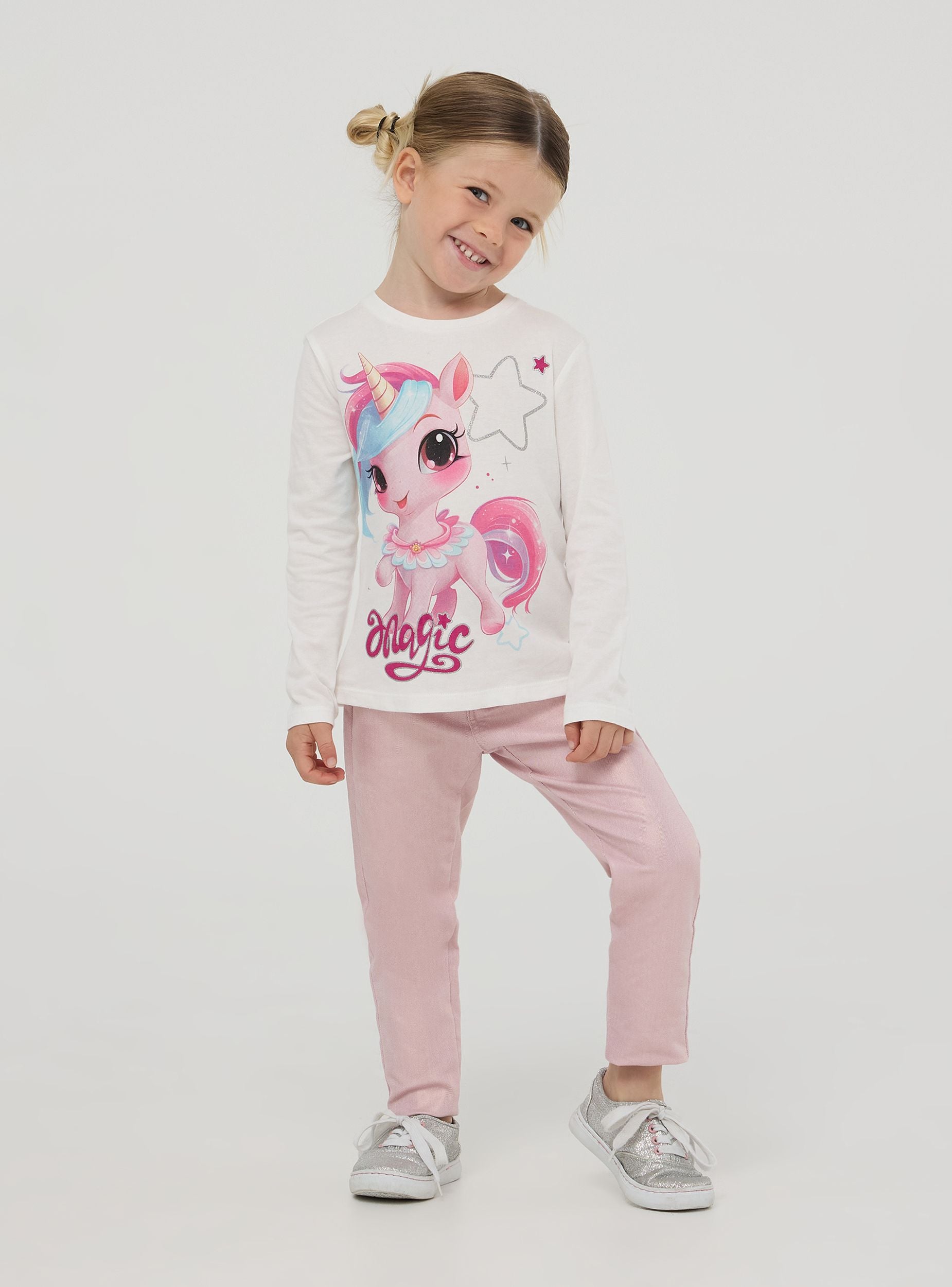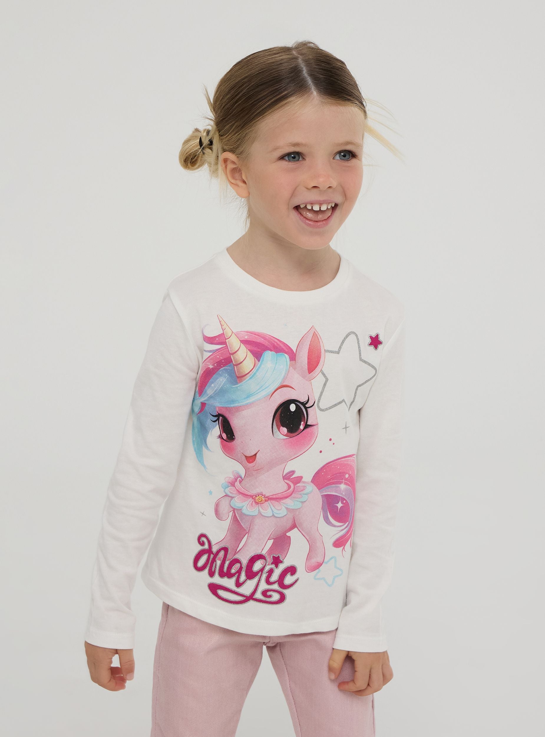 Bluză pentru fetițe cu mâneci lungi și decolteu rotund, caracterizată printr-un imprimeu frontal viu cu un unicorn cu sclipici, care adaugă o notă magică ținutei. Croiala este comodă, ideală pentru activitățile zilnice și pentru a asigura un confort maxim. Perfectă pentru un look casual, această bluză poate fi asortată cu blugi, pantaloni sau fuste pentru a crea o ținută distractivă și la modă.Detalii
