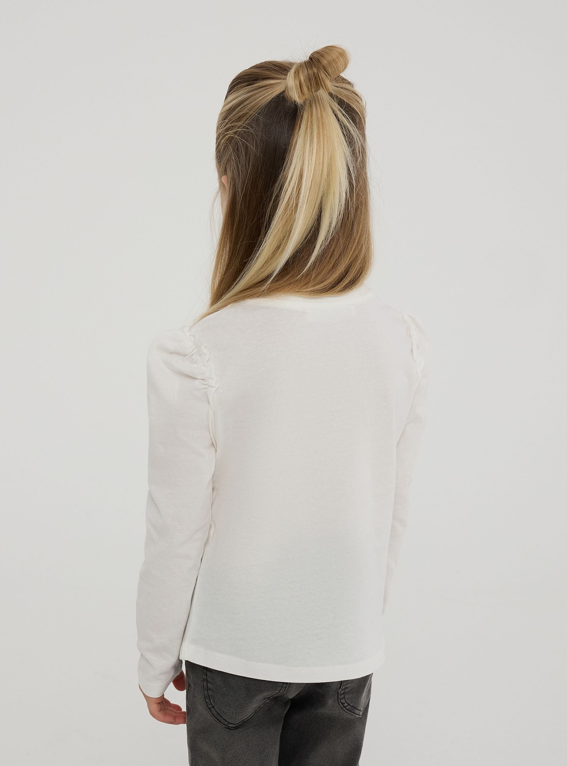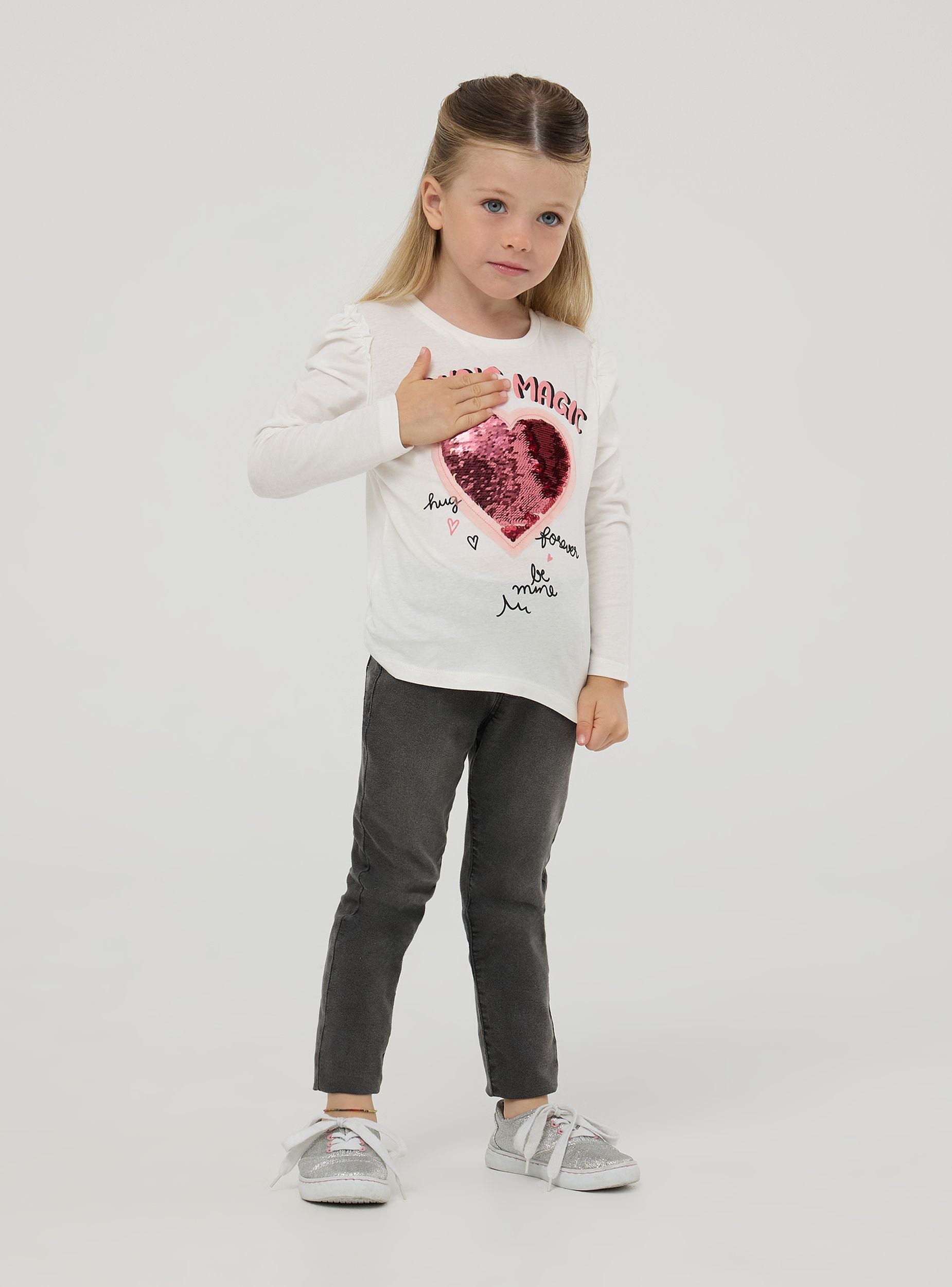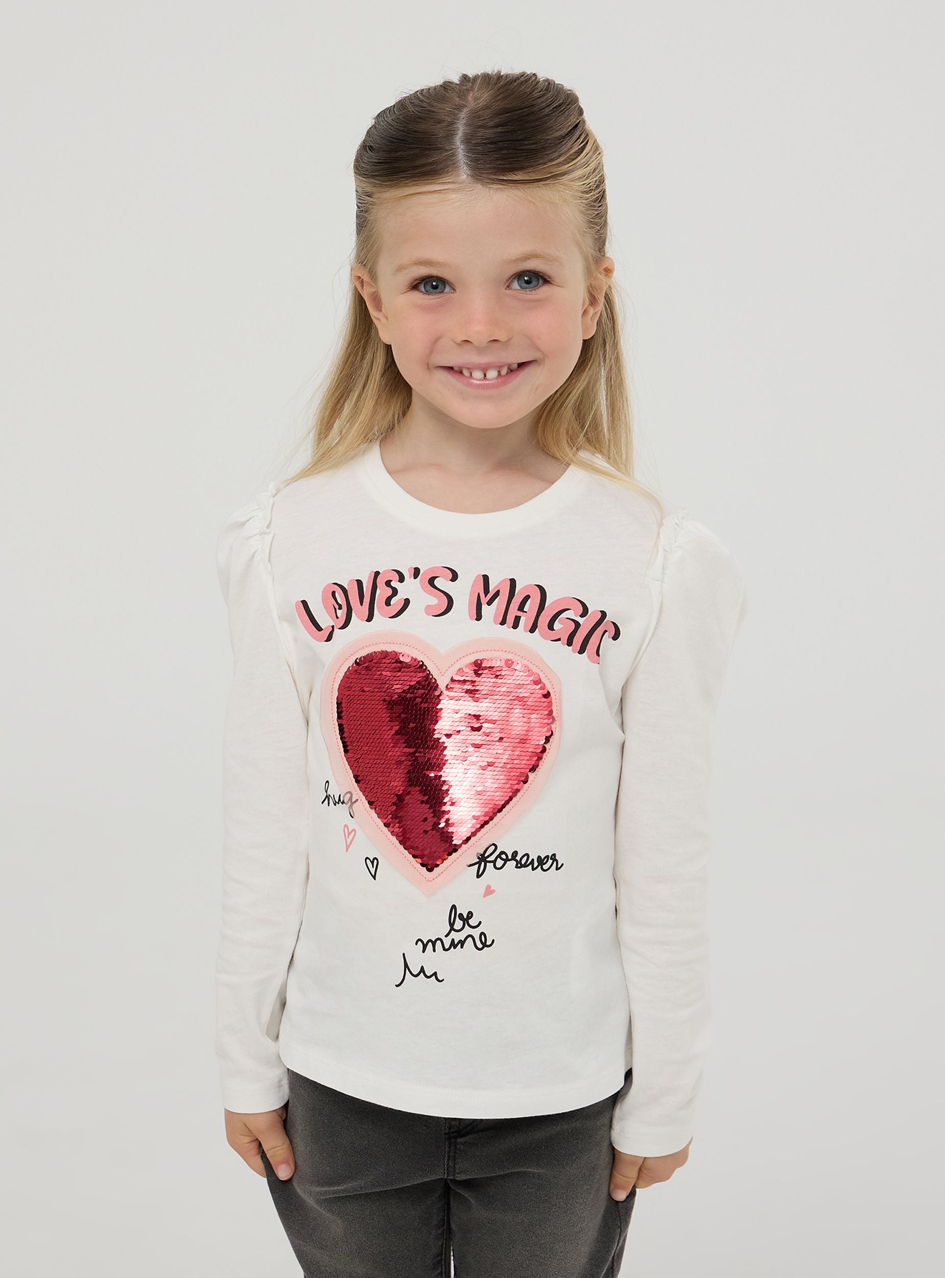 Bluză pentru fetițe cu mâneci lungi și detalii cu volane și strângere pe umeri, caracterizată printr-un text și o inimă mare din paiete reversibile care își schimbă culoarea când treci mâna peste ele, oferind un efect magic și distractiv. Ideală pentru ocazii casual și zilnice, timpul liber și ieșirile cu prietenii. Se potrivește ușor cu blugi, colanți sau fuste pentru un look la modă și confortabil.Detalii