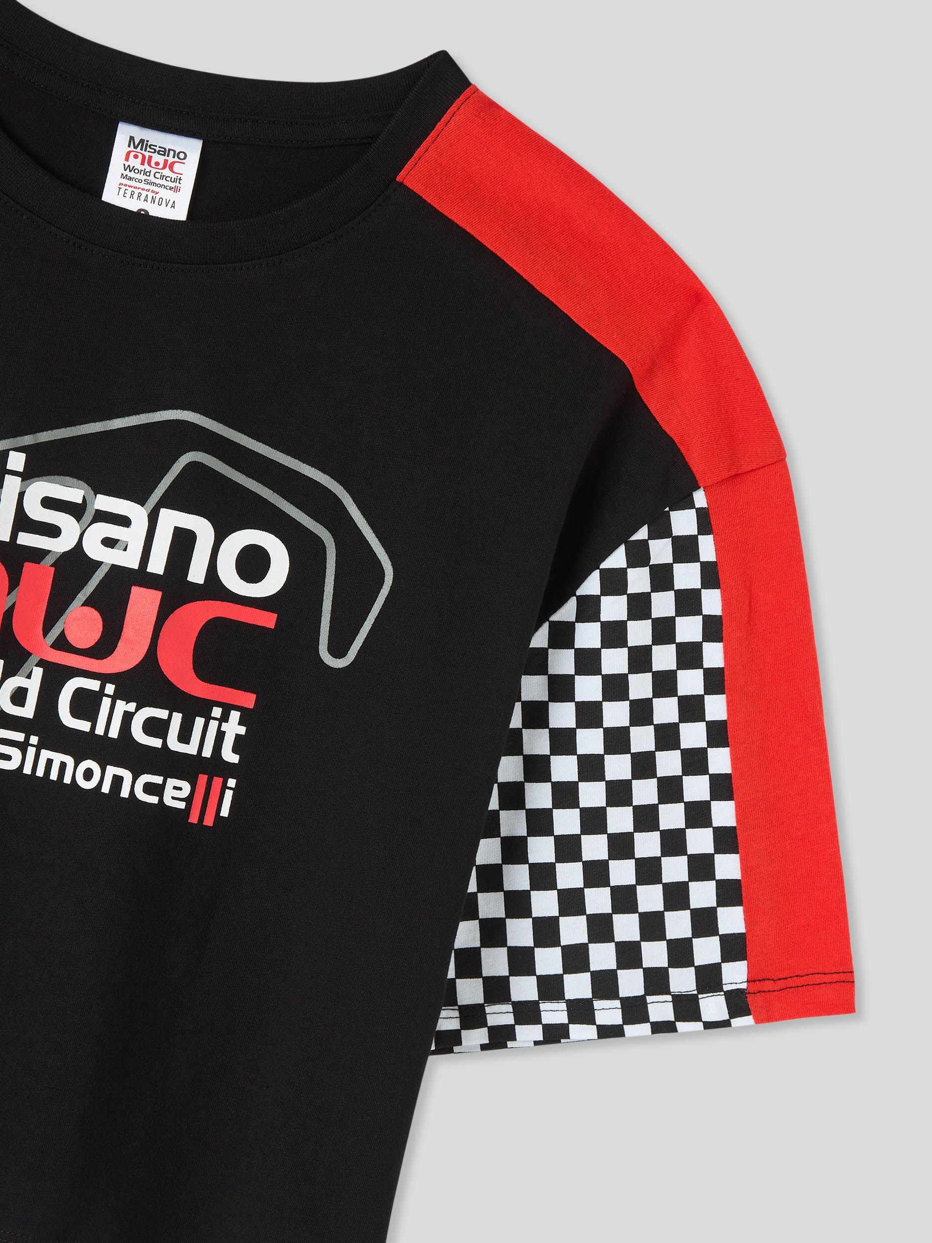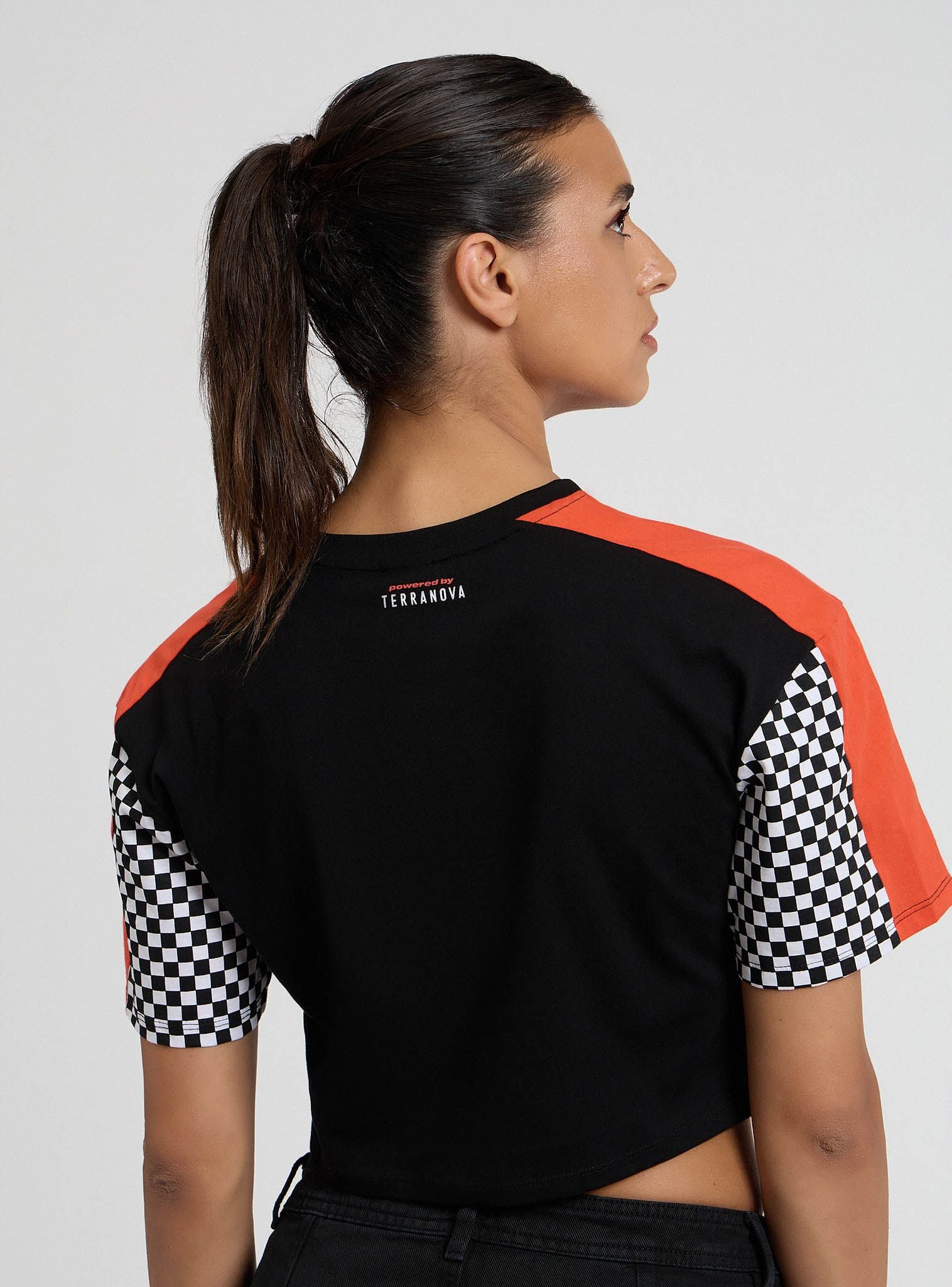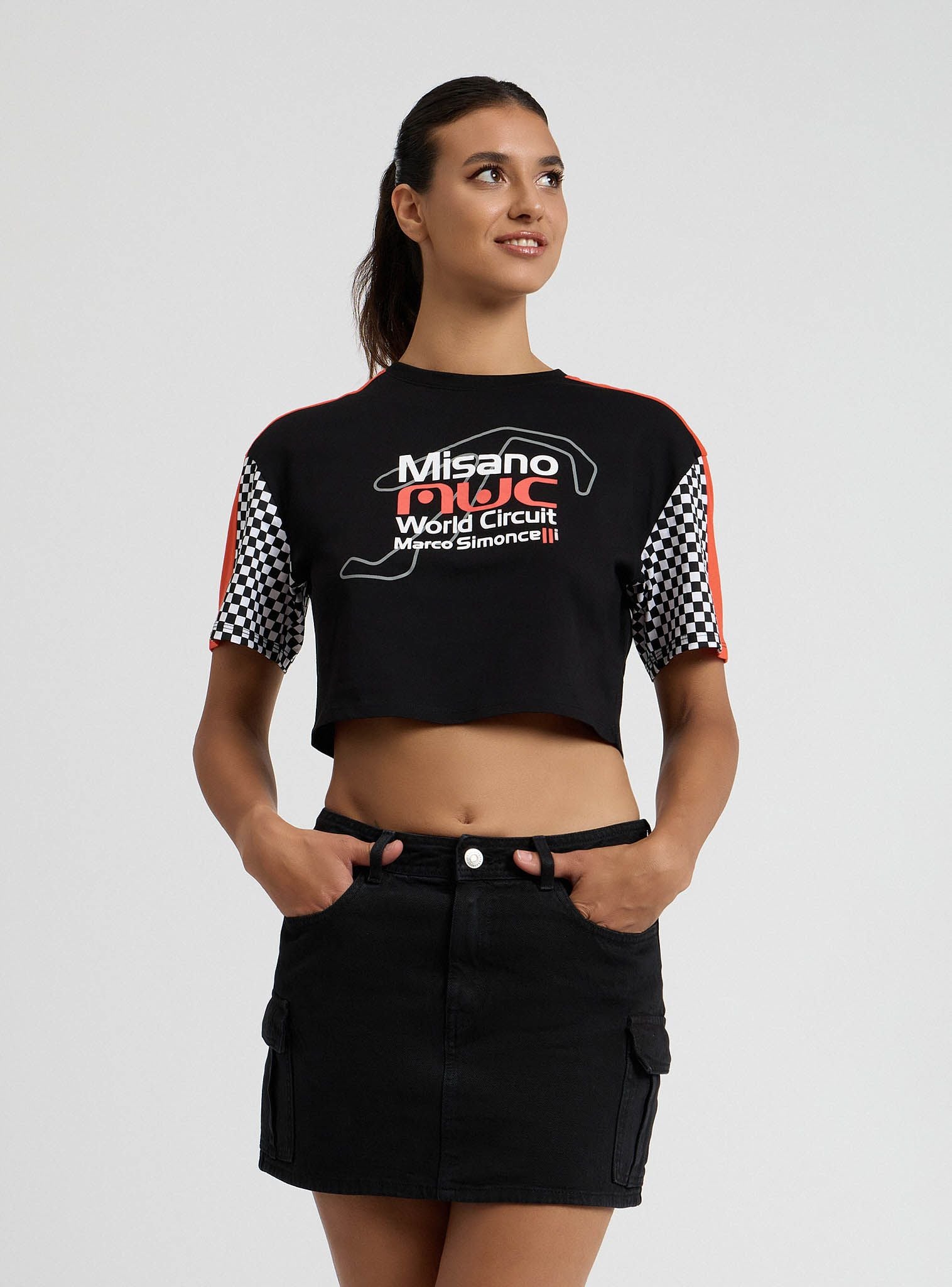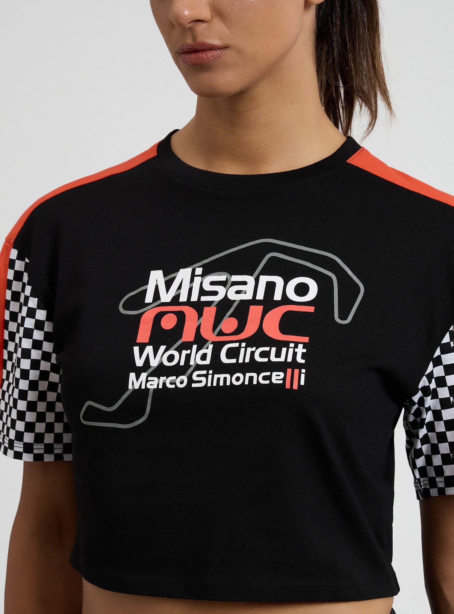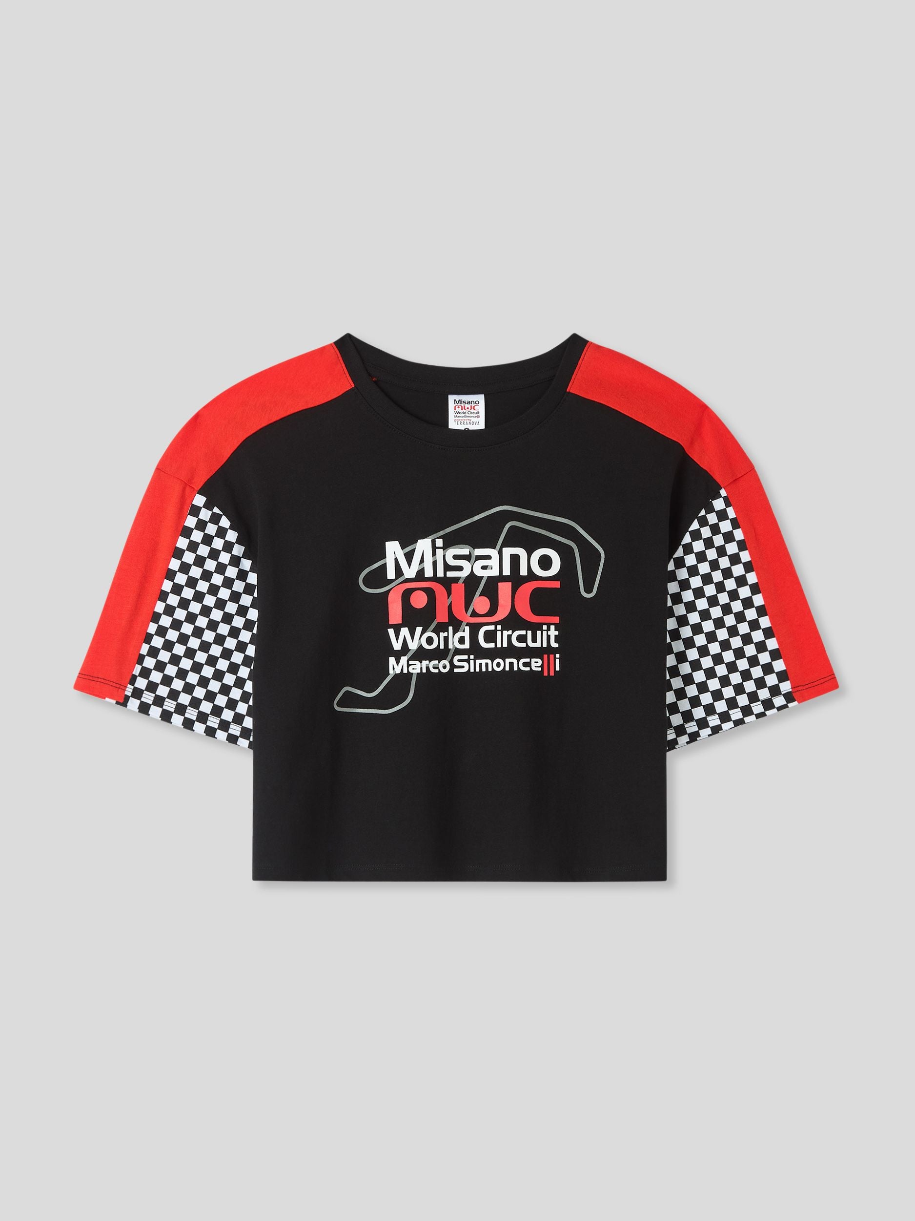 Tricou de damă cu imprimeu Misano World Circuit în față, perfect pentru cei care iubesc un look sportiv și plin de energie. Acest model este caracterizat de mâneci în contrast cu efect block color pe umeri, adăugând o notă dinamică și modernă designului, și un imprimeu cu steagul de start în carouri, evocând atmosfera curselor auto. Croiala este crop, garantând confort și stil în orice ocazie.Detalii