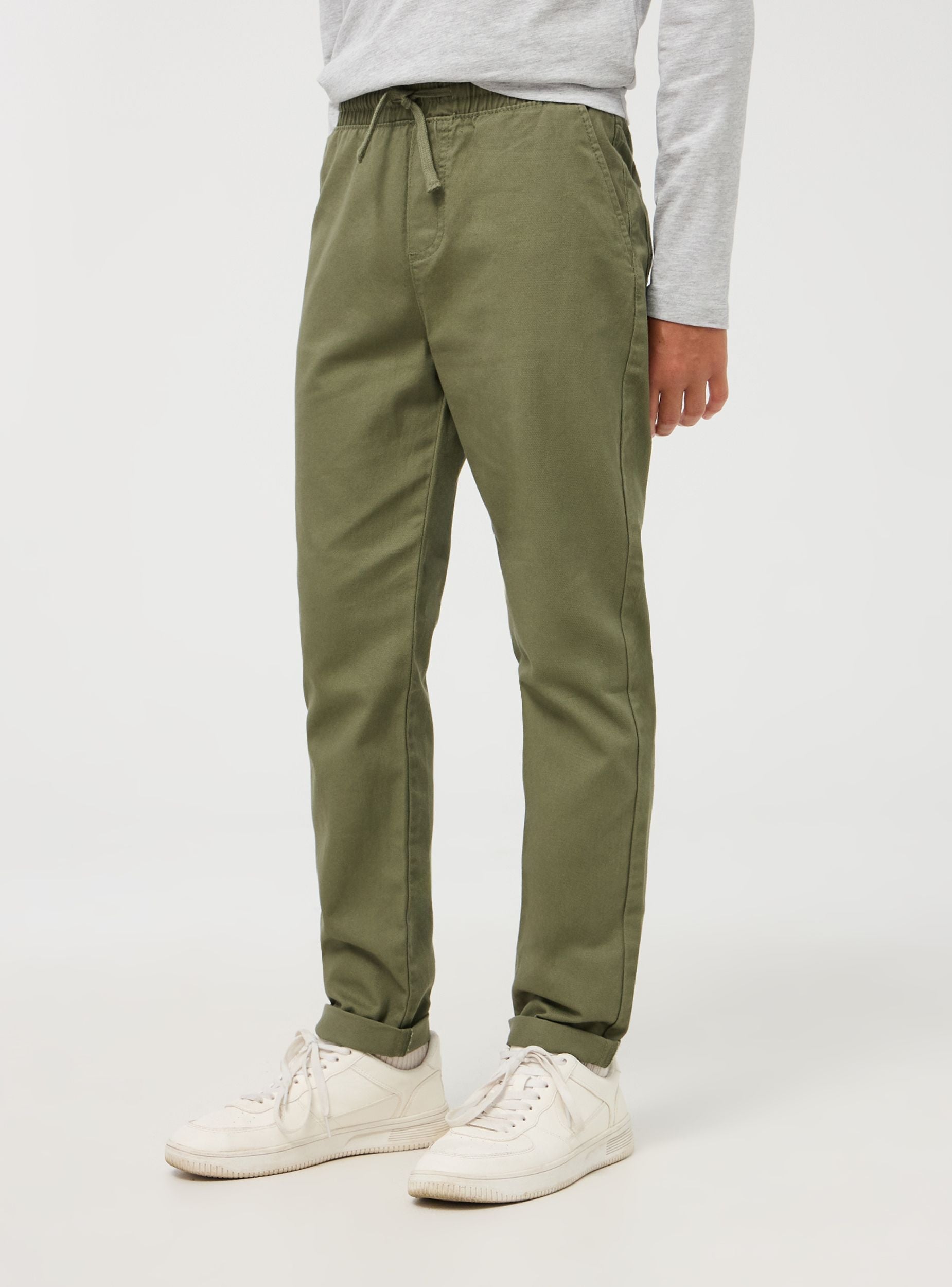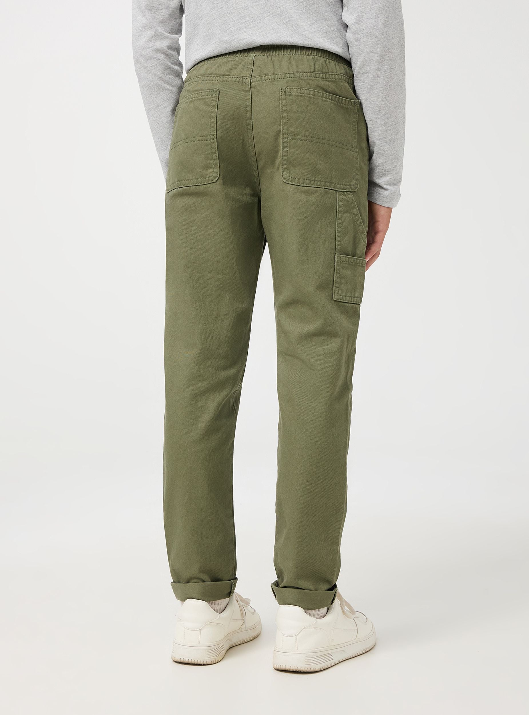 Детские брюки с боковым карманом типа carpenter. Дизайн включает в себя эластичный пояс с шнурком для удобной и регулируемой посадки. Карманы присутствуют как спереди, так и сзади, включая боковой карман carpenter. Брюки предлагают практичный и современный вид, идеально подходящий для активных и динамичных детей.