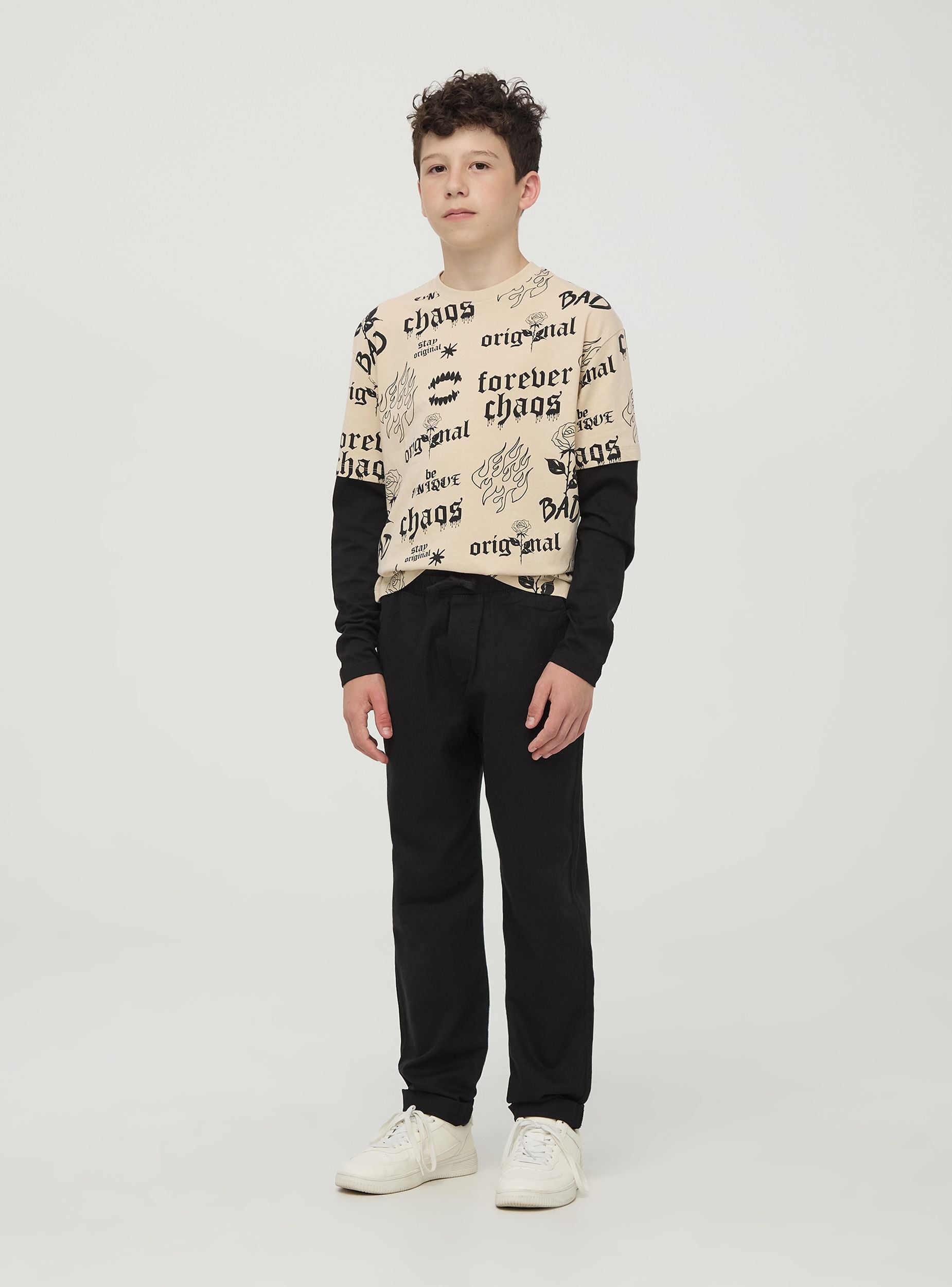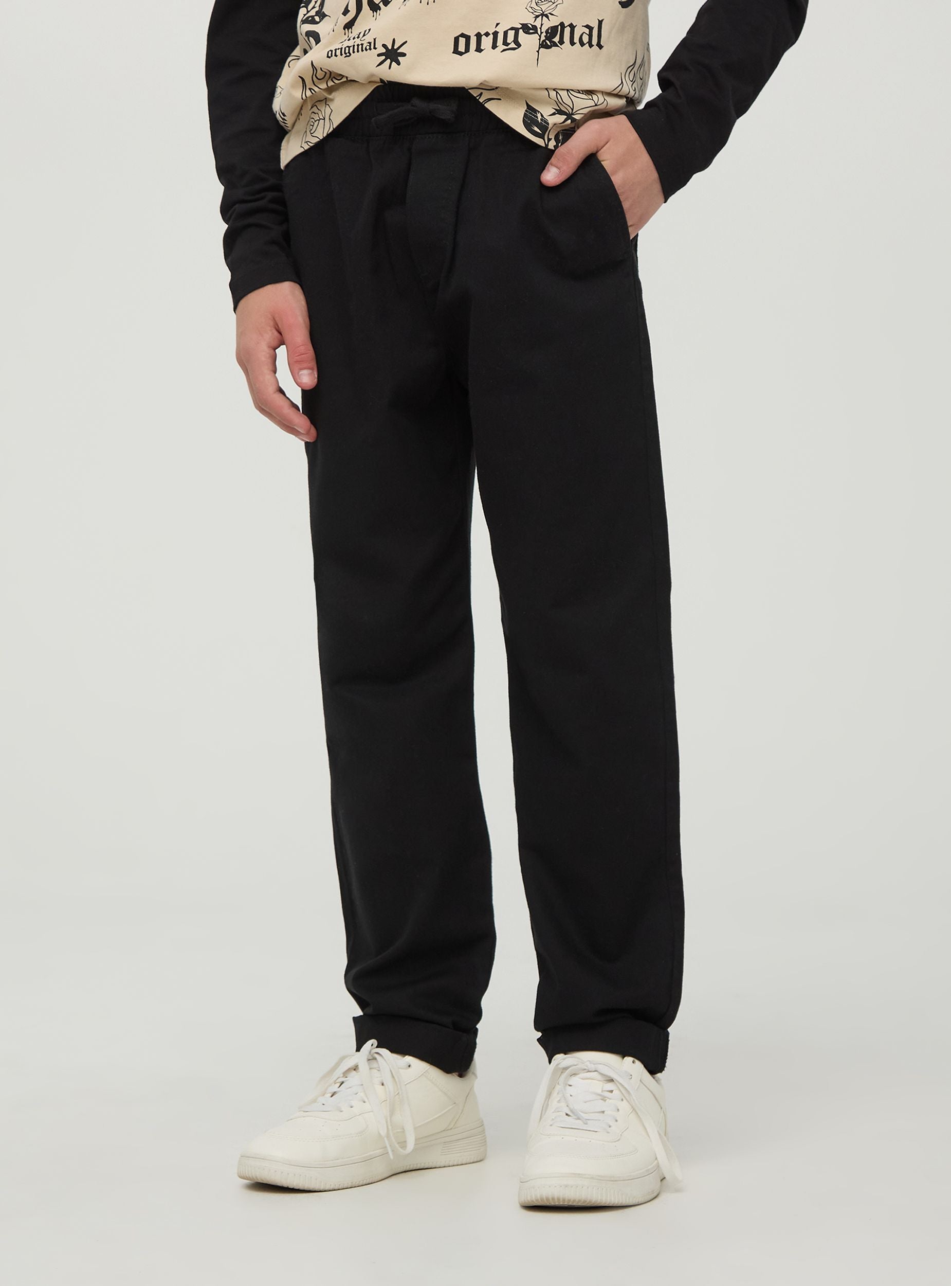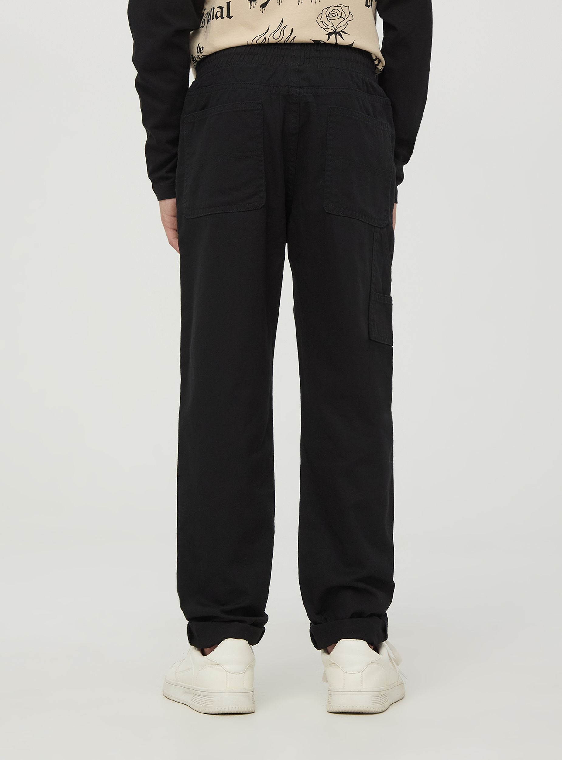 Детские брюки с боковым карманом типа carpenter. Дизайн включает в себя эластичный пояс с шнурком для удобной и регулируемой посадки. Карманы расположены как спереди, так и сзади, включая боковой карман carpenter. Брюки предлагают практичный и современный вид, идеально подходящий для активных и динамичных детей.Детали