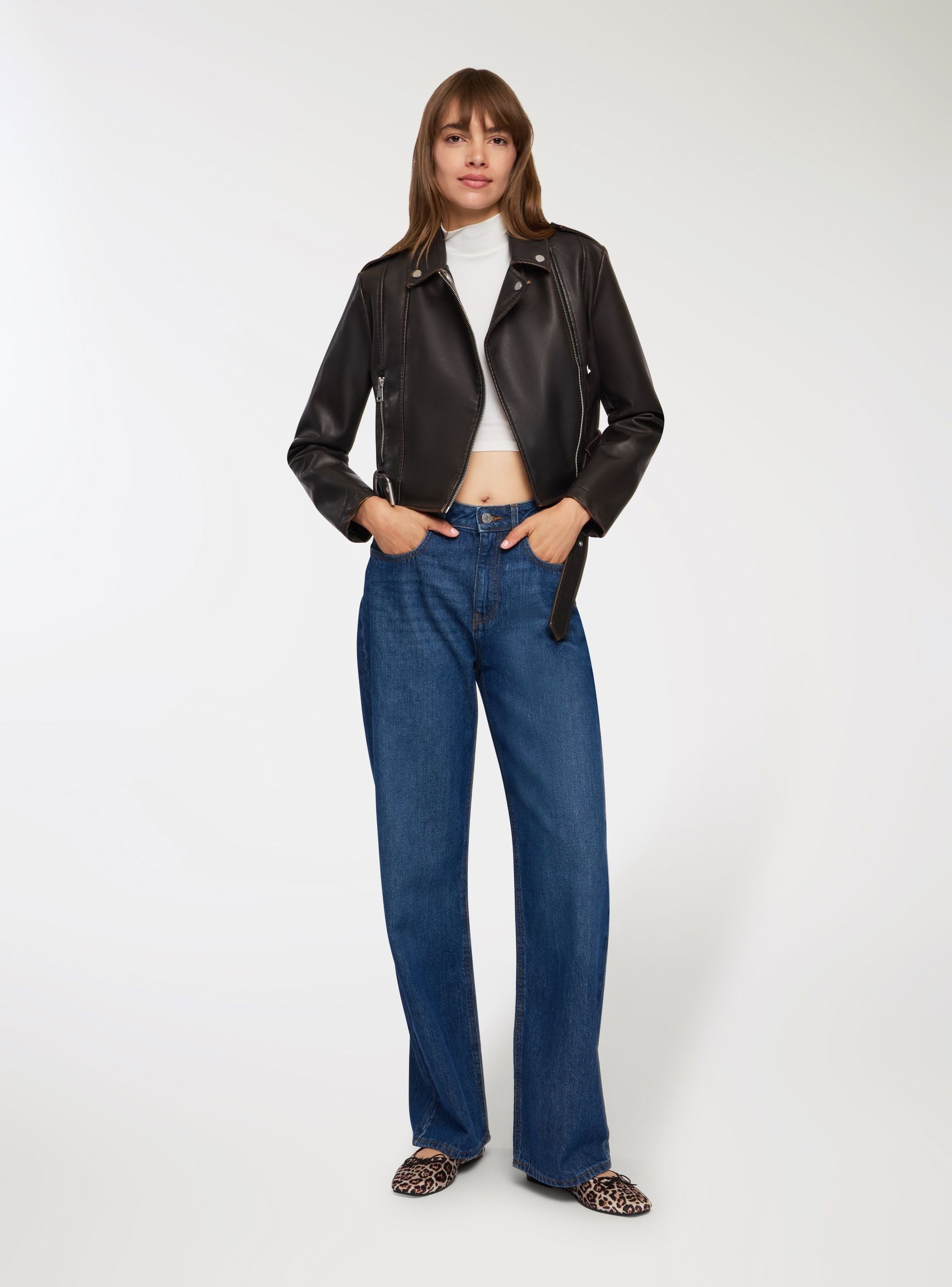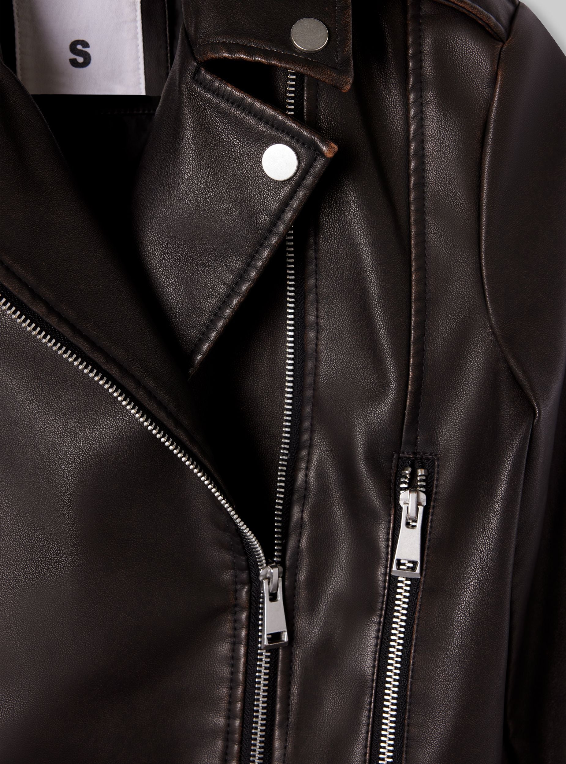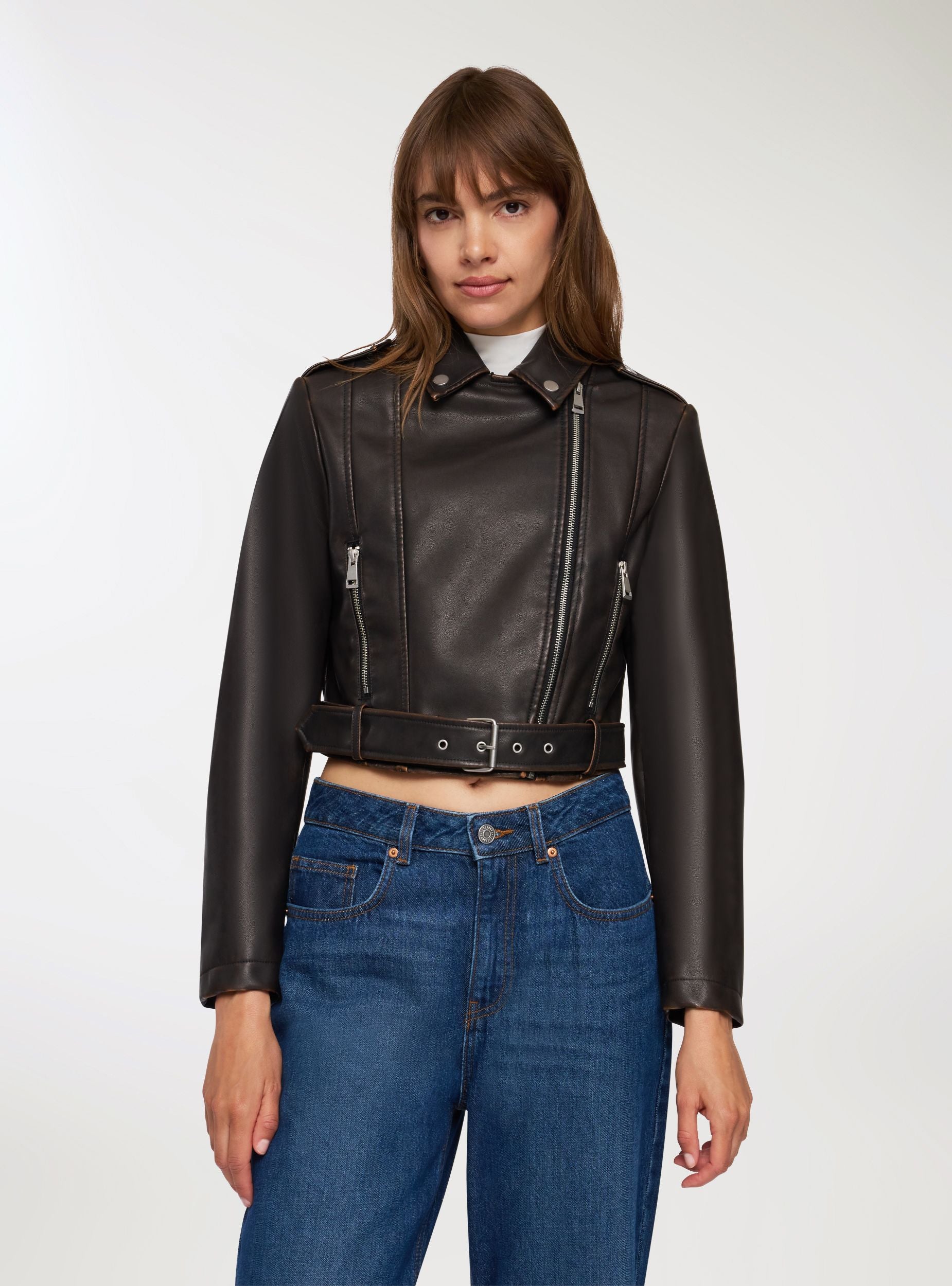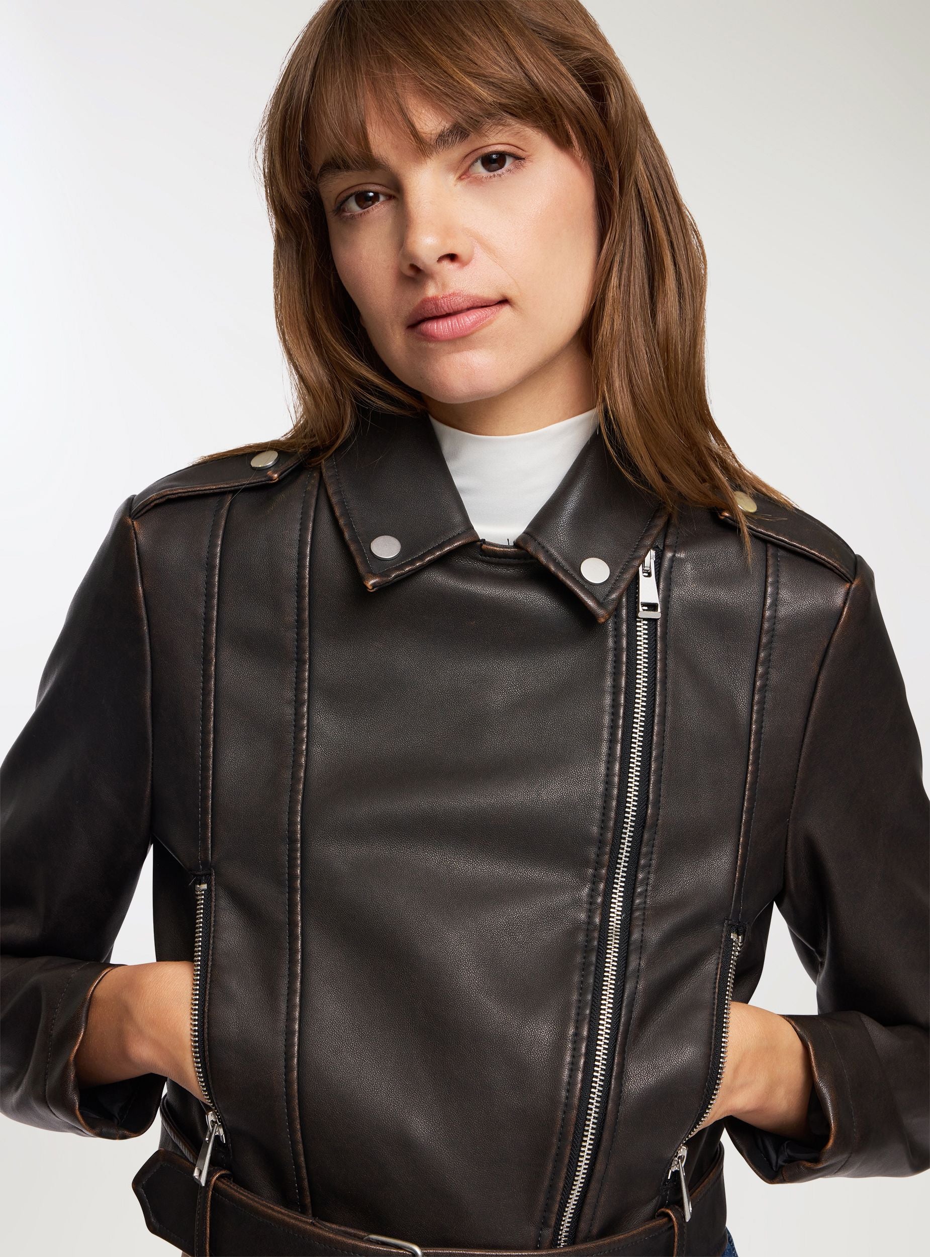 Женская куртка, модель "кожанка" из искусственной кожи с винтажным эффектом, с длинными рукавами, диагональной молнией и воротником с лацканами на кнопках. Пояс на нижней части позволяет регулировать посадку и добавляет дерзкую деталь, в то время как карманы на молнии завершают дизайн с ярким характером. Идеально подходит как для дневного, так и для вечернего образа, придавая урбанистический и современный стиль любому наряду.Детали