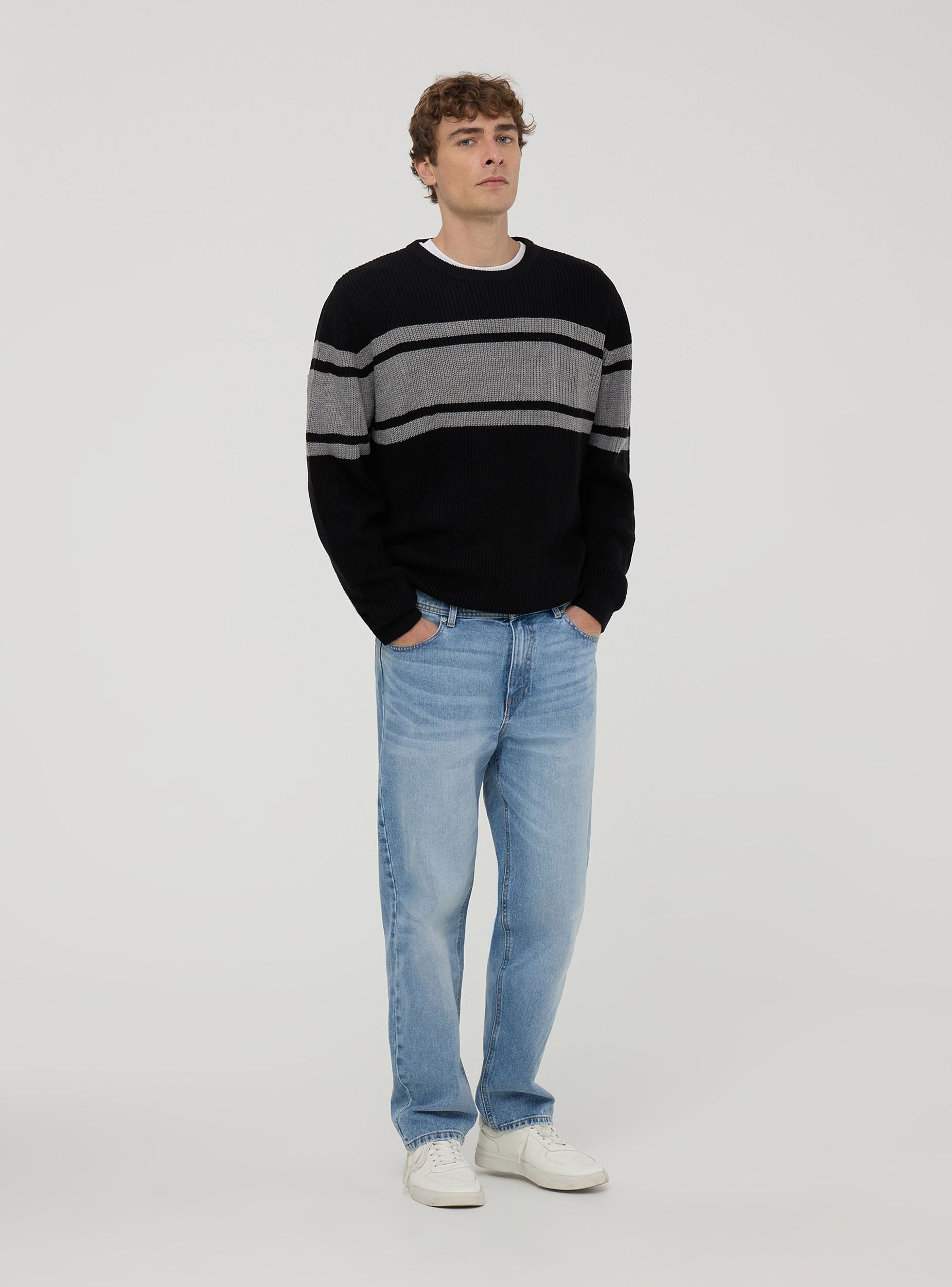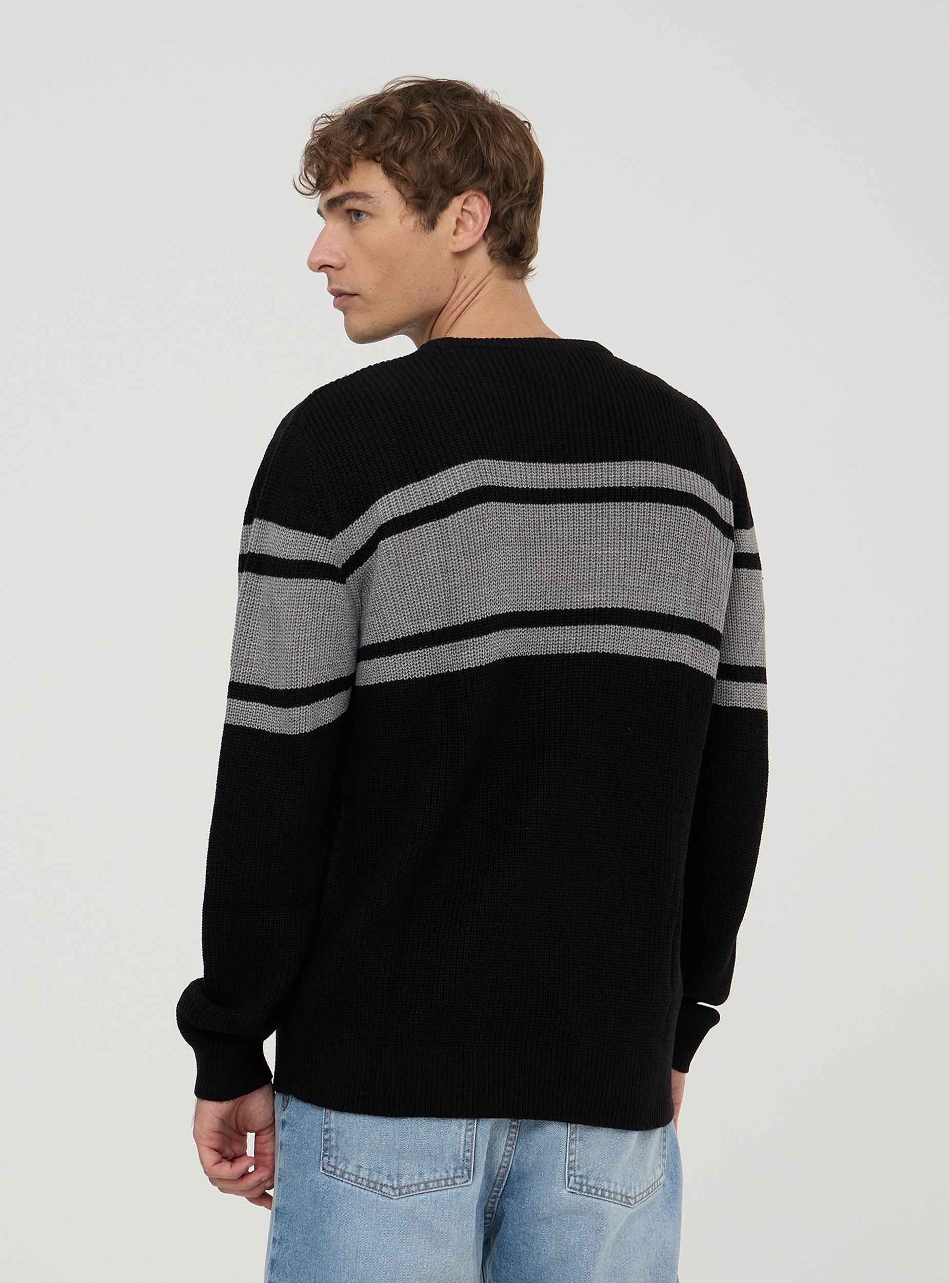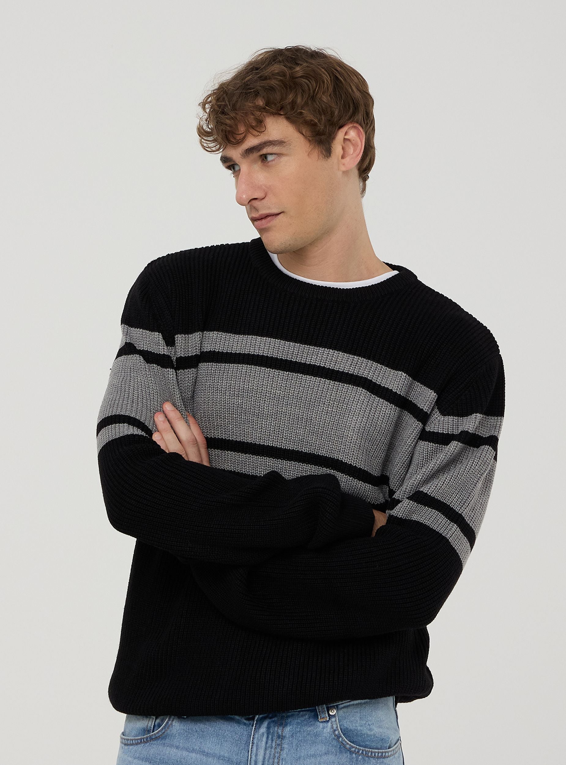 Мужской тяжелый свитер с цветными блоками. Имеет прямой крой с круглым вырезом и длинными рукавами. Тело свитера украшено горизонтальными полосами различных размеров и цветов, создающими современный и динамичный эффект. Широкие полосы расположены в центре груди, в то время как более тонкие находятся выше и ниже центральной полосы. Манжеты, нижний край и воротник выполнены в рубчик для лучшего комфорта и посадки. Подходит для зимнего сезона, сочетает стиль и функциональность для непринужденного, но ухоженного образа.Детали