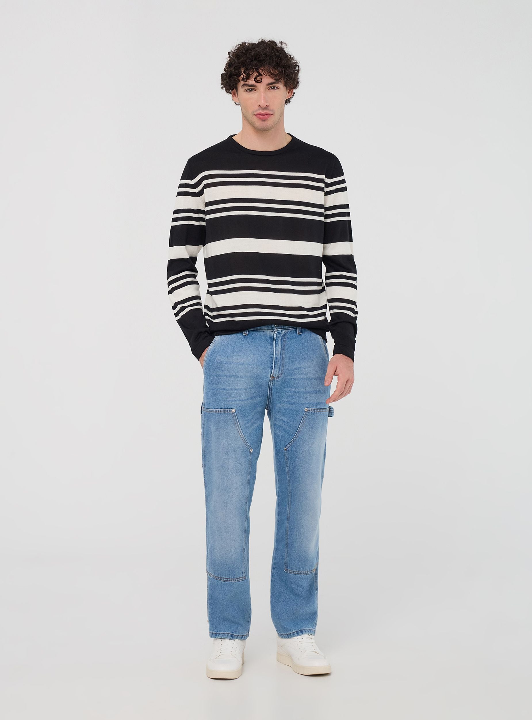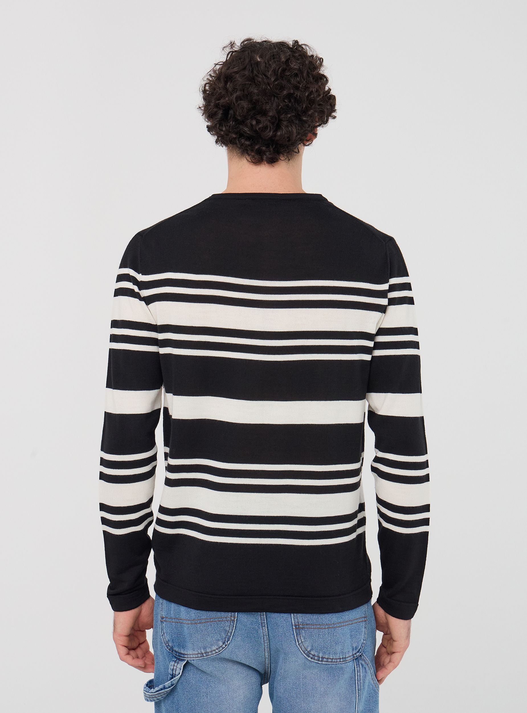 Мужская футболка с длинными рукавами, украшенная горизонтальными полосами различных размеров, проходящими по всей поверхности изделия. Дизайн включает круглый вырез и мягкий крой, который обеспечивает свободную и комфортную посадку. Эта вещь идеально подходит для повседневной одежды, сочетая комфорт и стиль.