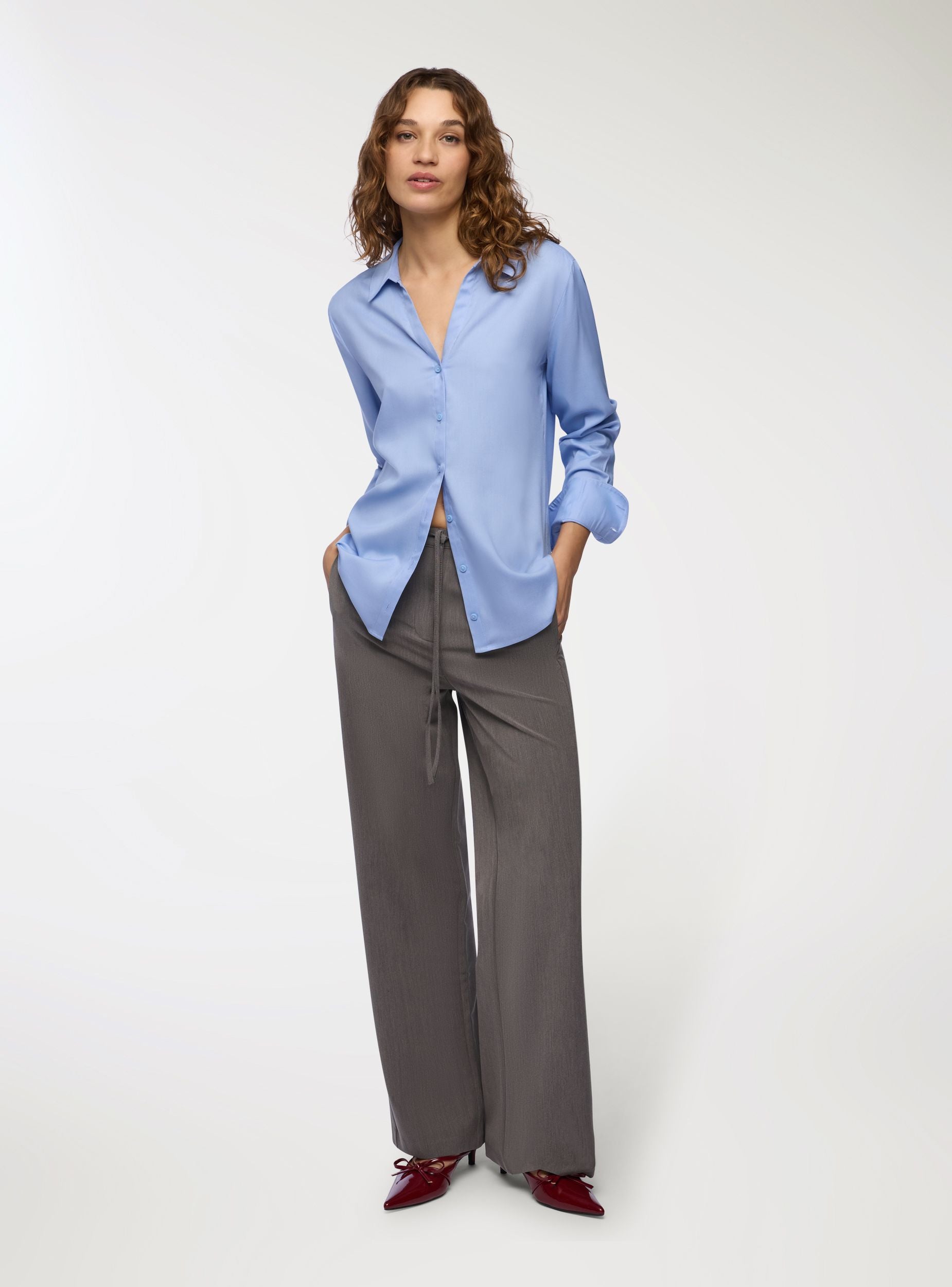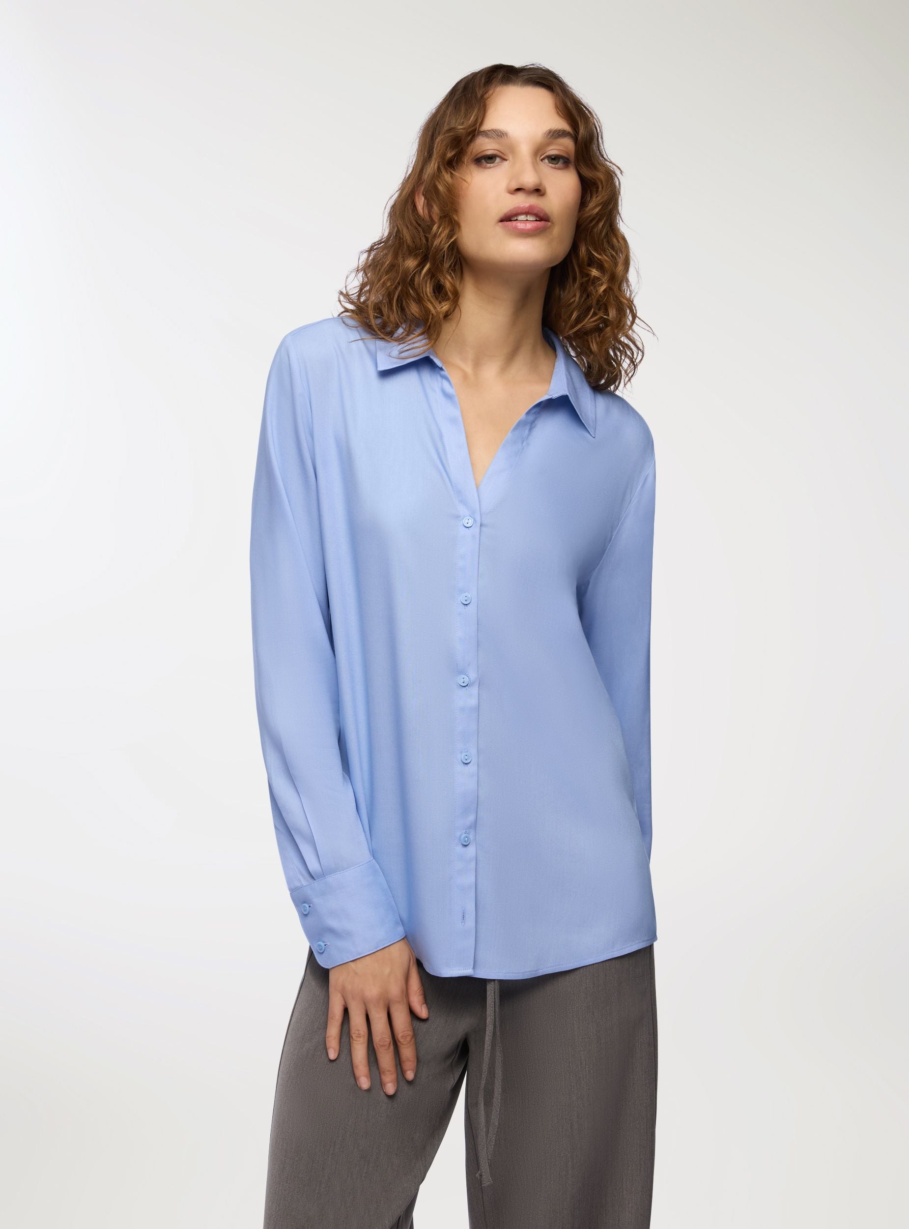 Женская рубашка с длинными рукавами и однотонным дизайном. Оснащена открытым воротником и застежкой на пуговицы спереди, эта рубашка предлагает универсальный стиль, подходящий для различных случаев. Стандартный крой обеспечивает комфорт и свободу движений, делая её идеальной для профессионального или повседневного образа. Идеально сочетается с элегантными брюками или джинсами для сбалансированного и изысканного наряда.Детали
