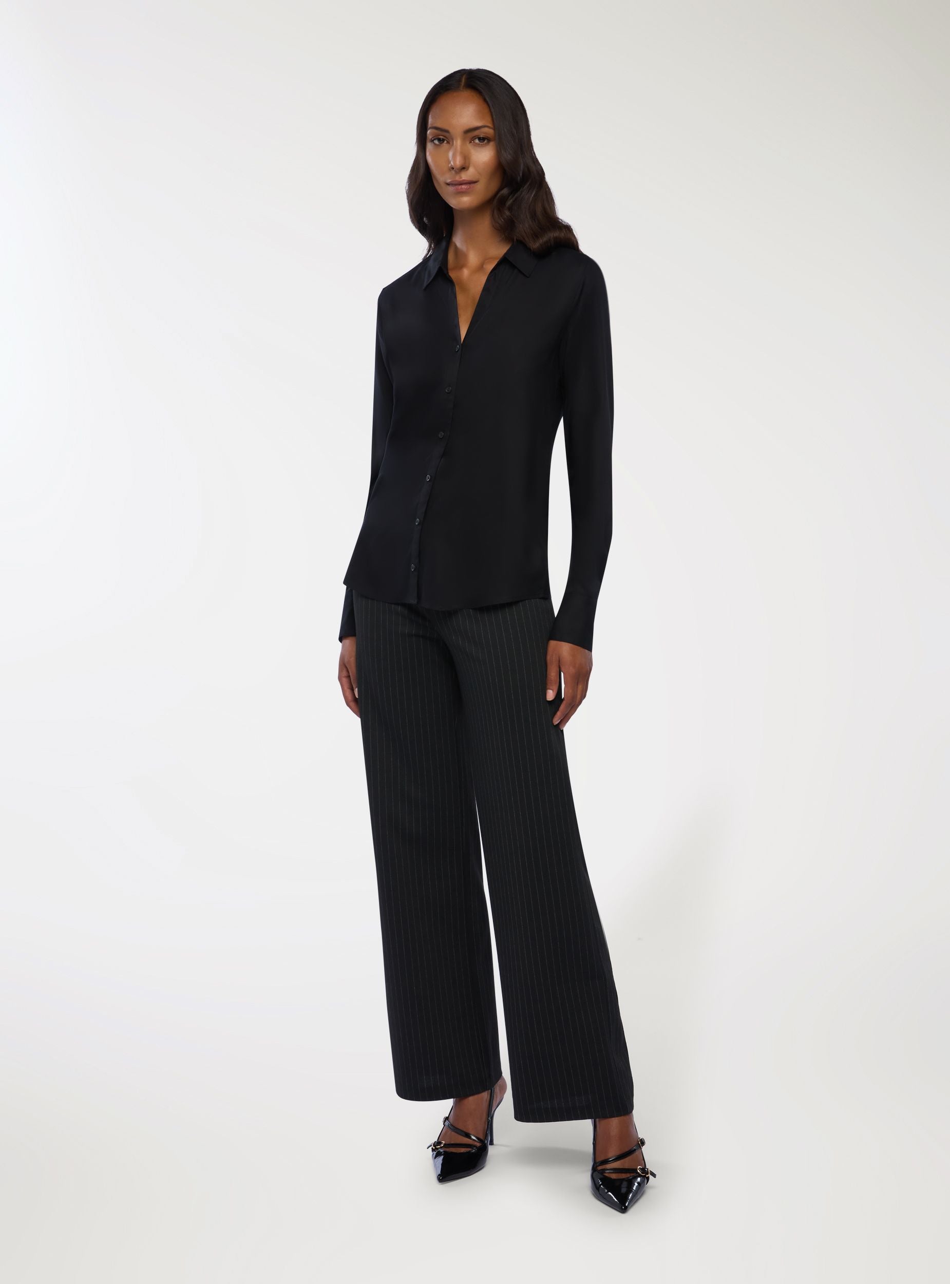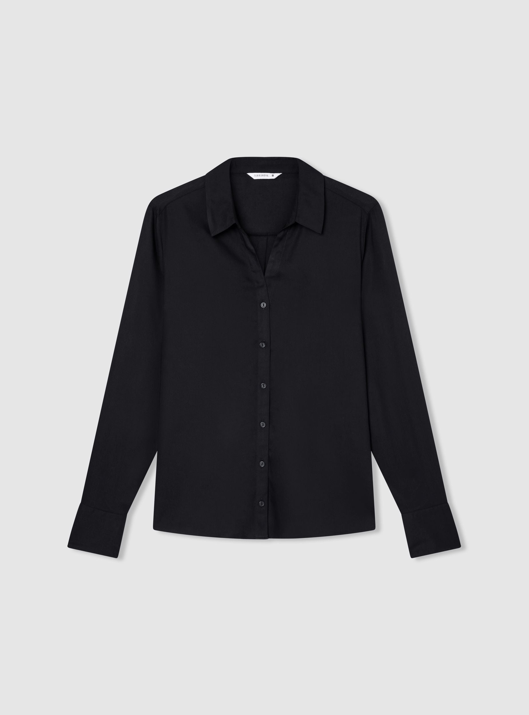 Женская рубашка с длинными рукавами однотонного дизайна. Оснащена открытым воротником и застёжкой на пуговицы спереди, эта рубашка предлагает универсальный стиль, подходящий для различных случаев. Стандартный крой обеспечивает комфорт и свободу движений, делая её идеальной для профессионального или повседневного образа. Отлично сочетается с элегантными брюками или джинсами для сбалансированного и изысканного наряда.
