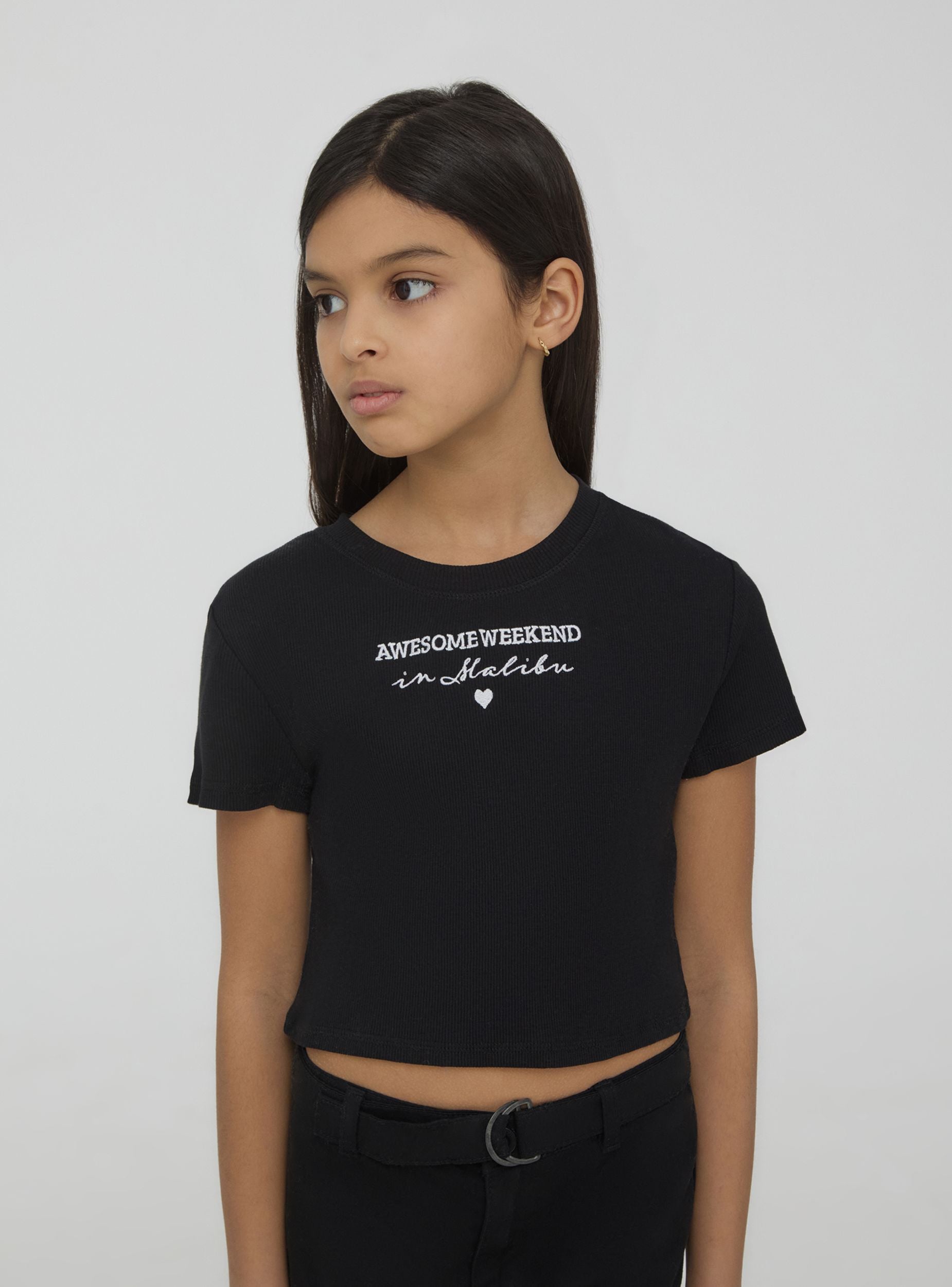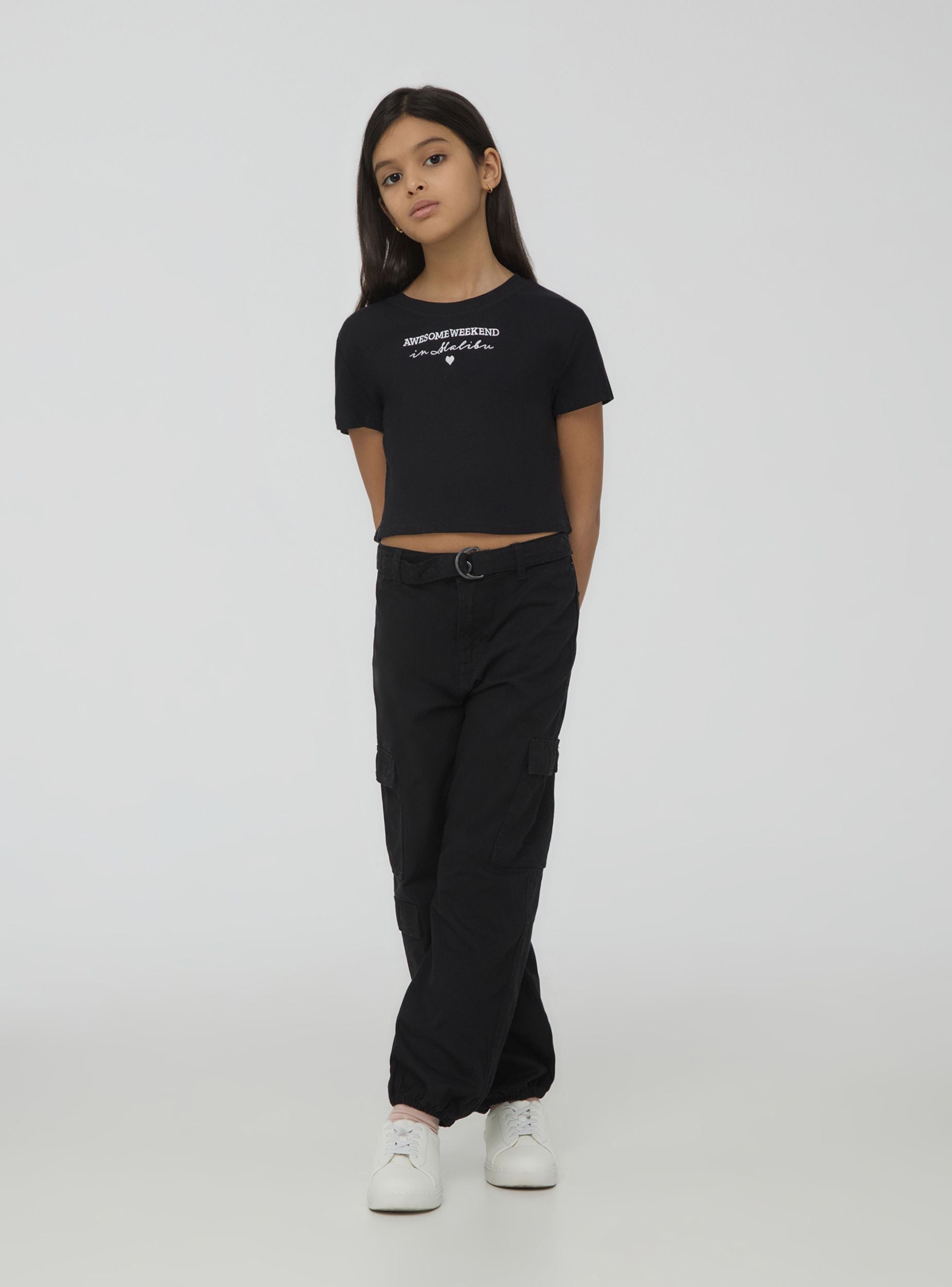 Футболка для девочек с коротким рукавом, укороченного кроя и современным дизайном. Имеет круглый вырез и декоративную надпись по центру, которая добавляет игривый и модный штрих. Идеально сочетается с джинсами, юбками или шортами для создания повседневного и стильного образа, подходящего для любого неформального случая.